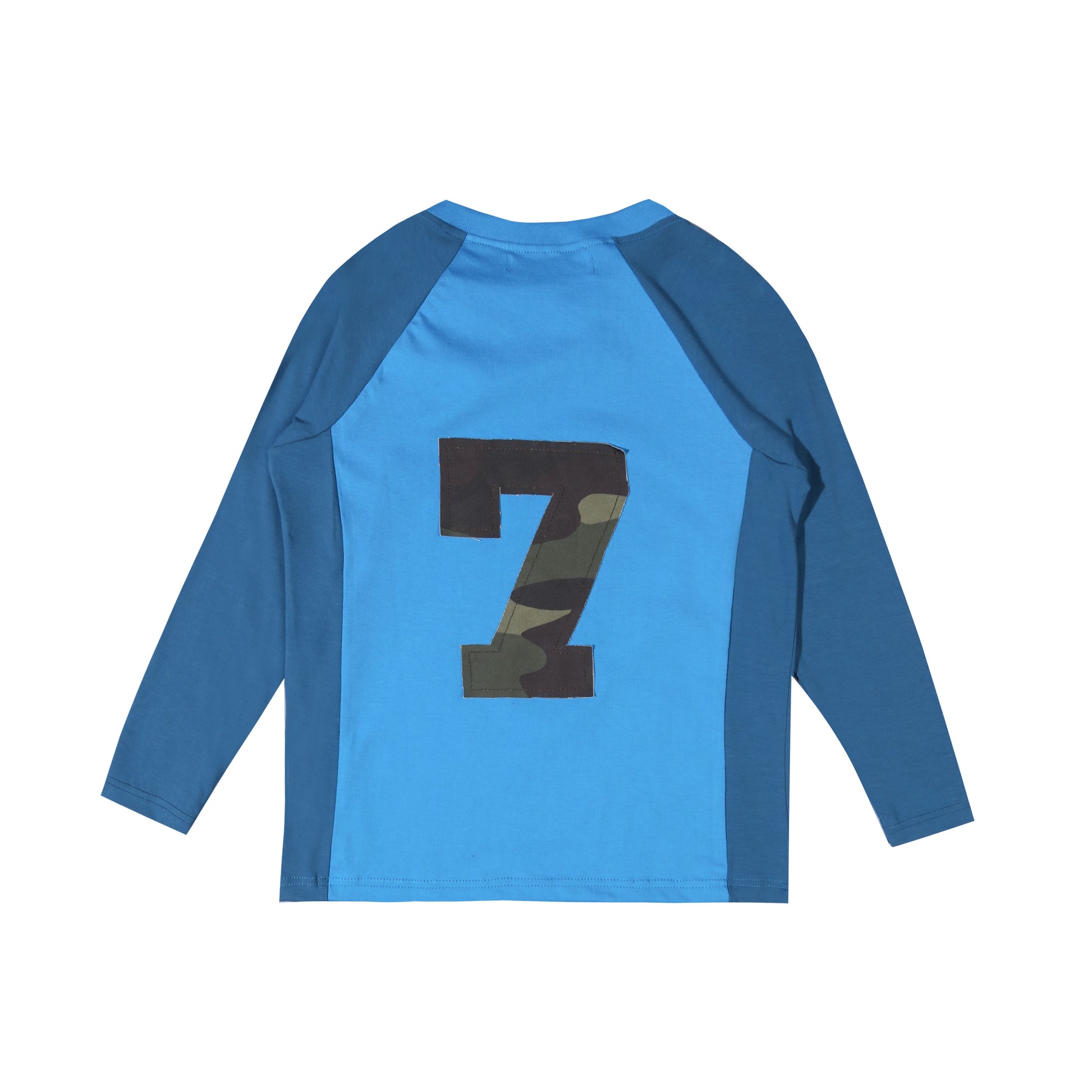 Fitted fit, semi-cropped silhouette v- neck top. Raglan cut with 3/4 sleeves. Color blocking side-front and back. 7 numbering appliqué with camo pattern unfinished hem.