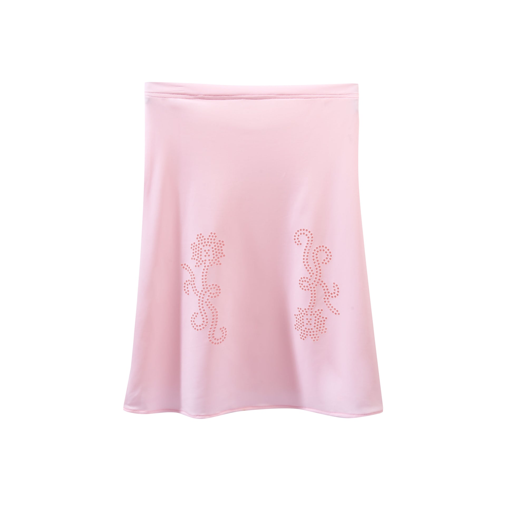 Pink skirt with laser-cut graphic detailing at the front. Mid-rise silhouette with a soft drape and straight hem. Lightweight stretch fabric.