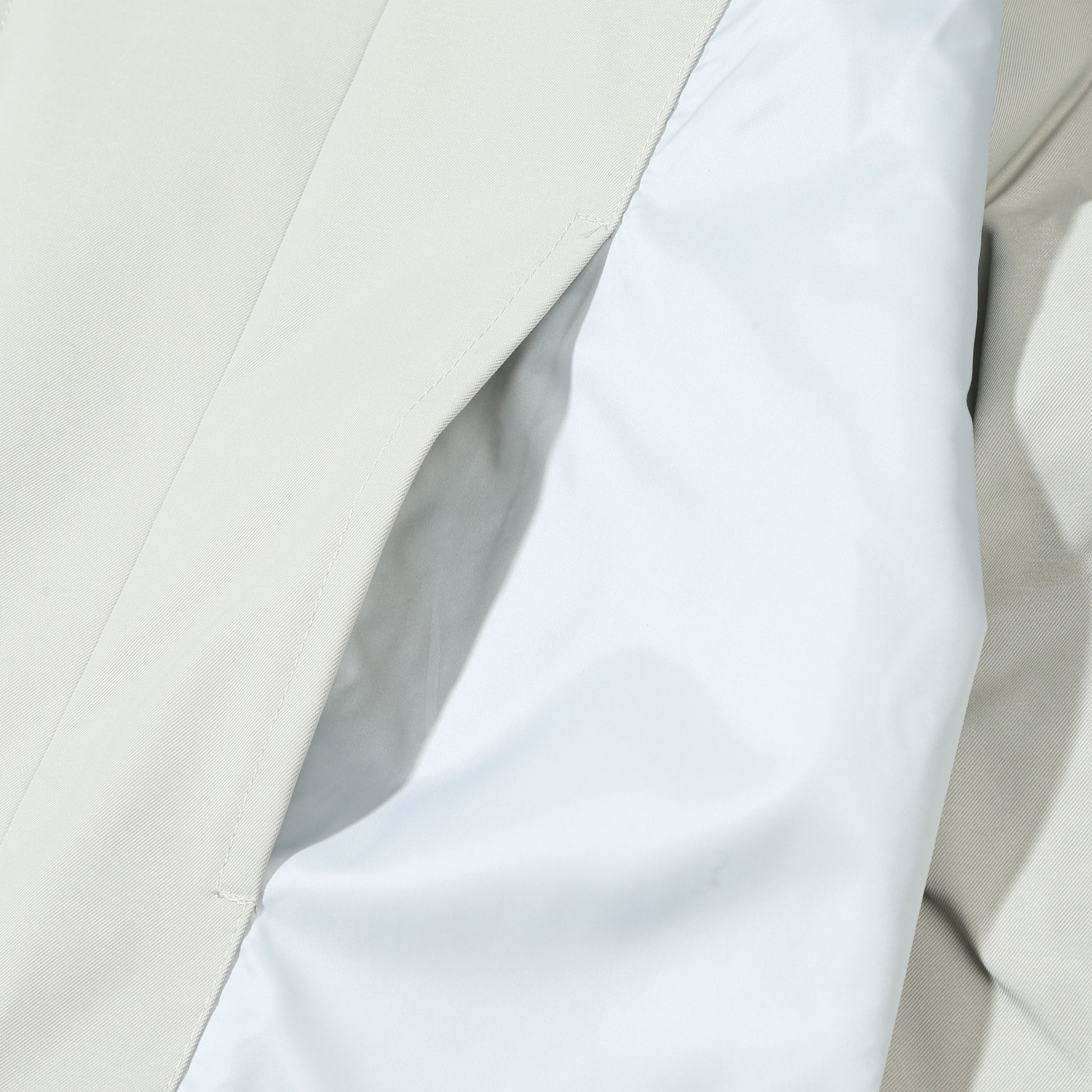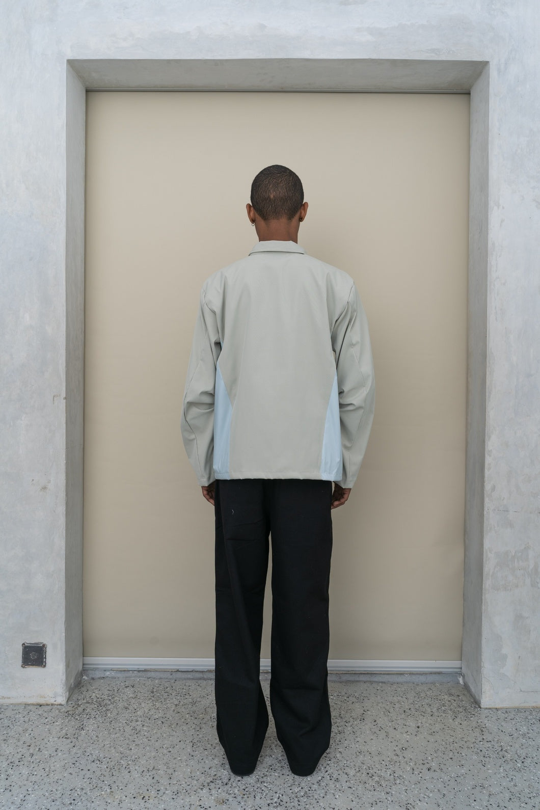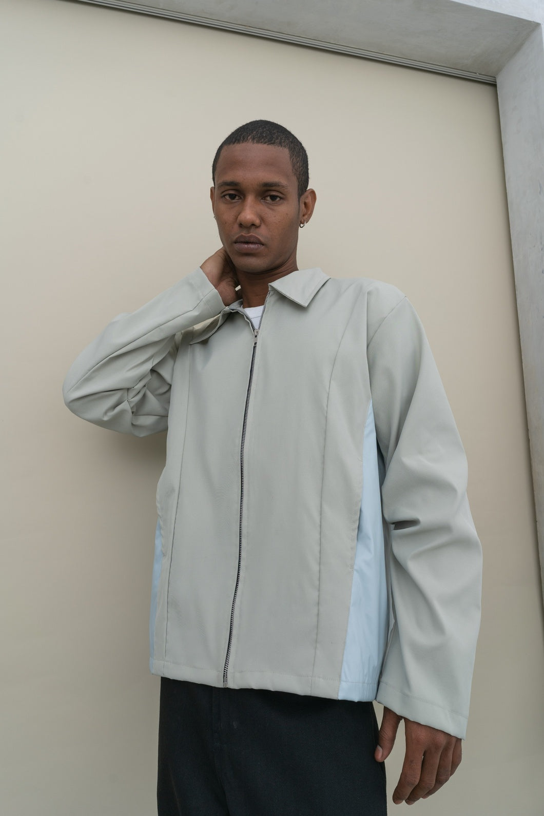 Jacket with side cut out detail featuring different type of fabric. Front zipper opening, side pocket. Ruched detail on inner arm side. Water reppelent fabric.