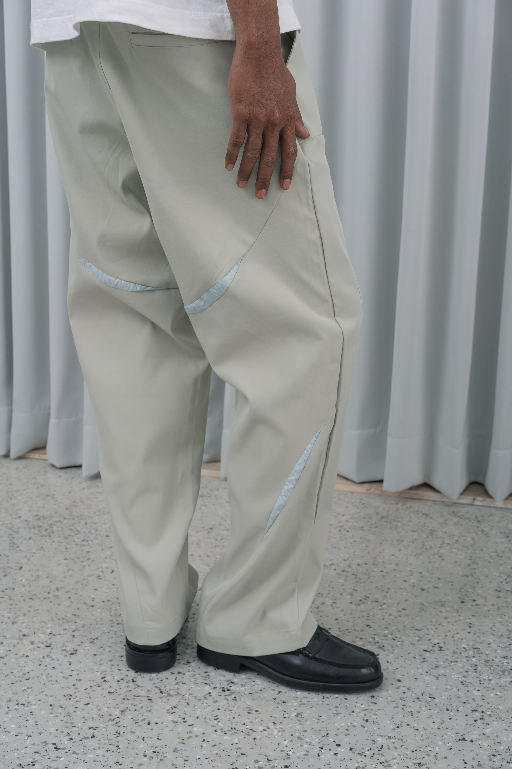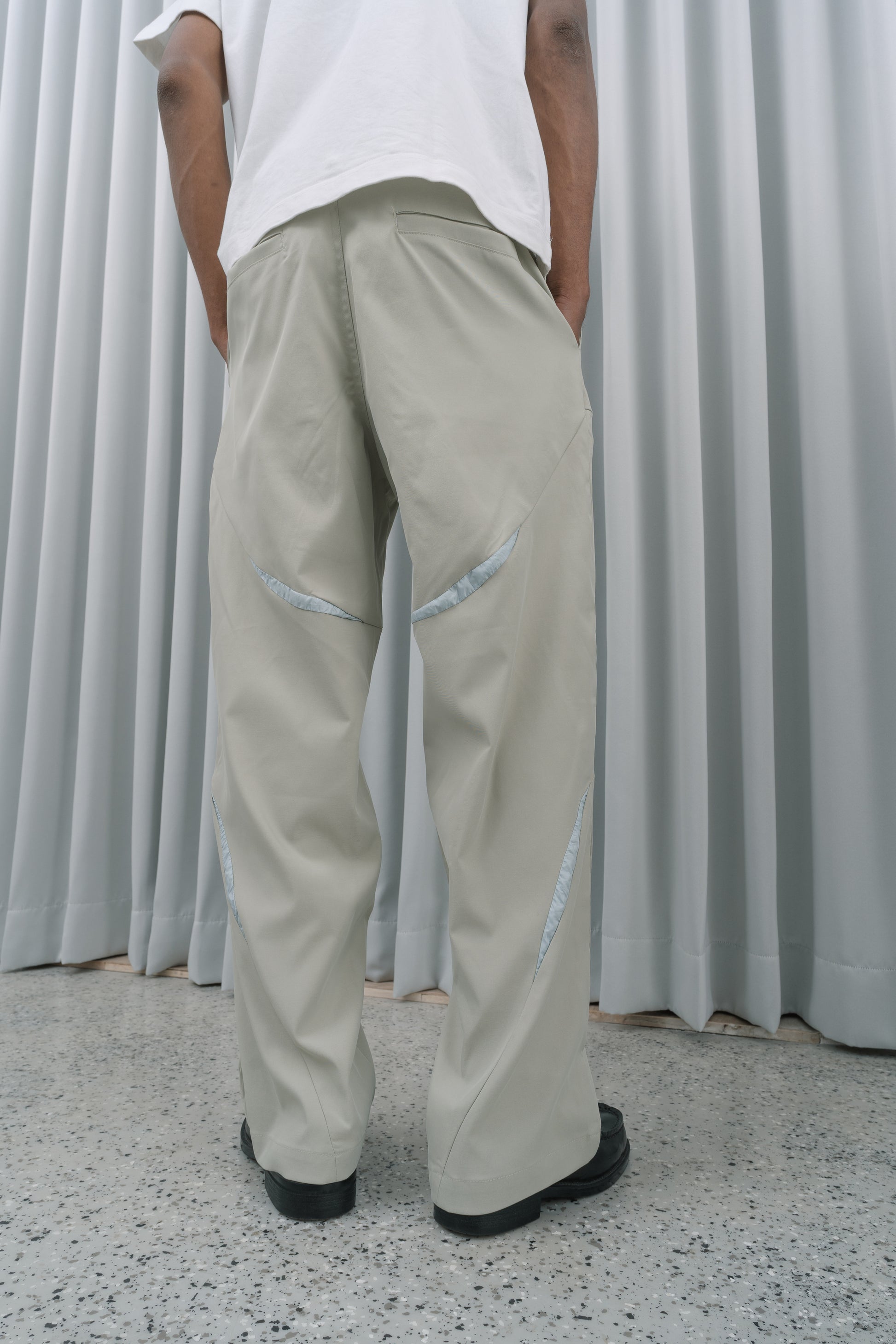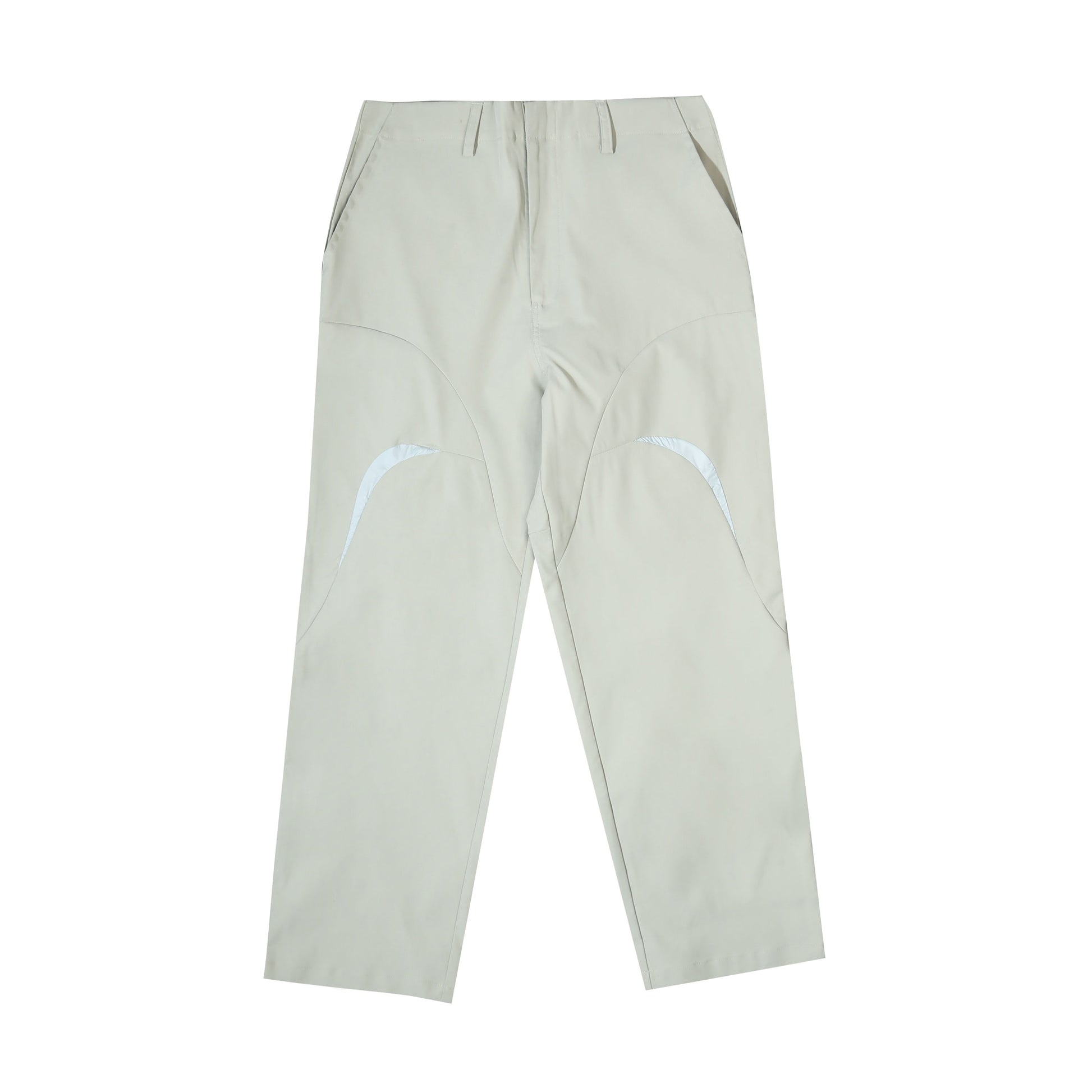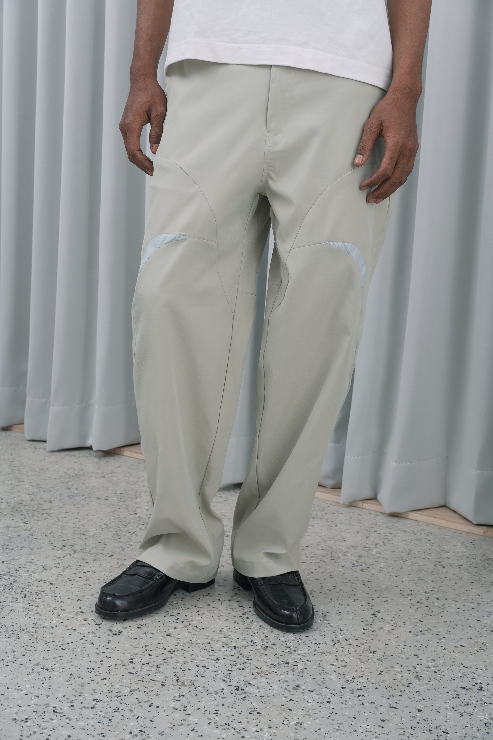 Trouser with few arched cut out details featuring different type of fabric. Front zipper, hook and eye waist closure. Water repelent fabric.
