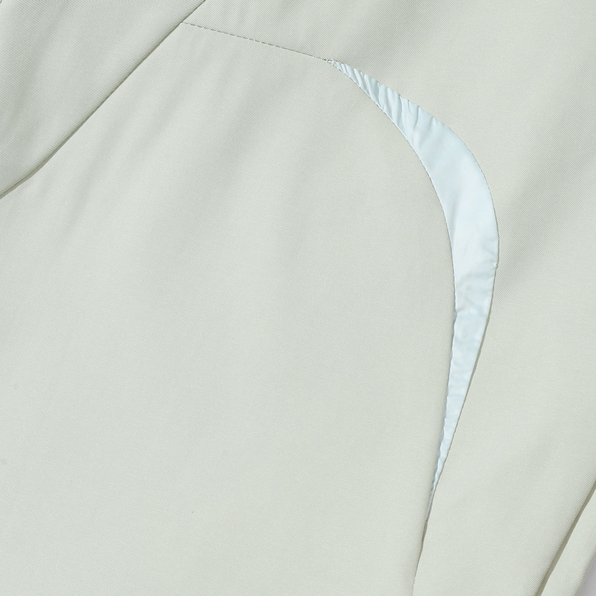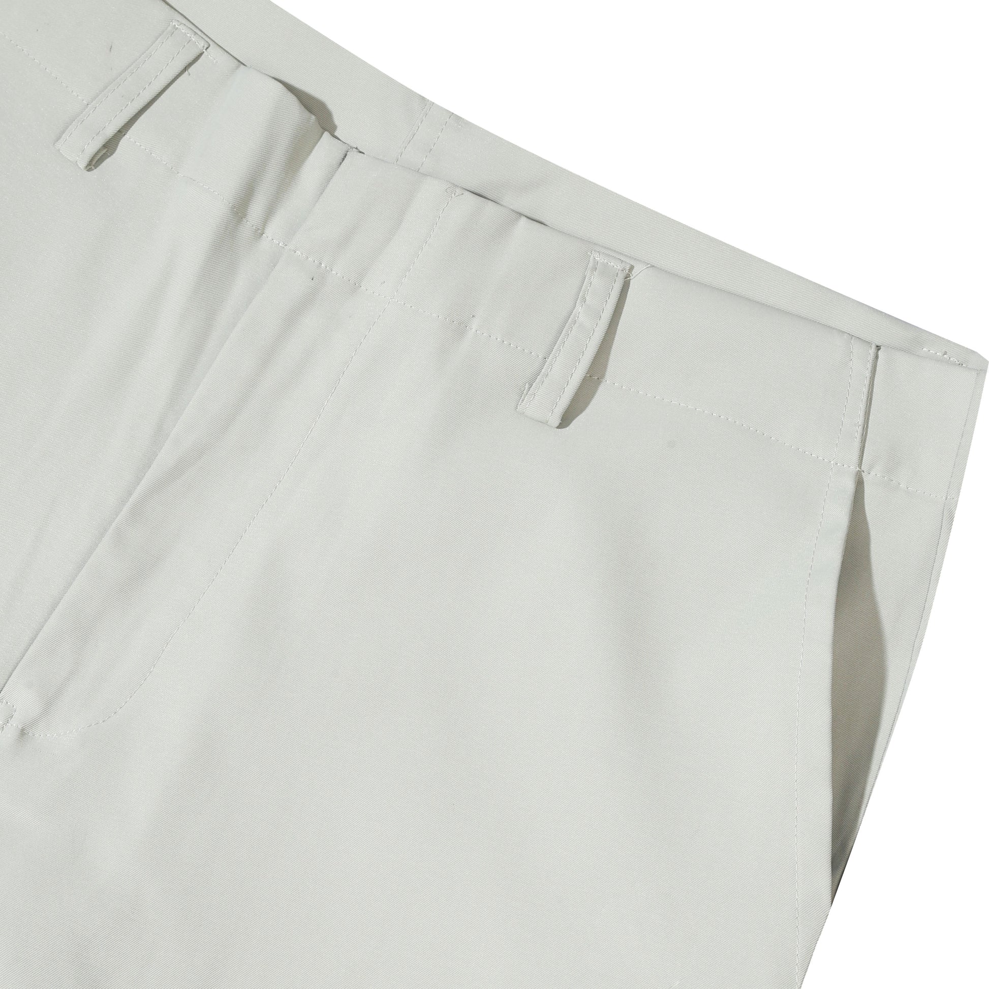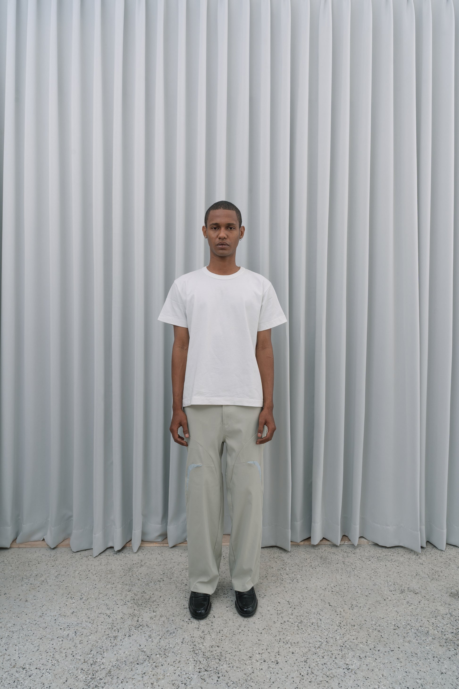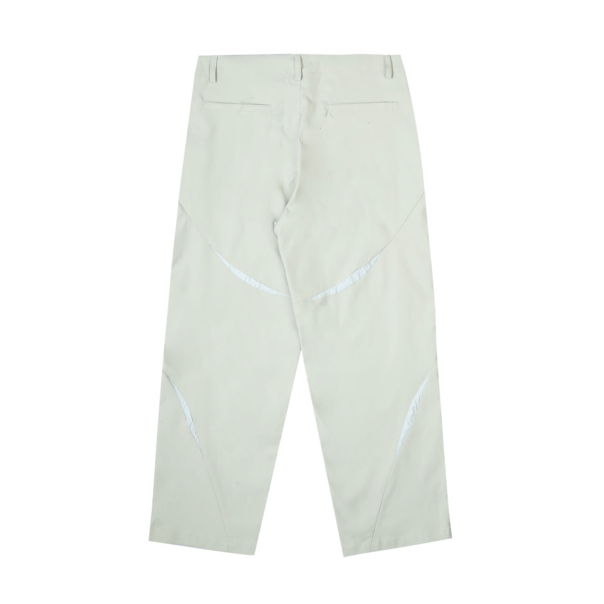 Trouser with few arched cut out details featuring different type of fabric. Front zipper, hook and eye waist closure. Water repelent fabric.