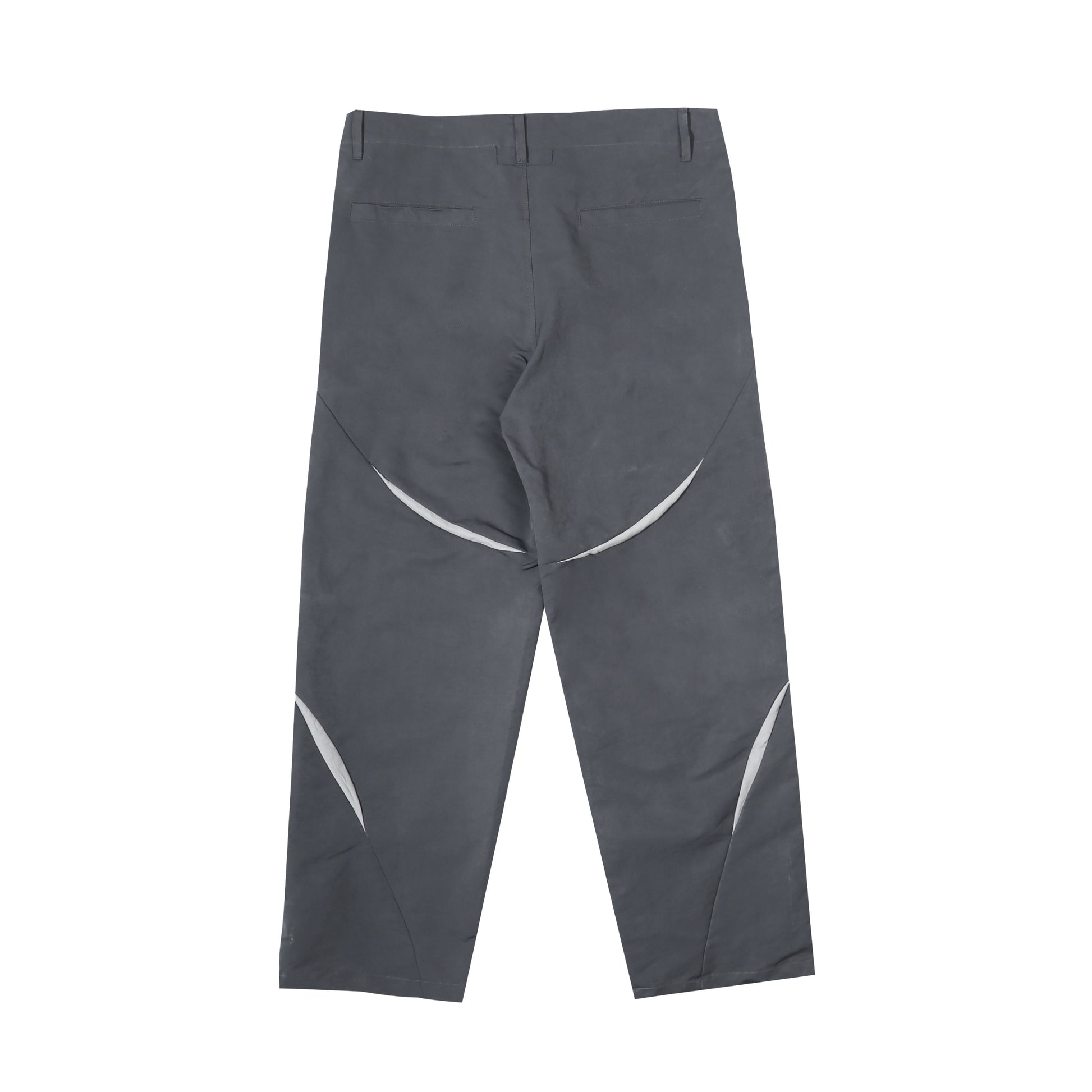 Trouser with few arched cut out details featuring different type of fabric. Front zipper, hook and eye waist closure. Water repelent fabric.