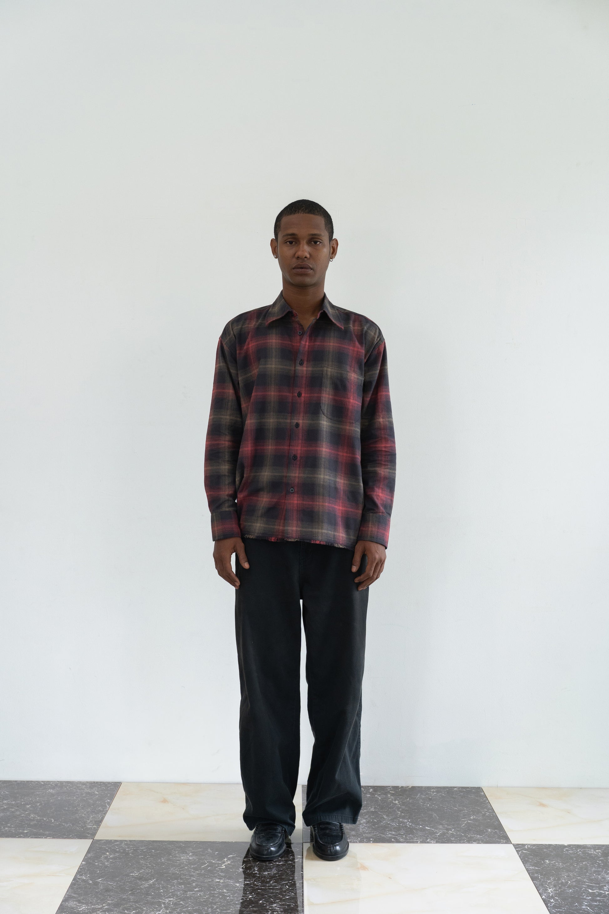 Relaxed fit flannel shirt with distressed detail on botton hem. Full front button closure. Functional patch pocket.