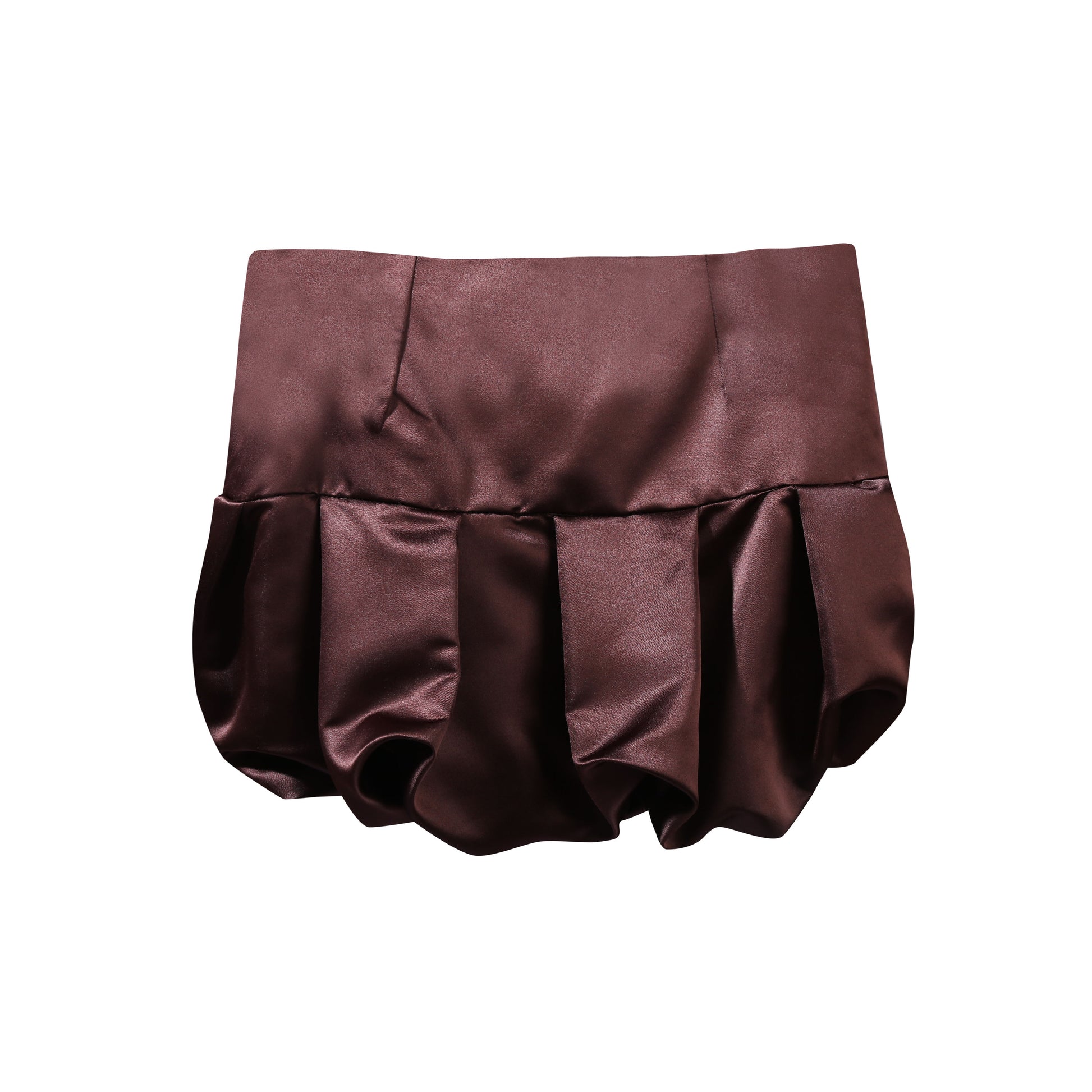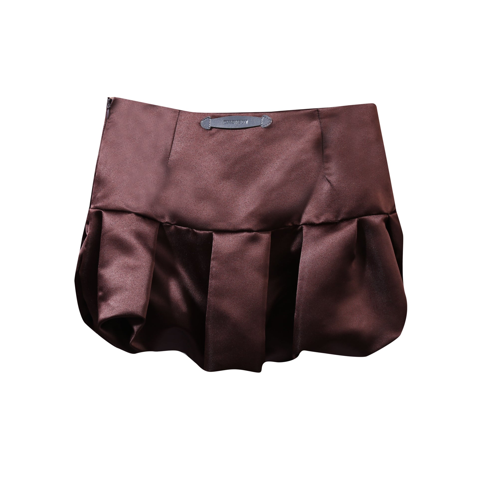 Low waist mini satin skirt in rich chocolate brown with side zipper opening and collaboration leather tag.