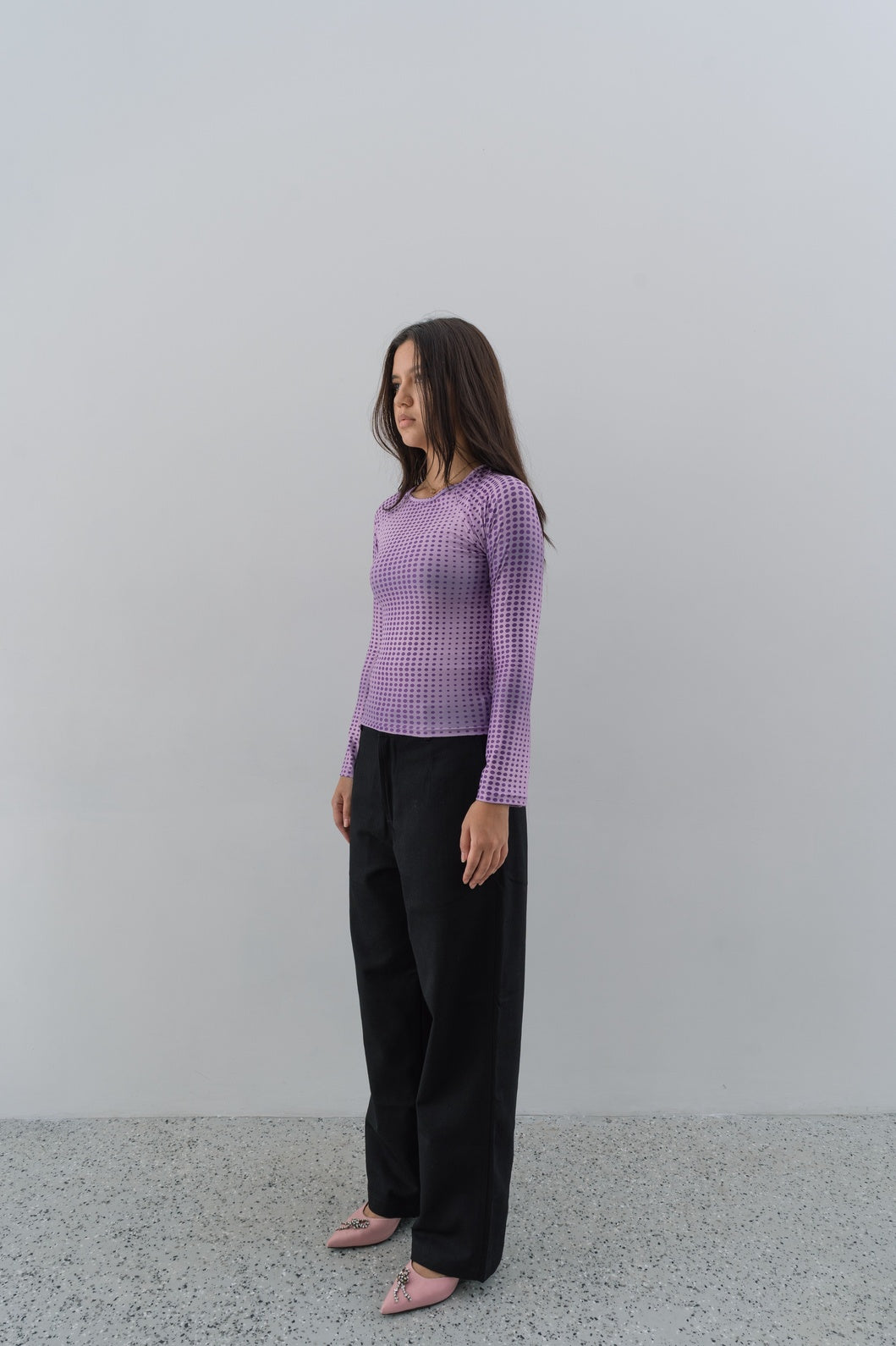Half-tone printed pattern on nylon blend top. Raglan cut. Long sleeve. French binding neckline finish.