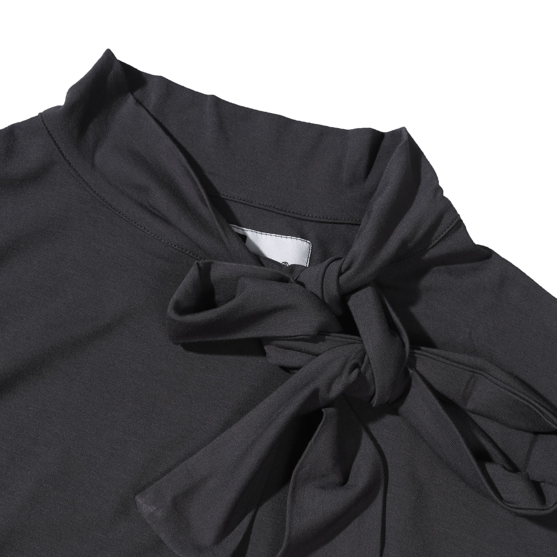High neck top with extra fabric on collar and ruched detail on the waist.