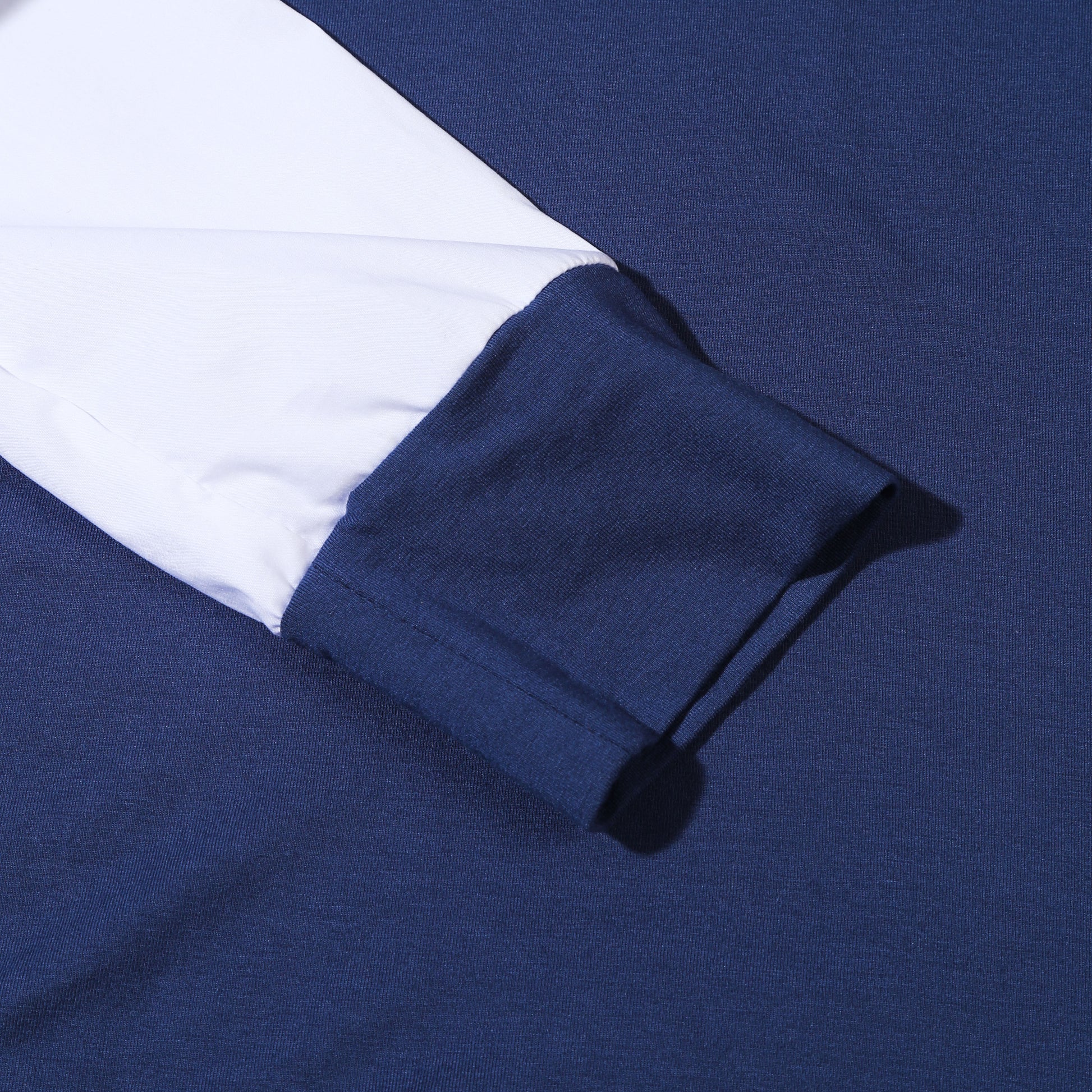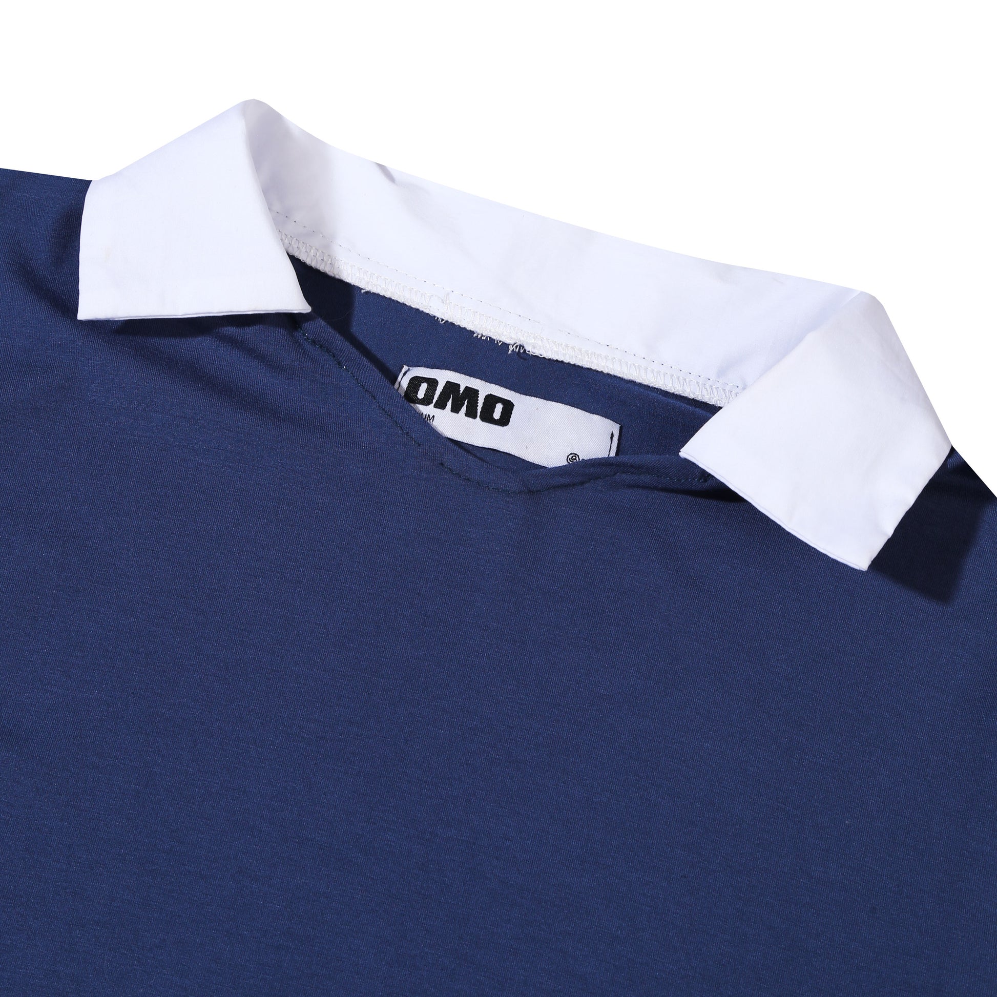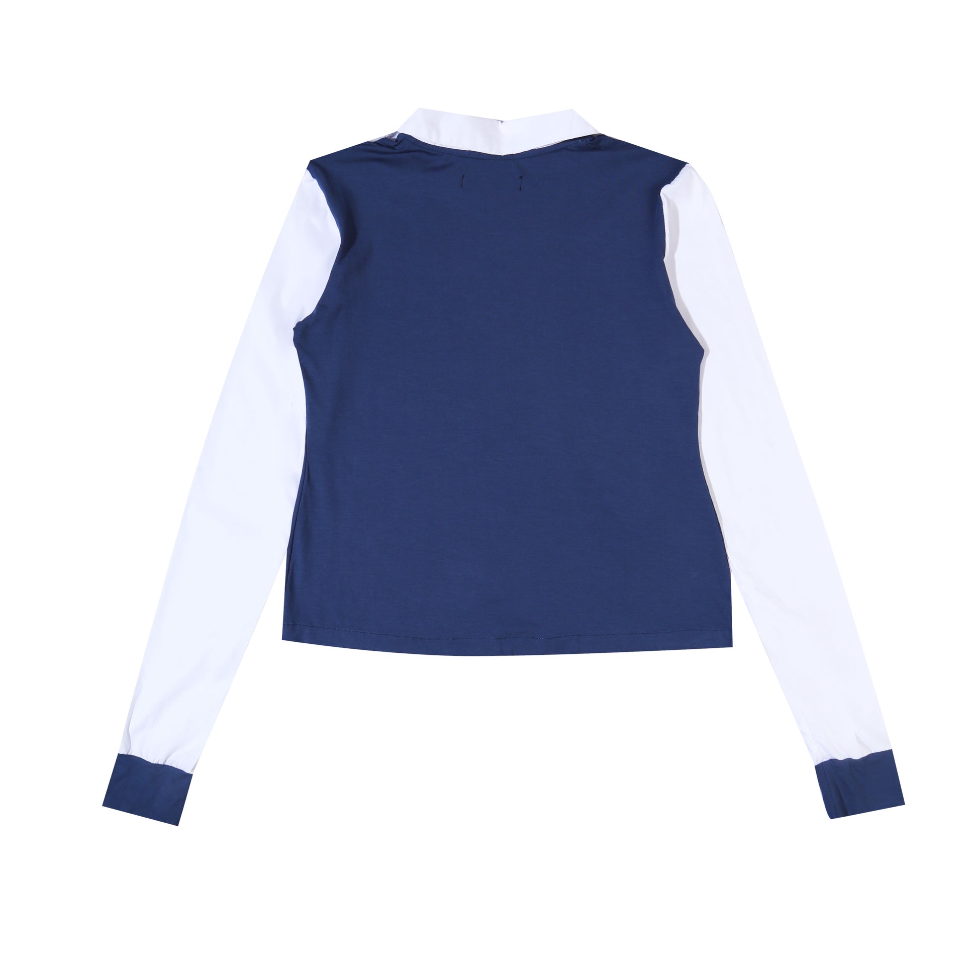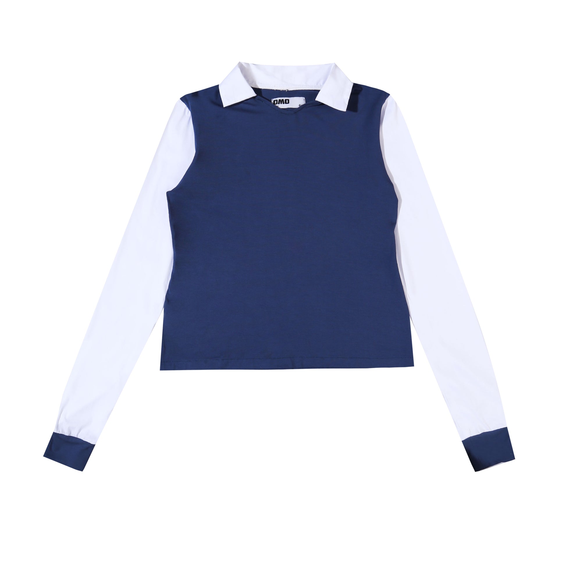 Long-sleeve v-neck shirt in a blue and white colorway, featuring a folded collar.