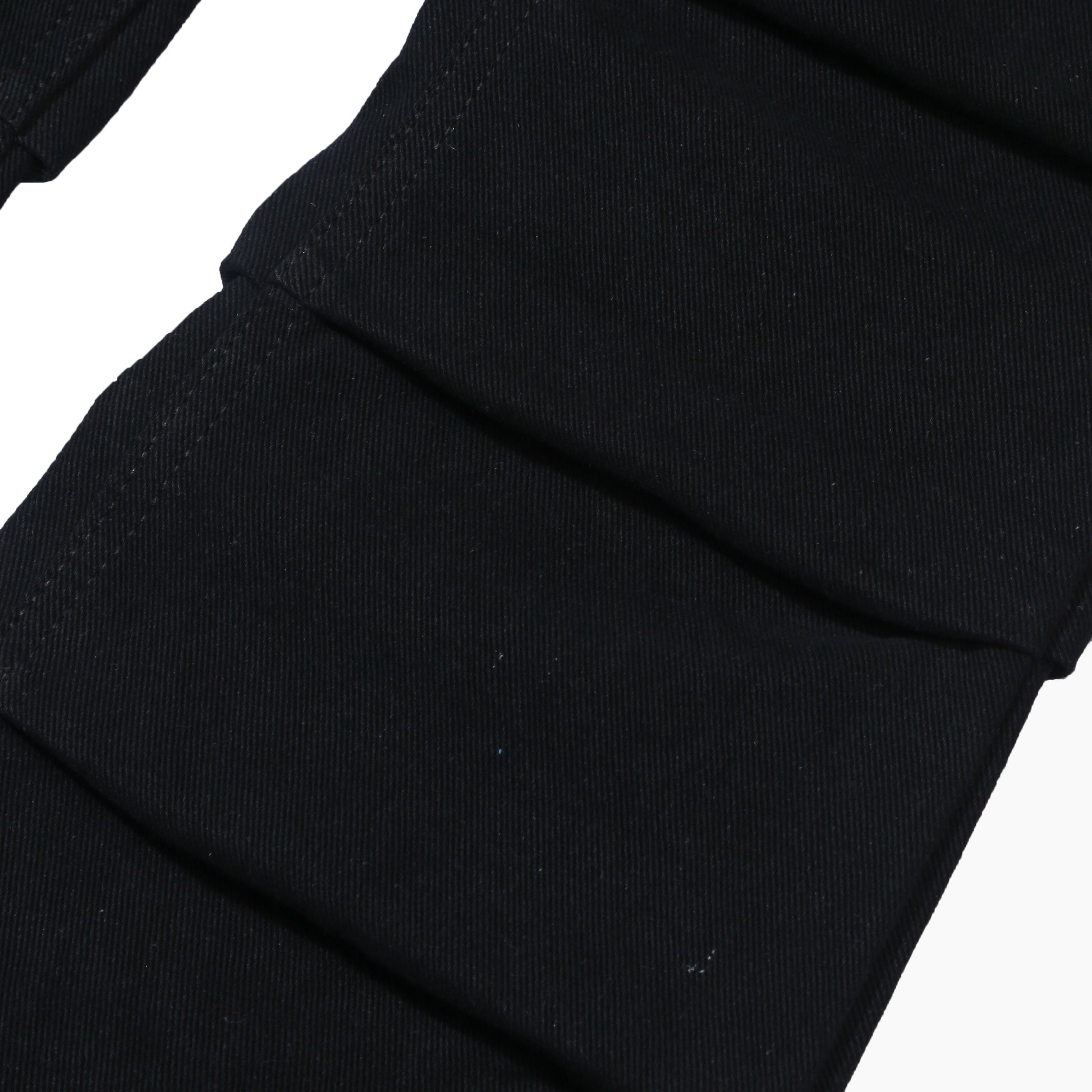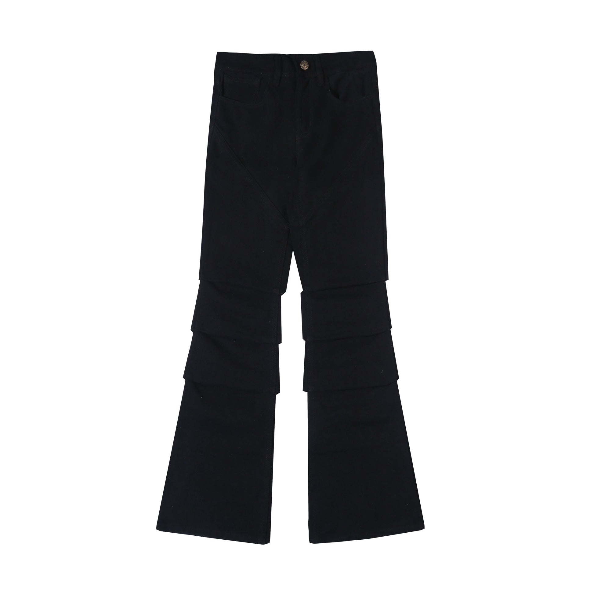 Flared jeans with gathered details in lower knee part of the pants. Chrome button waist closure. Front closure zipper. Two front pockets, and two back pockets.