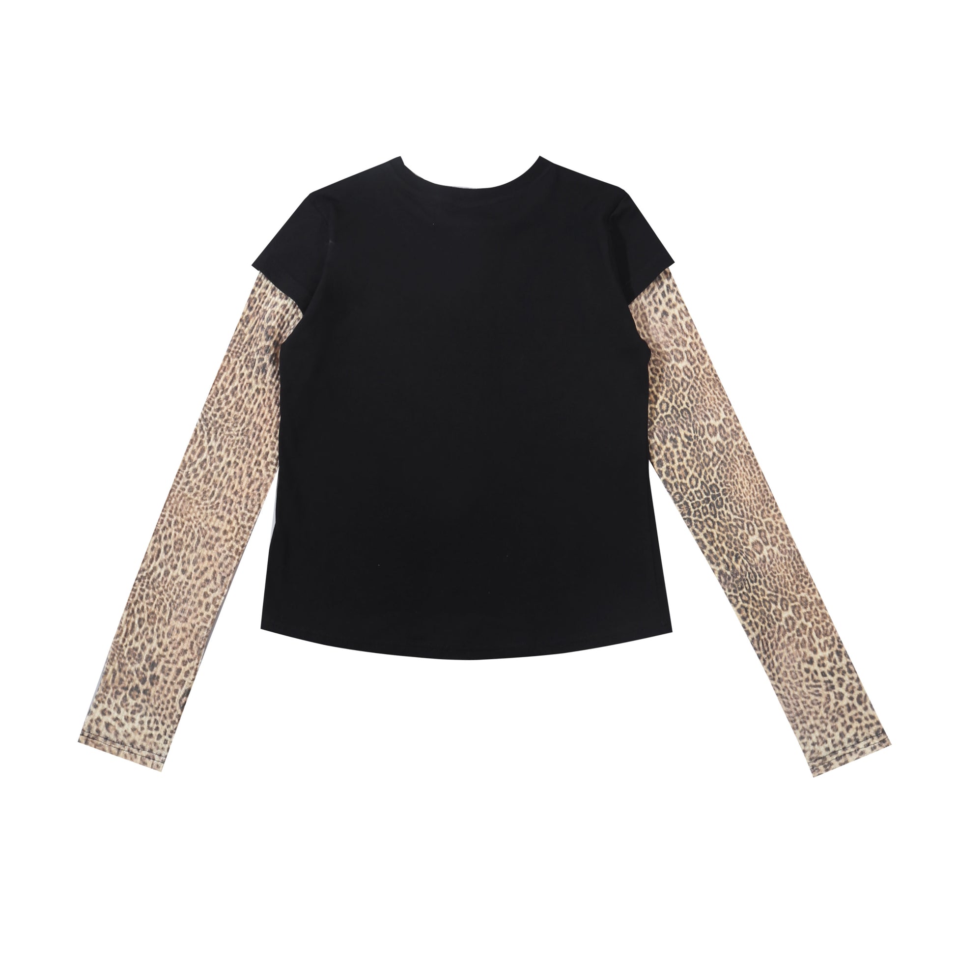 Black short-sleeve top layered over sheer leopard-print long sleeves with a crew neckline and three-button henley placket. Straight fit with a slightly cropped length in lightweight stretch fabric.