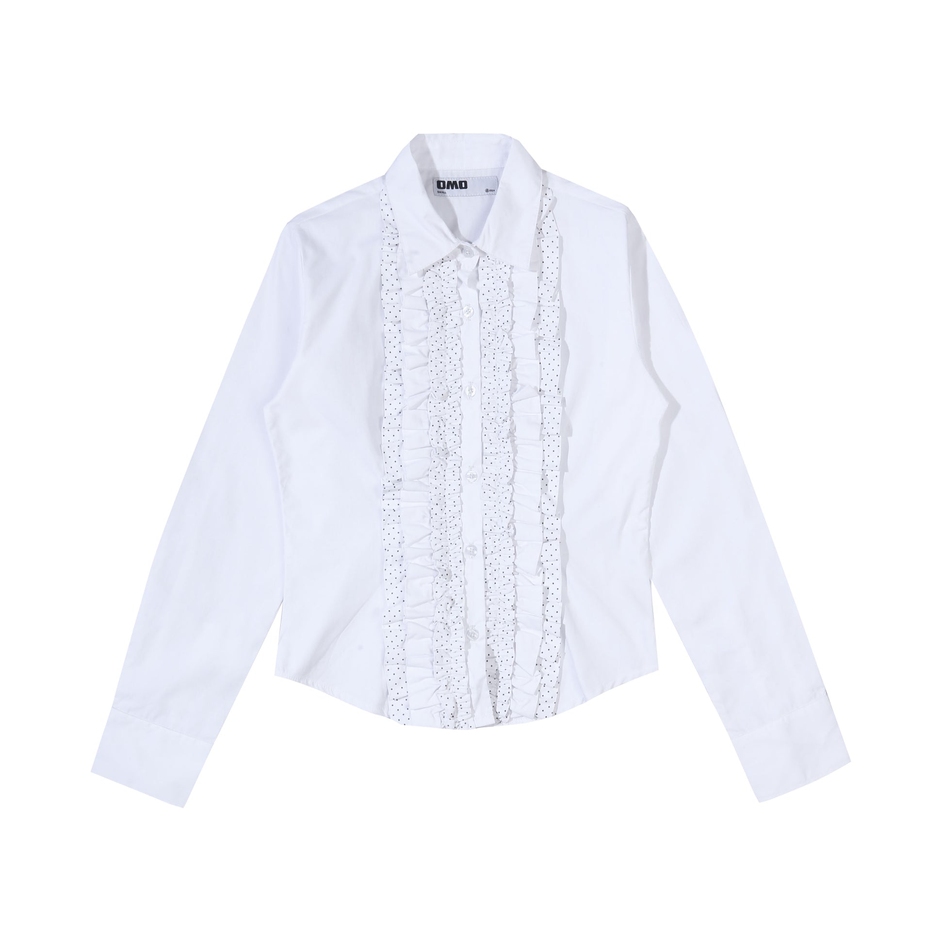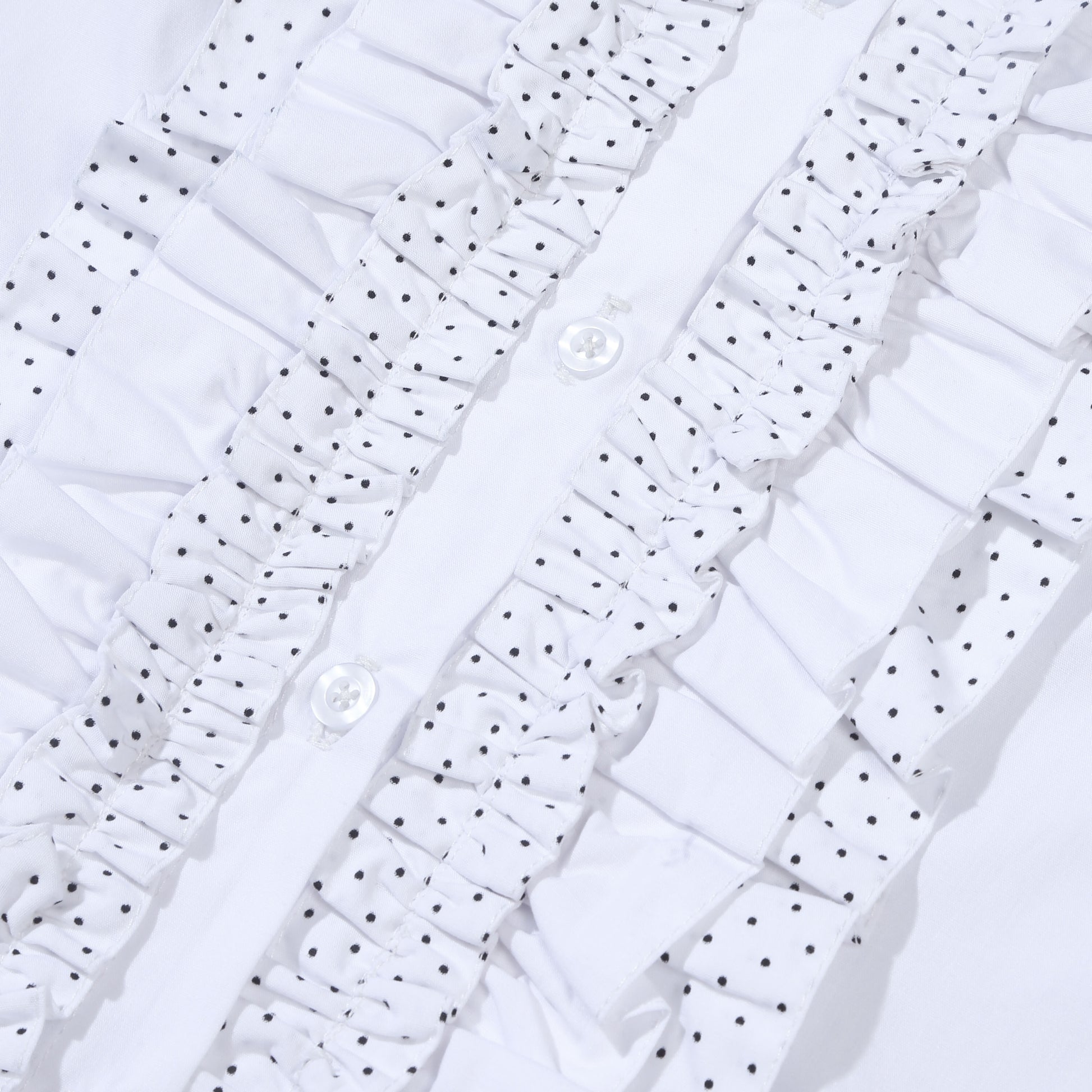 Long-sleeve fitted shirt in black, featuring layered polkadot ruffle details.