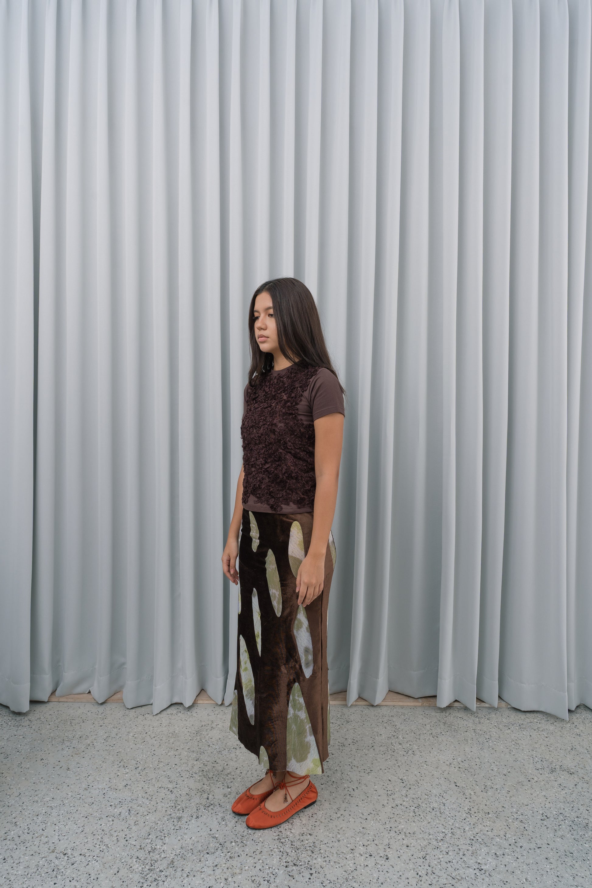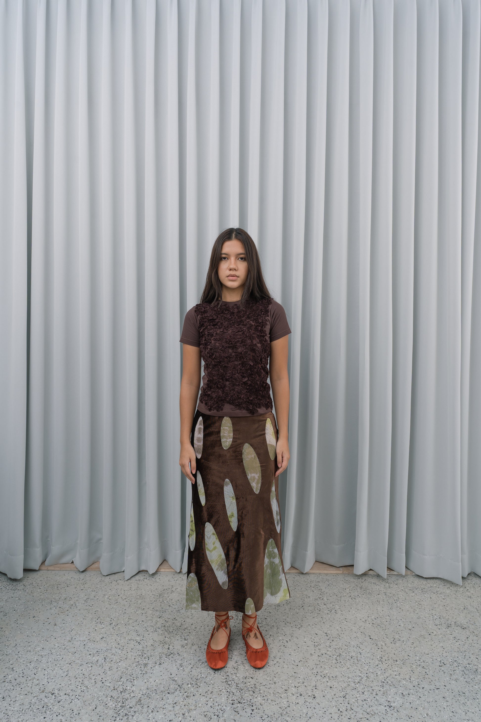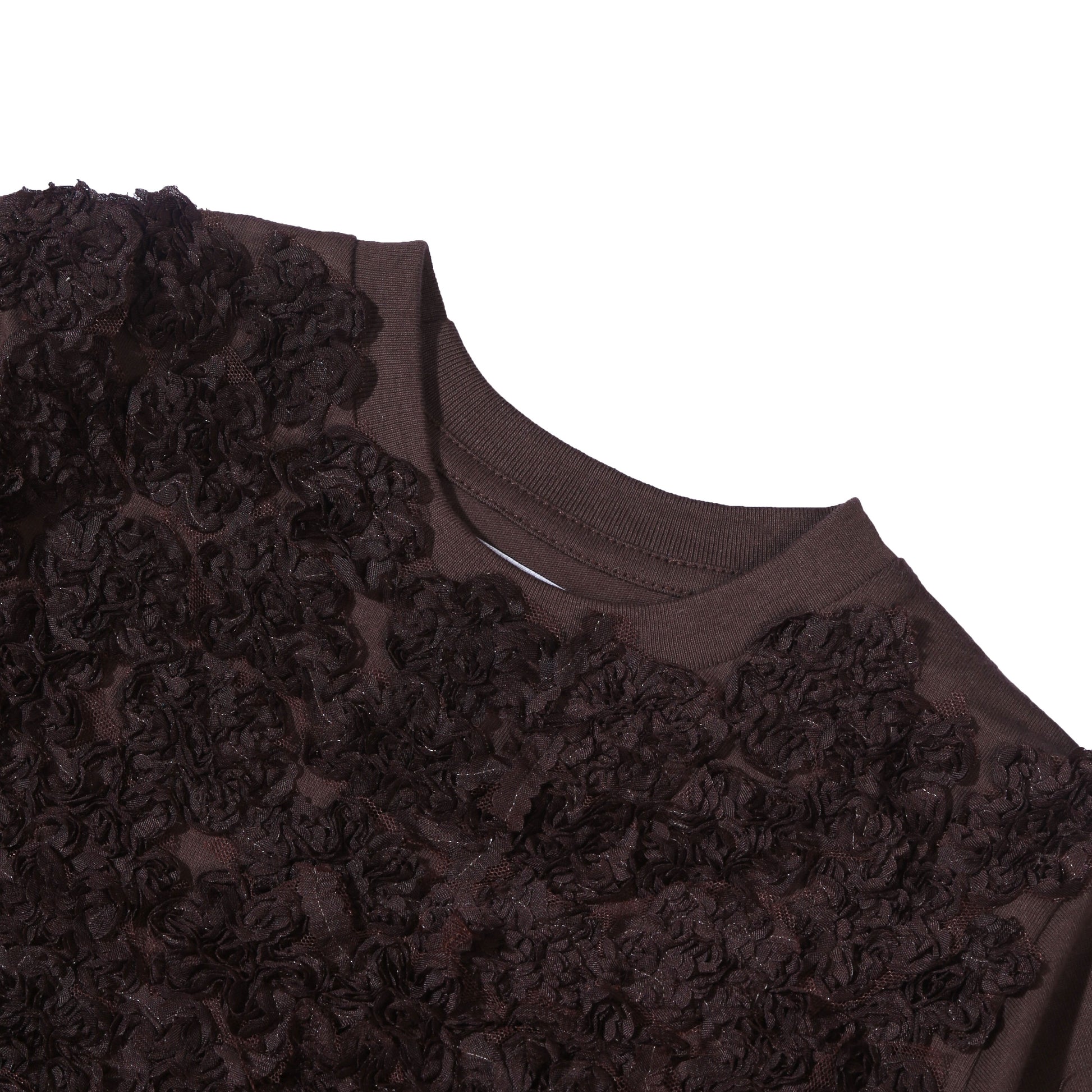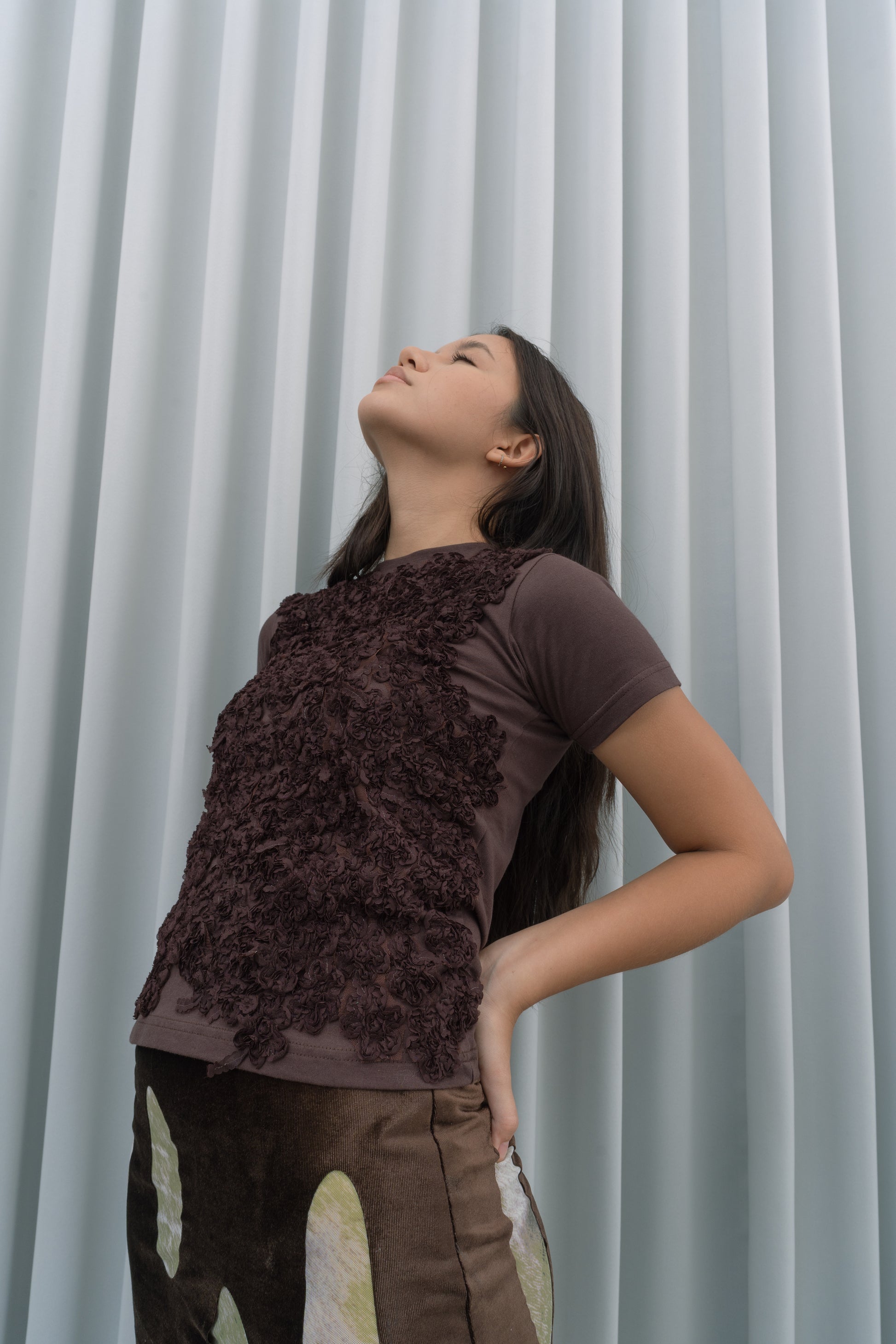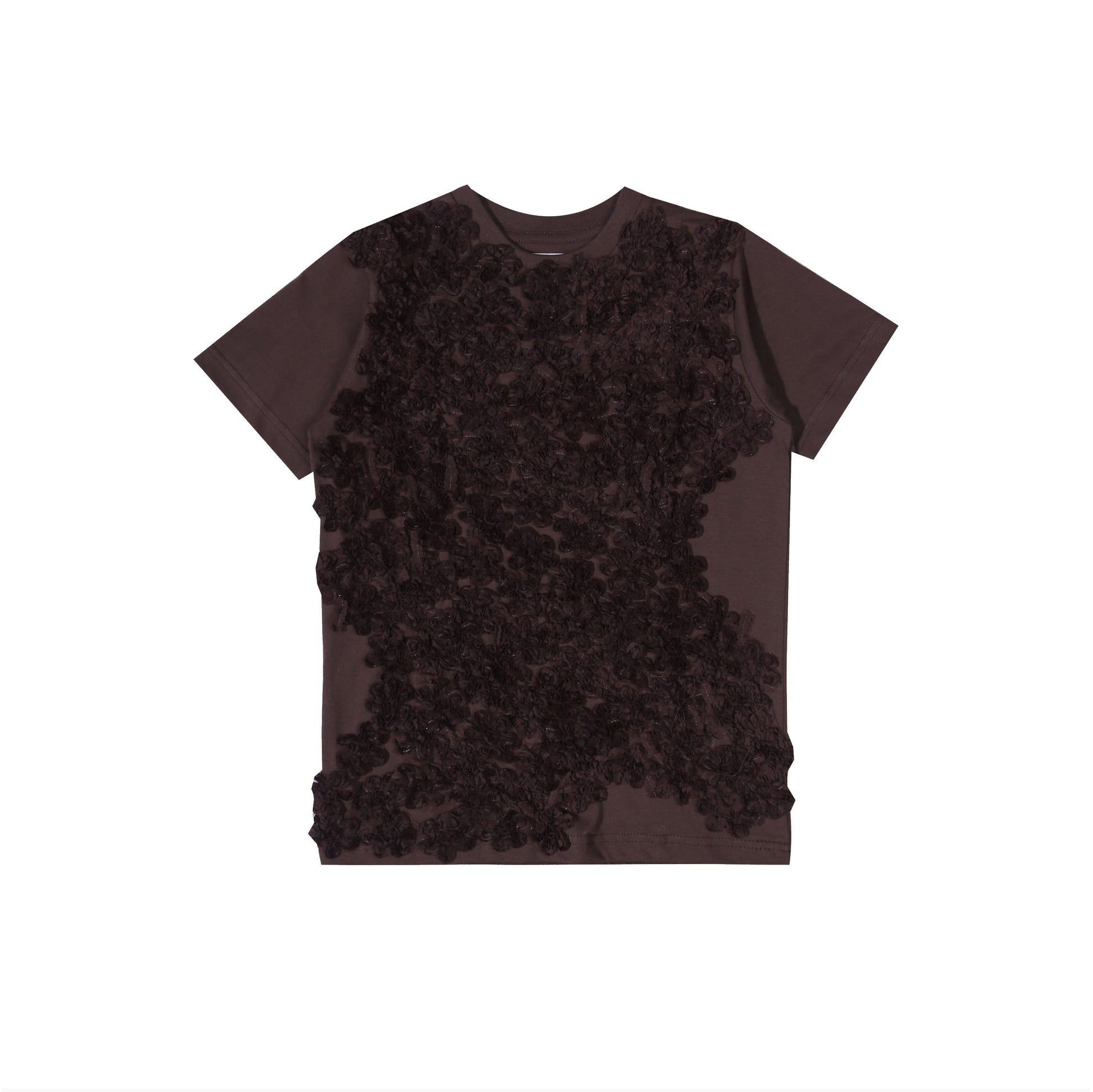 Brown t-shirt with hand sewn flower appliqués in the front side. Cropped fit.