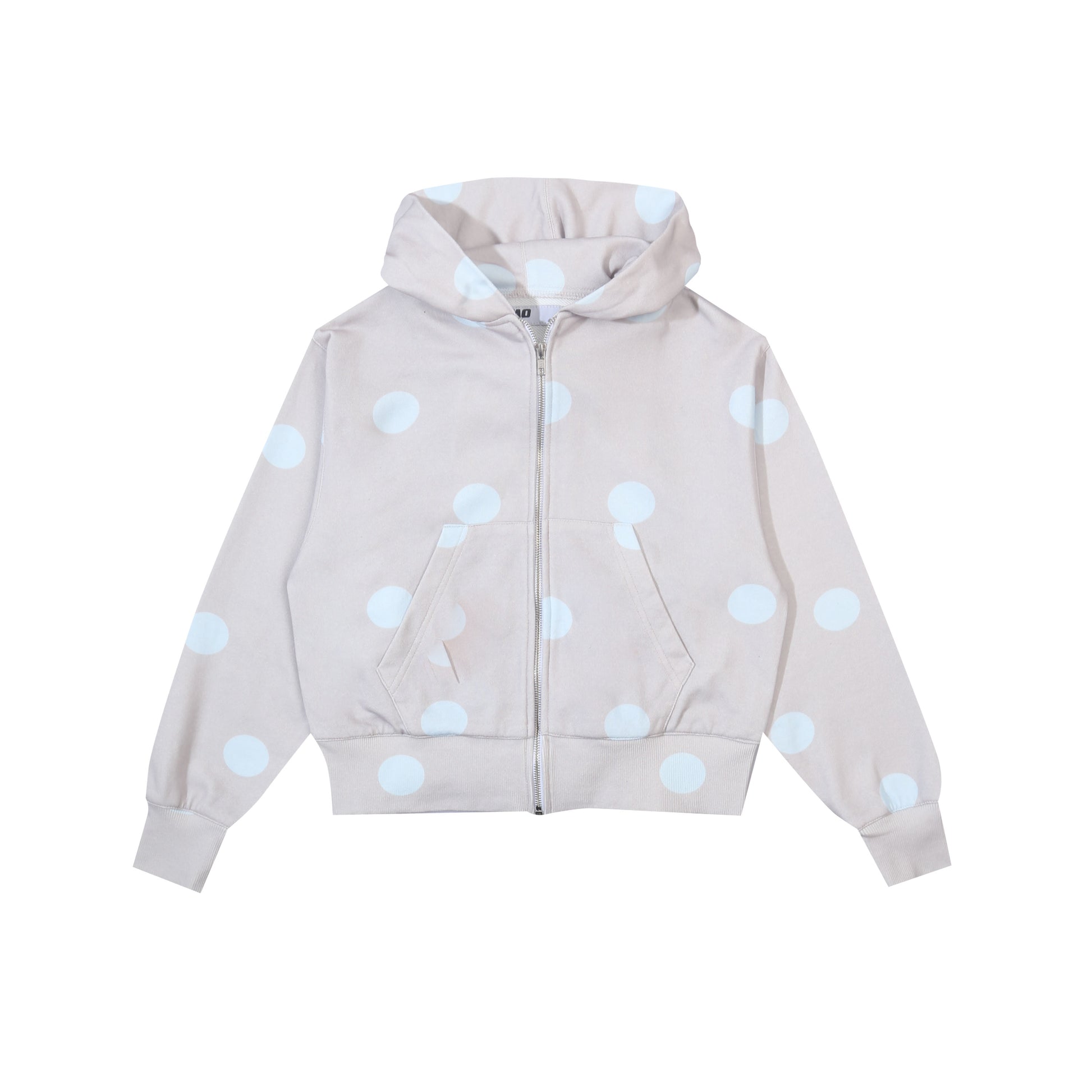 Zip-up hoodie with all-over polka dot print. Features a drawstring hood, front zipper closure, and kangaroo pockets. Finished with ribbed cuffs and hem in soft cotton fleece.