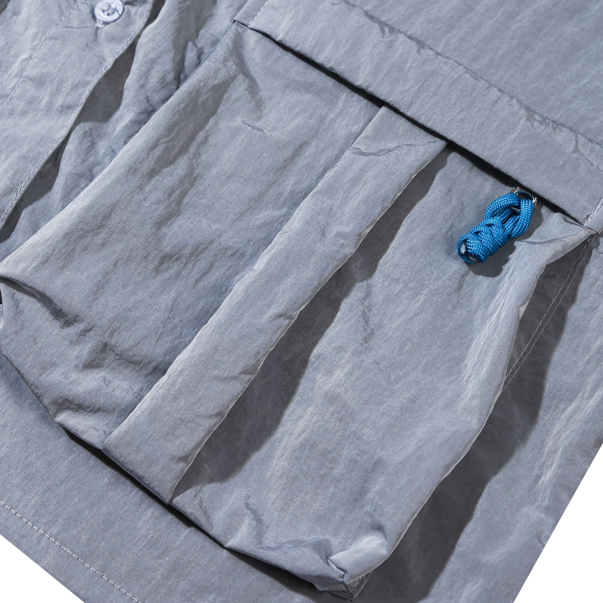 Practical grey shirt equipped with multiple pockets, each featuring blue zipper pull.