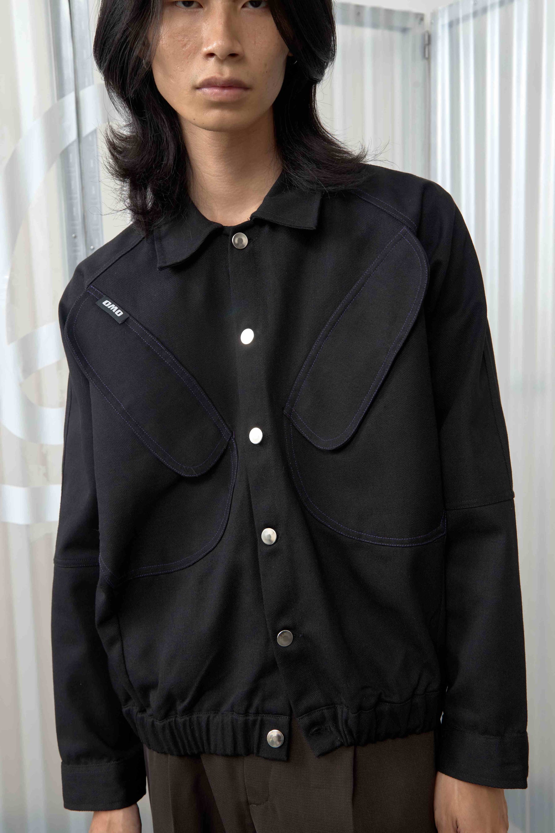 Black twill jacket with functional pocket designs and a stretch-rubber waist hem.