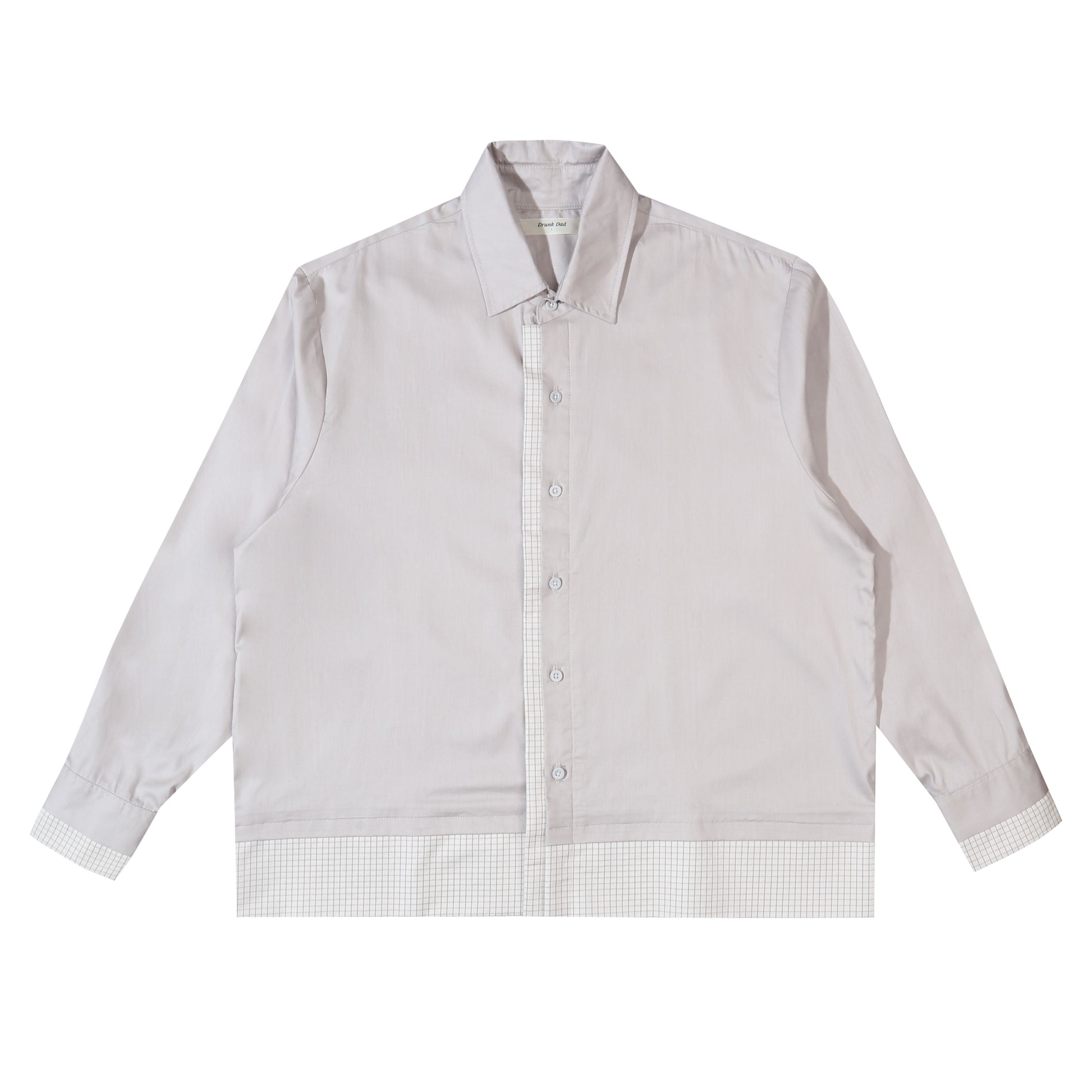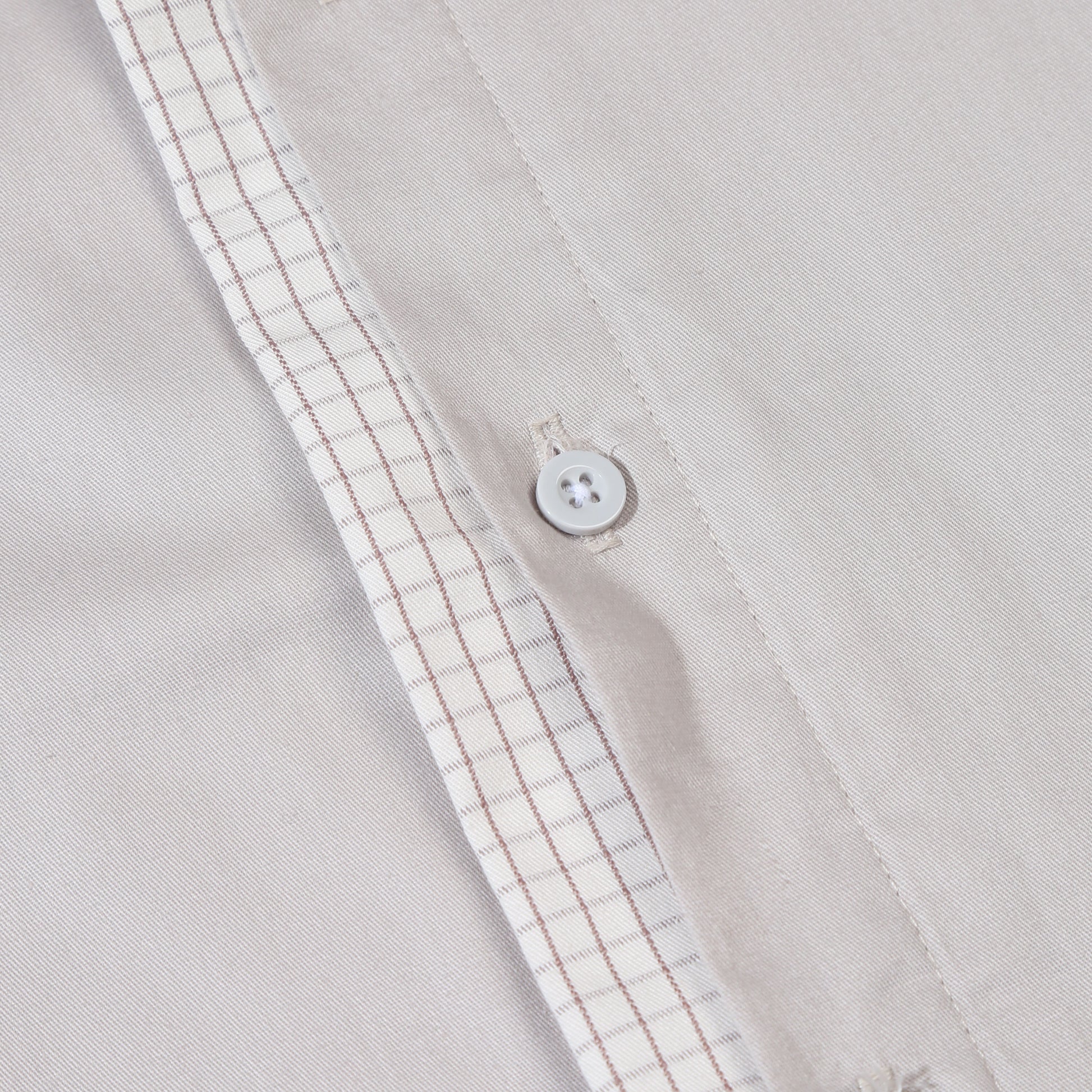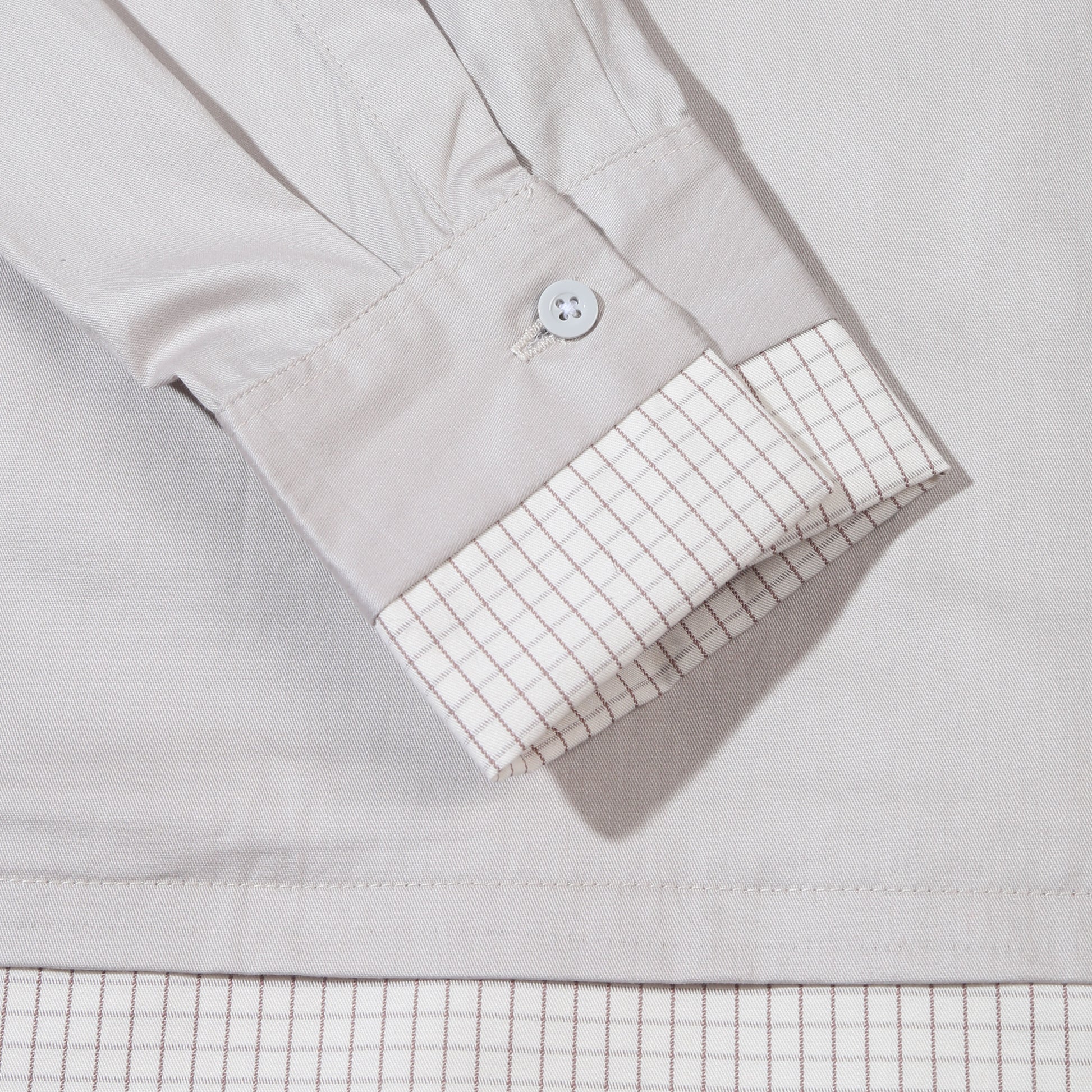 Unisex cotton button-up shirt with subtle sheen, featuring check-pattern accents on the cuffs, placket lining, and hem for a clean contrast detail