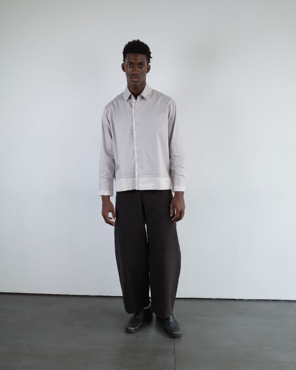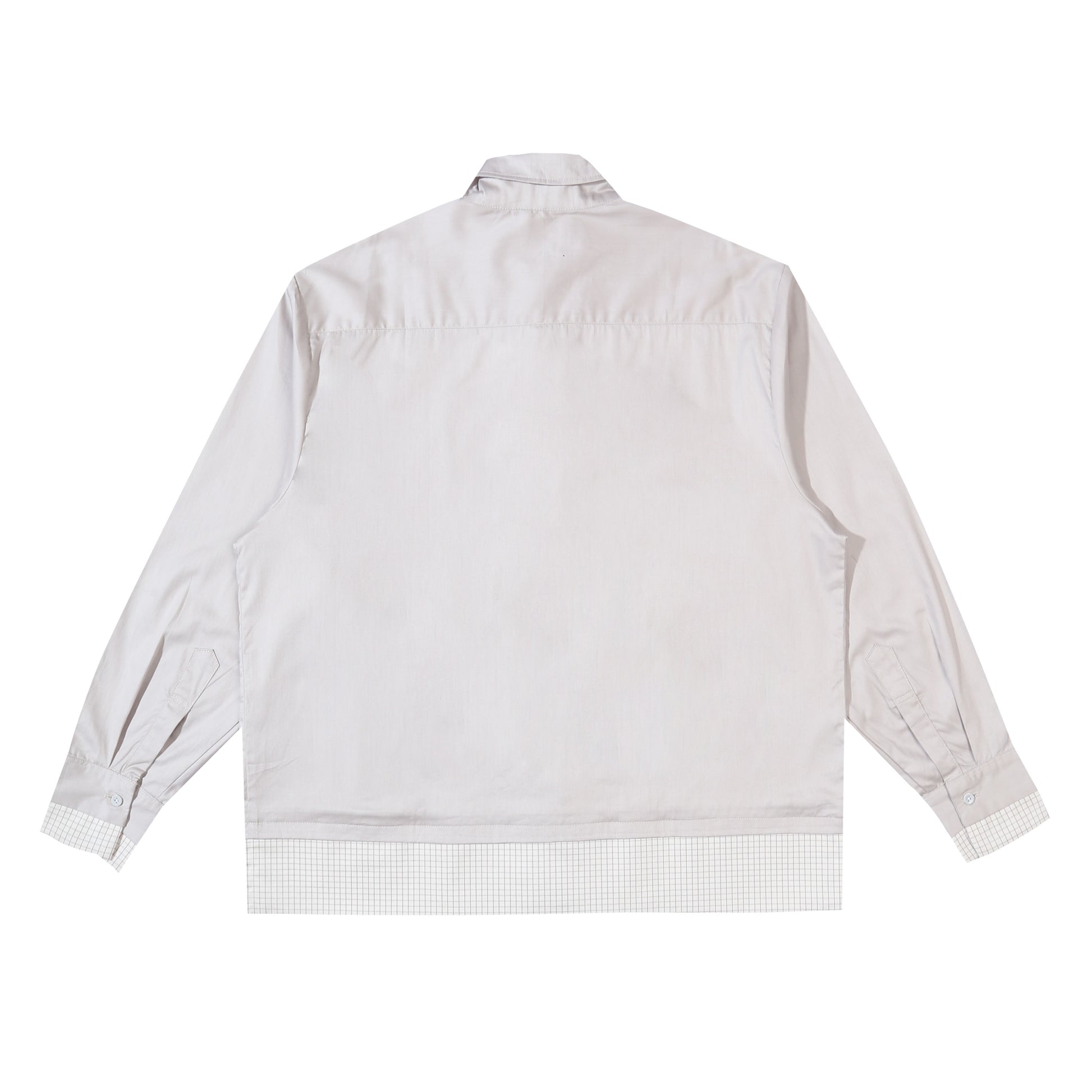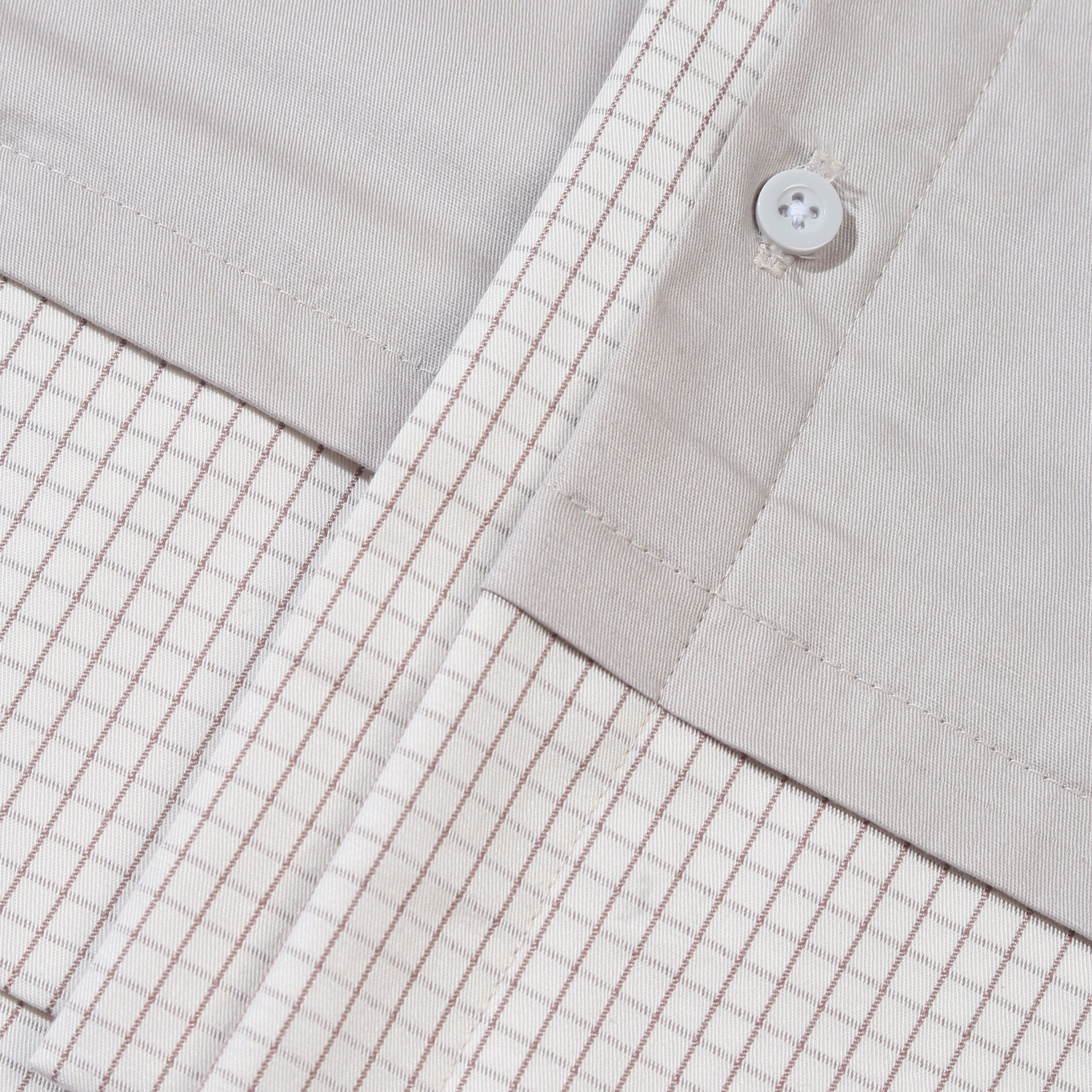 Unisex cotton button-up shirt with subtle sheen, featuring check-pattern accents on the cuffs, placket lining, and hem for a clean contrast detail