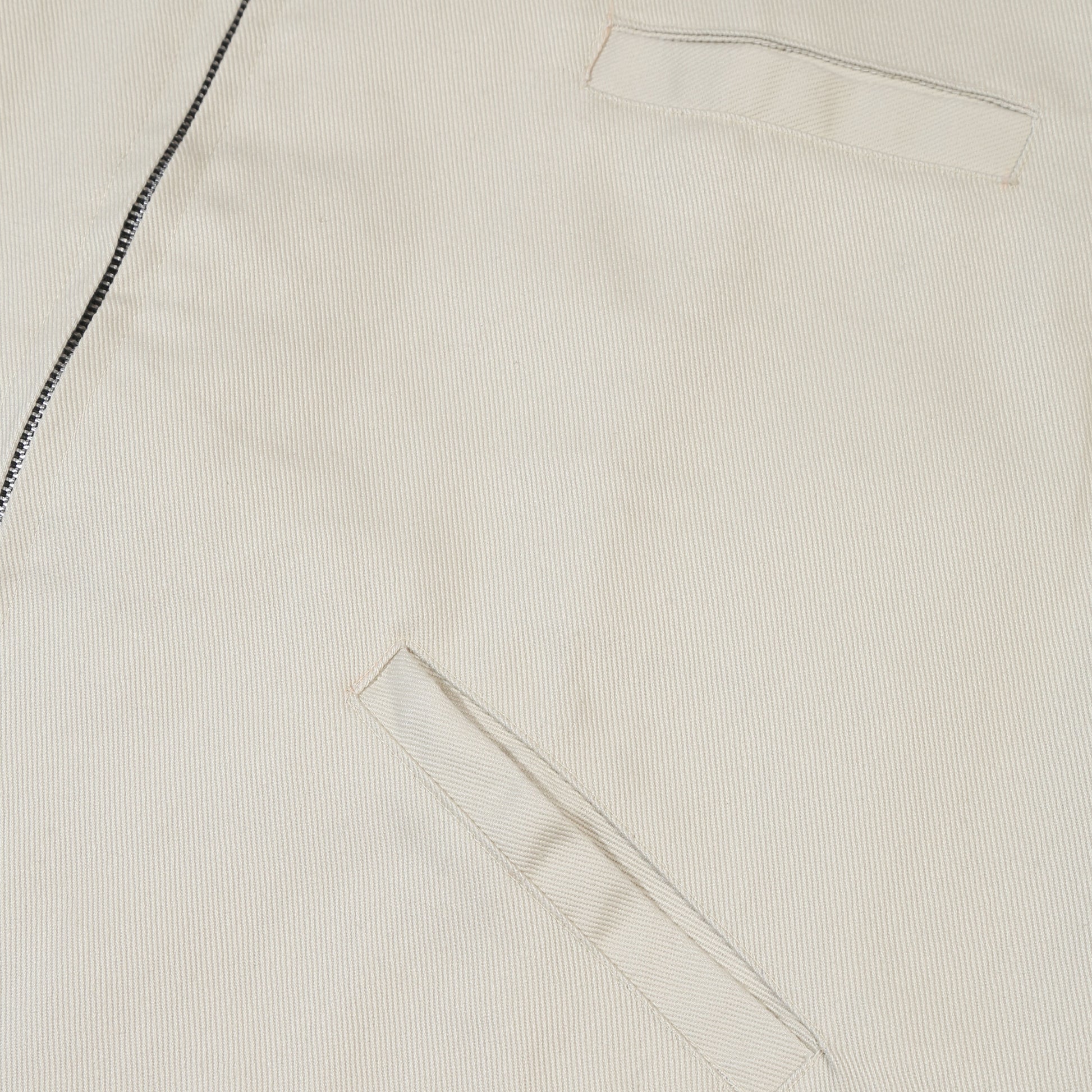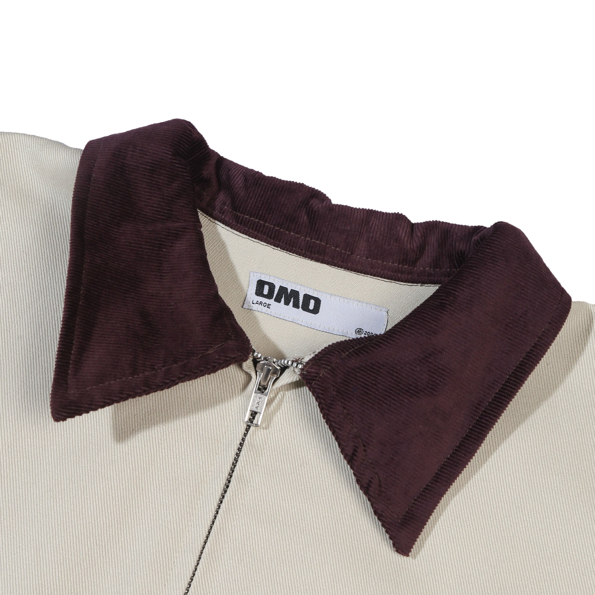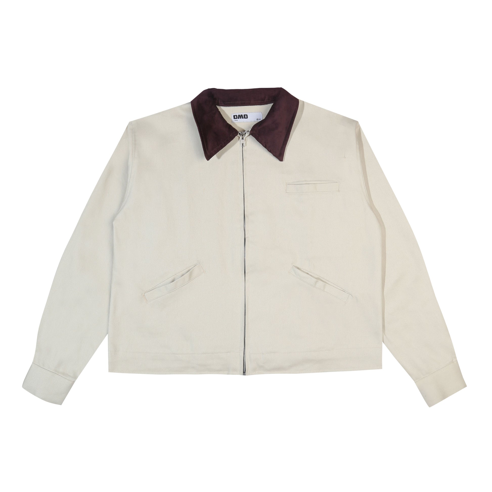 Twill work jacket featuring courduroy collar. Front zipper opening. Three front welt pockets. Square cuff design with one button closure.