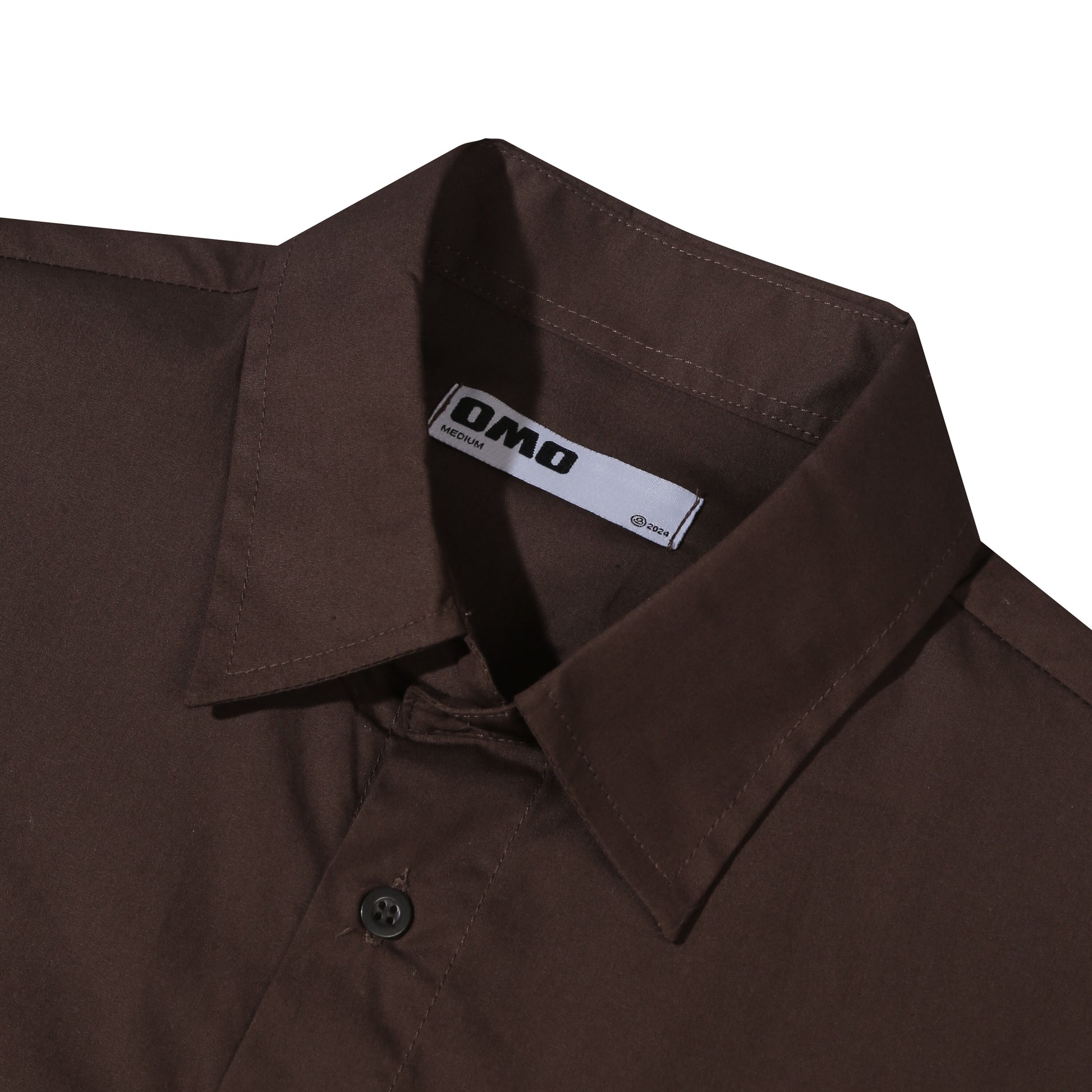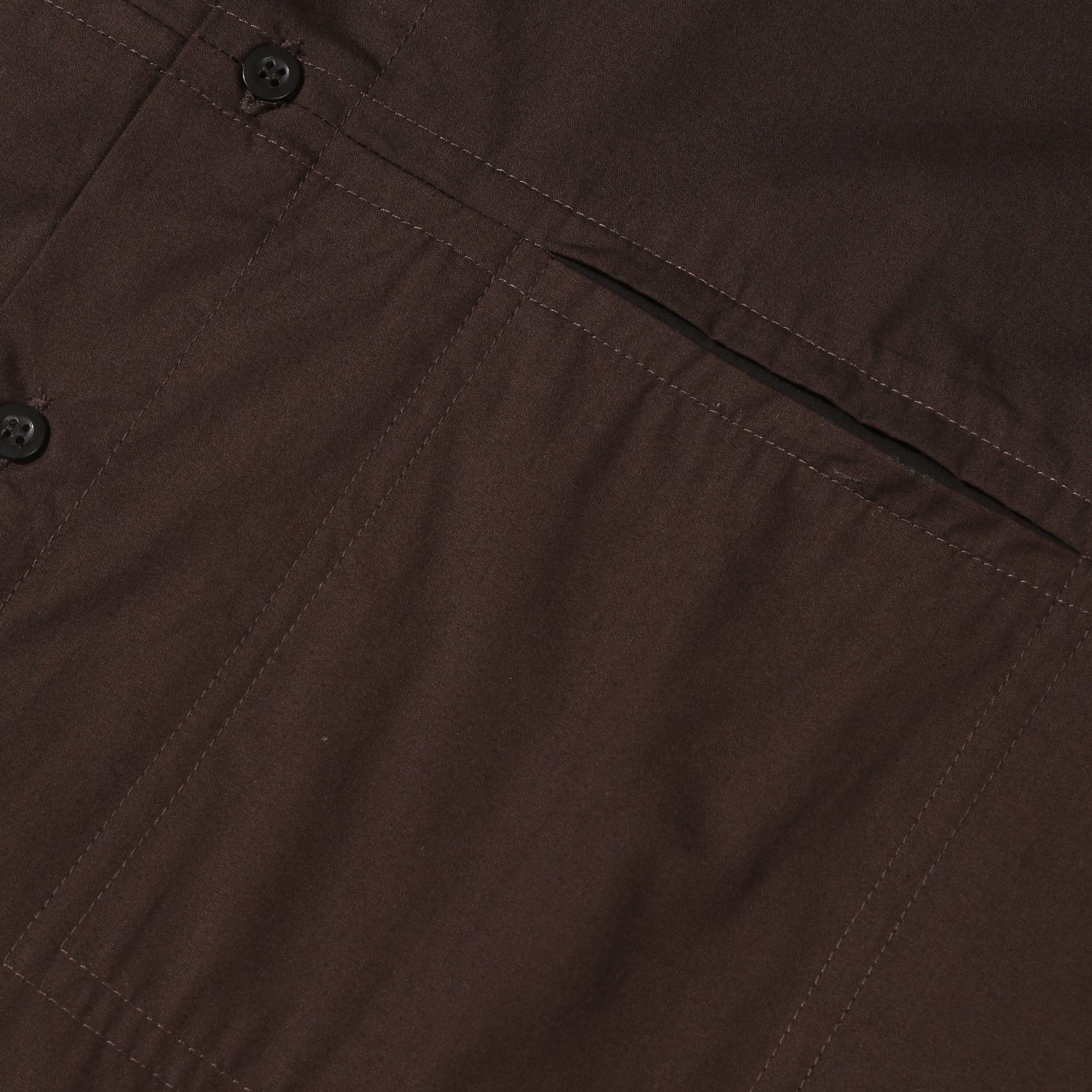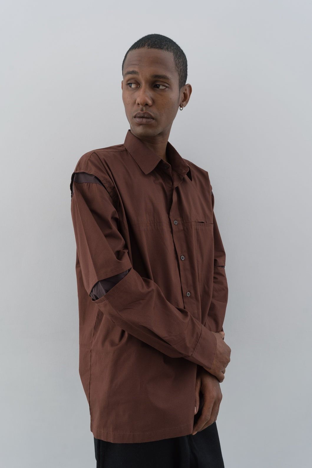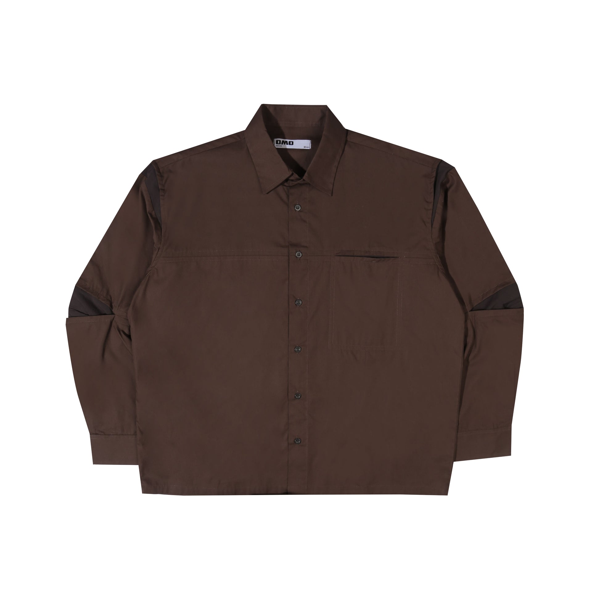 Crisp poplin shirt with slot seam variation in shoulder, elbow and front pocket area. Front button closure. Square cuff with one button closure.