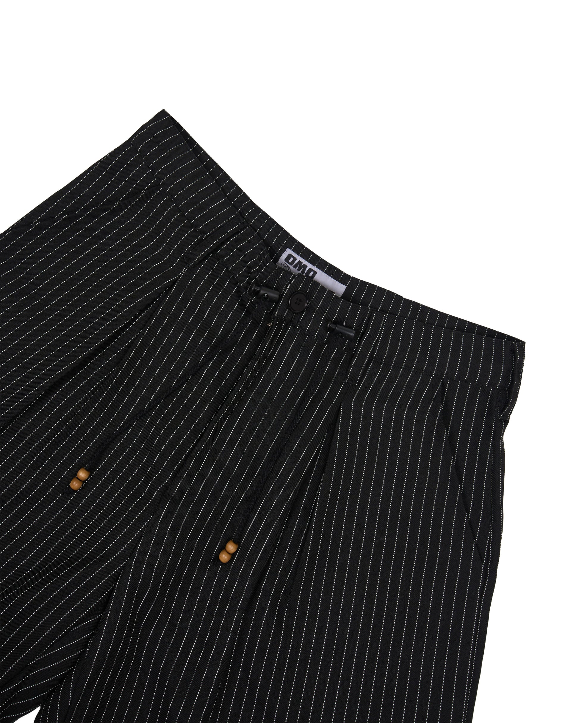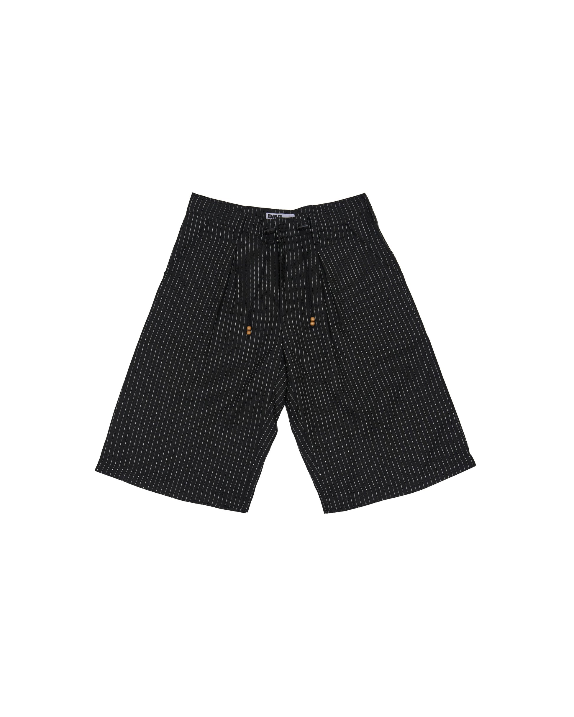 Wide cut pinstripe shorts with adjustable waist stopper and wooden beads.