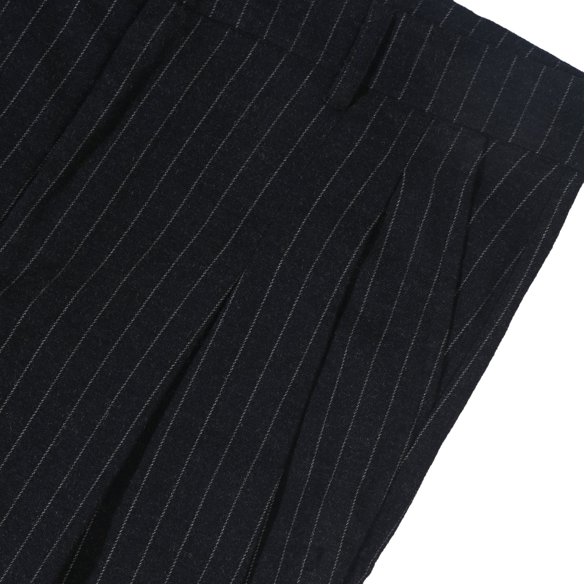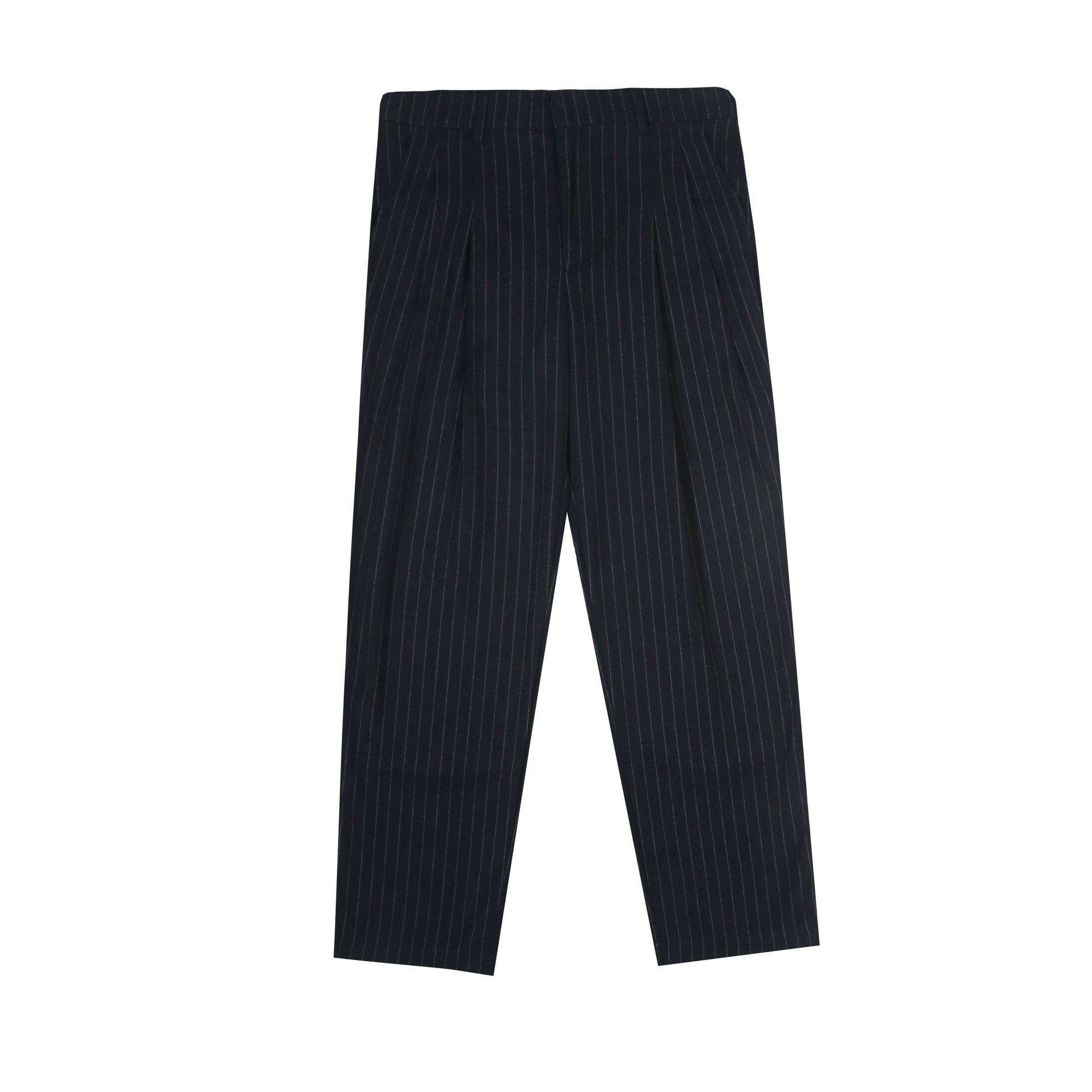 Straight relaxed fit pinstripe wool pants featuring front pleats and zip fly. Hook and eye waist closure. Front pockets and back welt pockets.