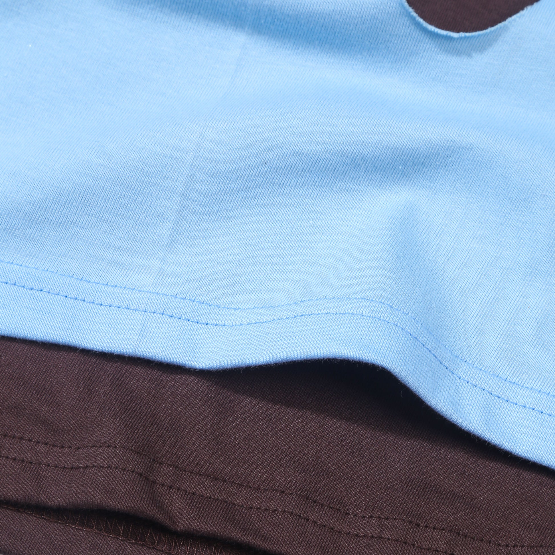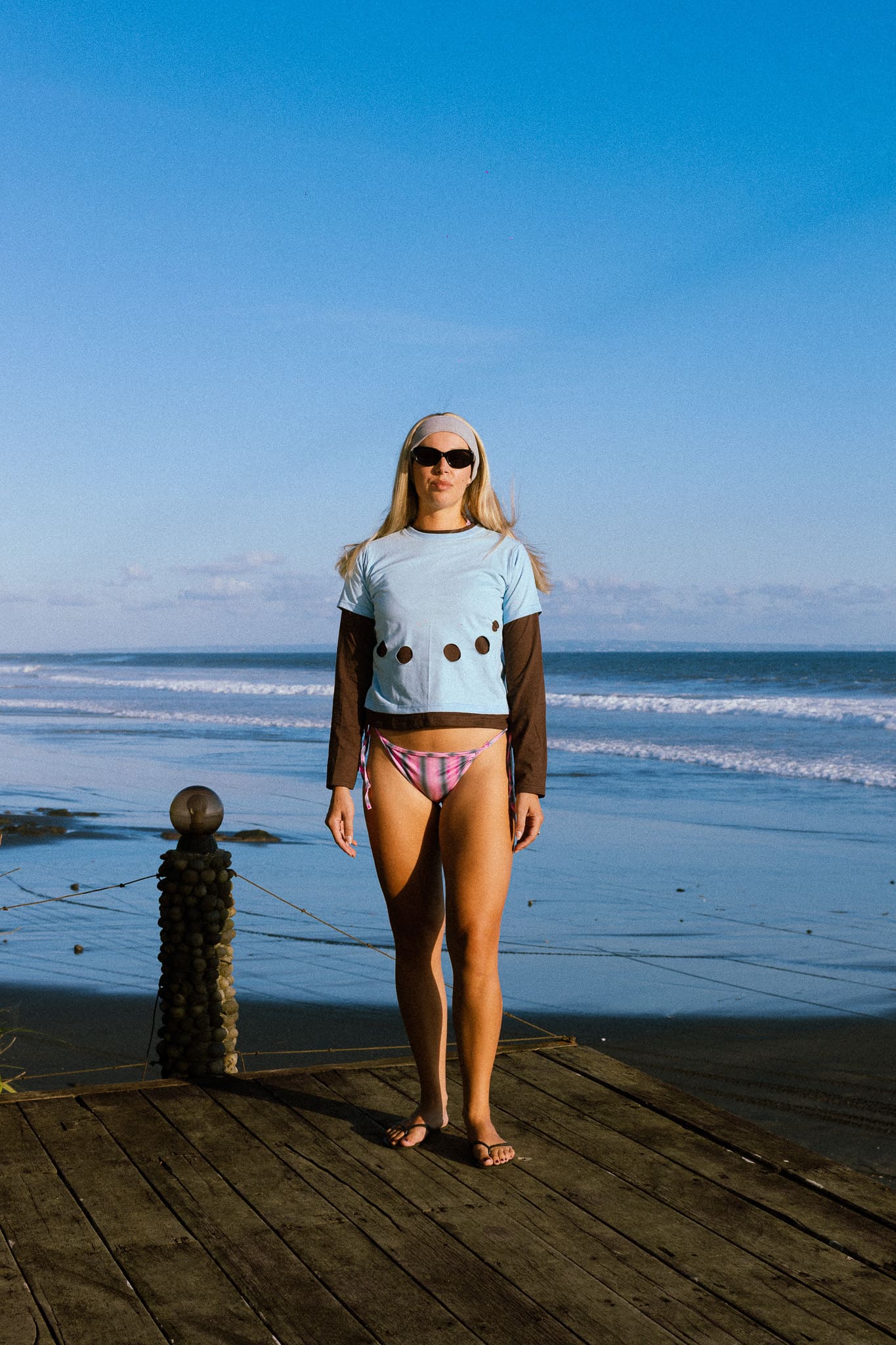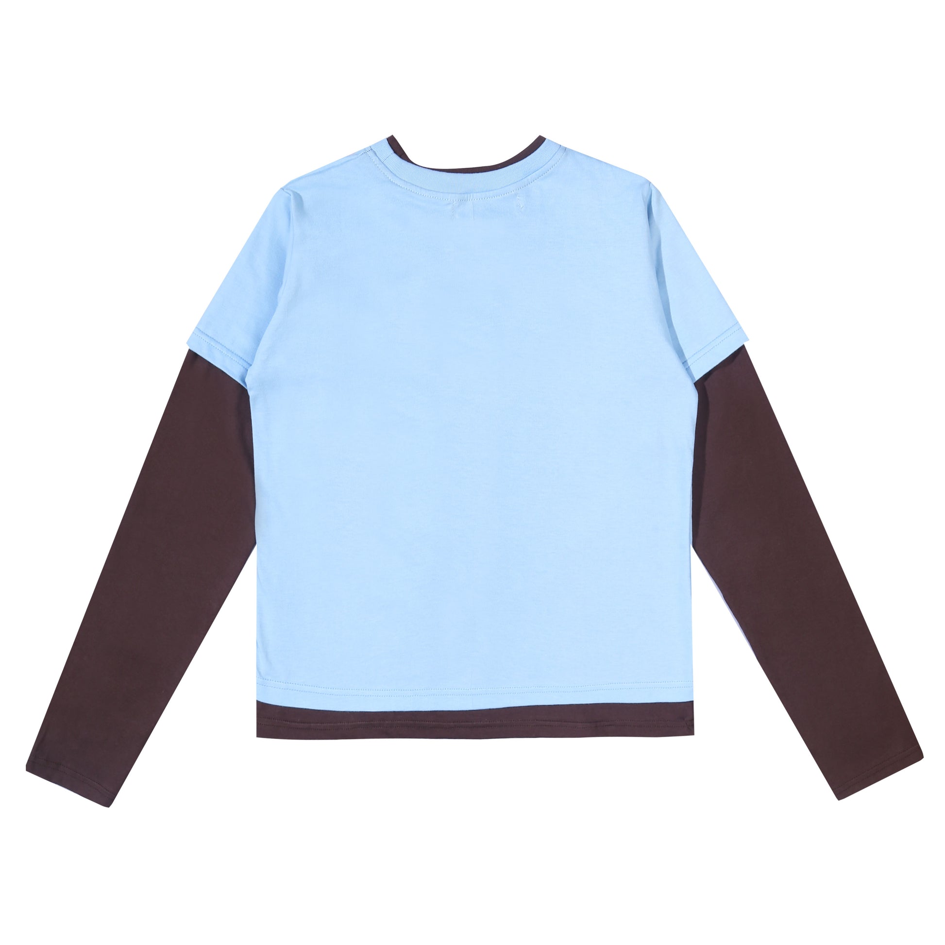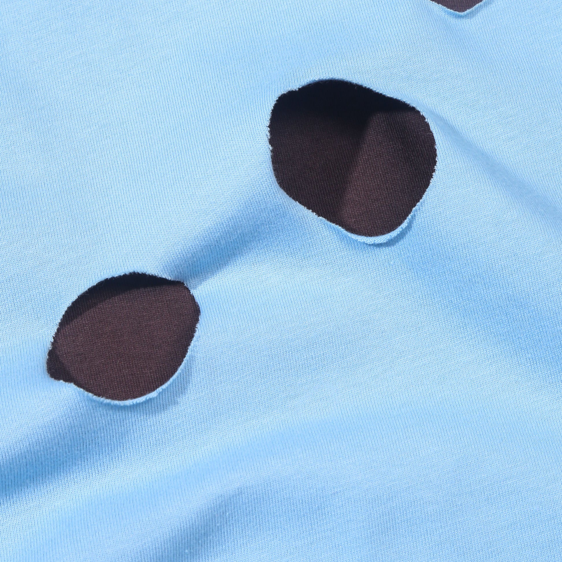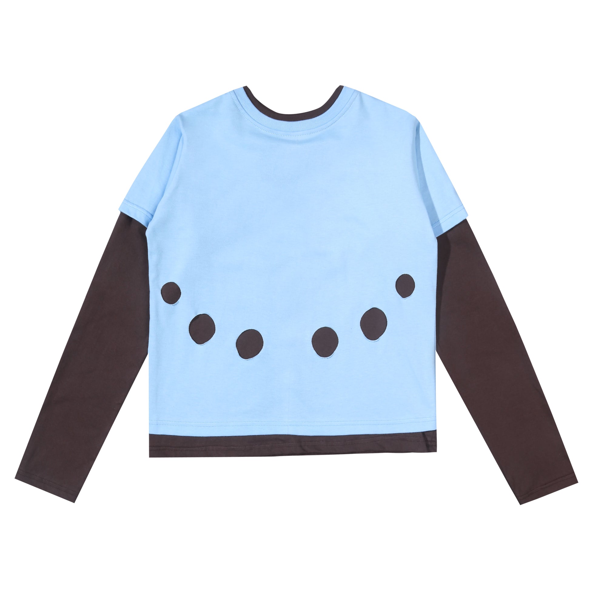 Double layered t-shirt with short and long sleeve. Front layer features laser cut round pattern.