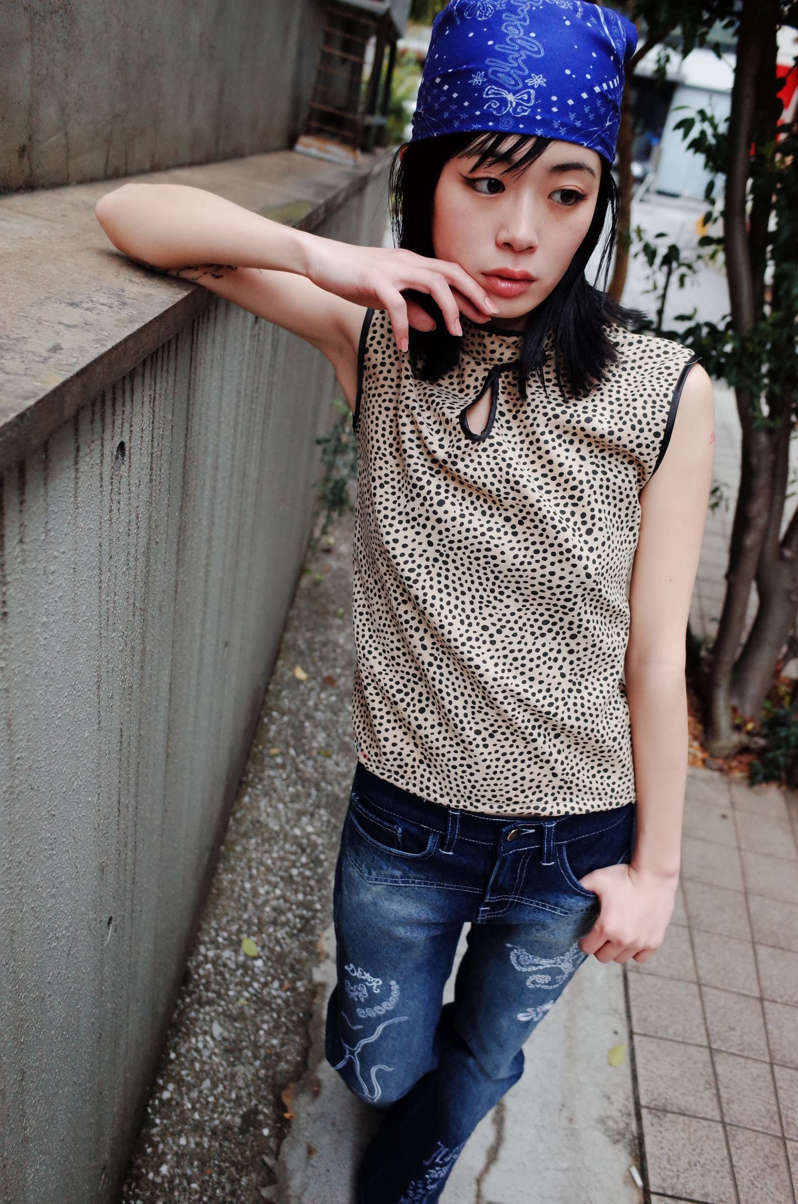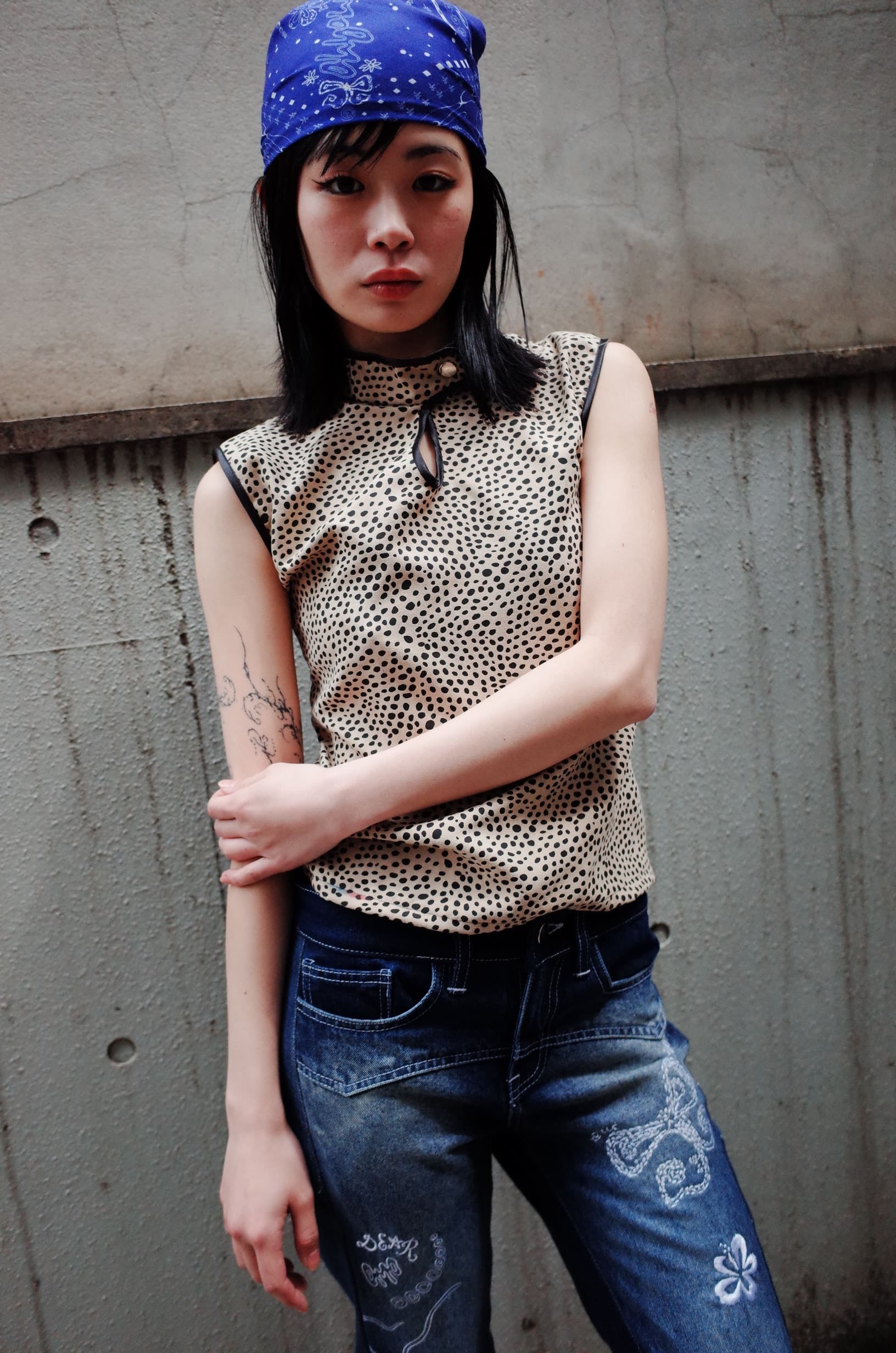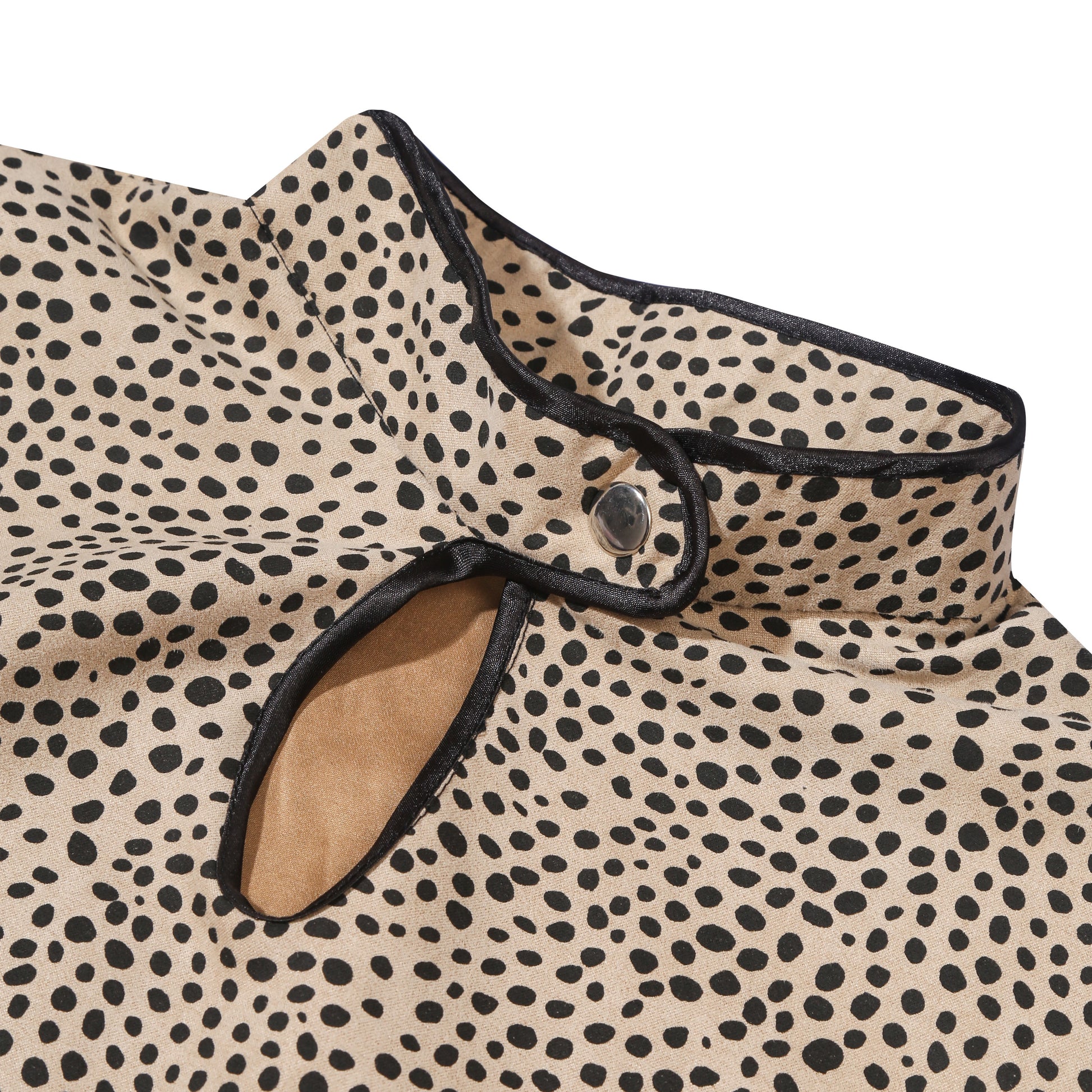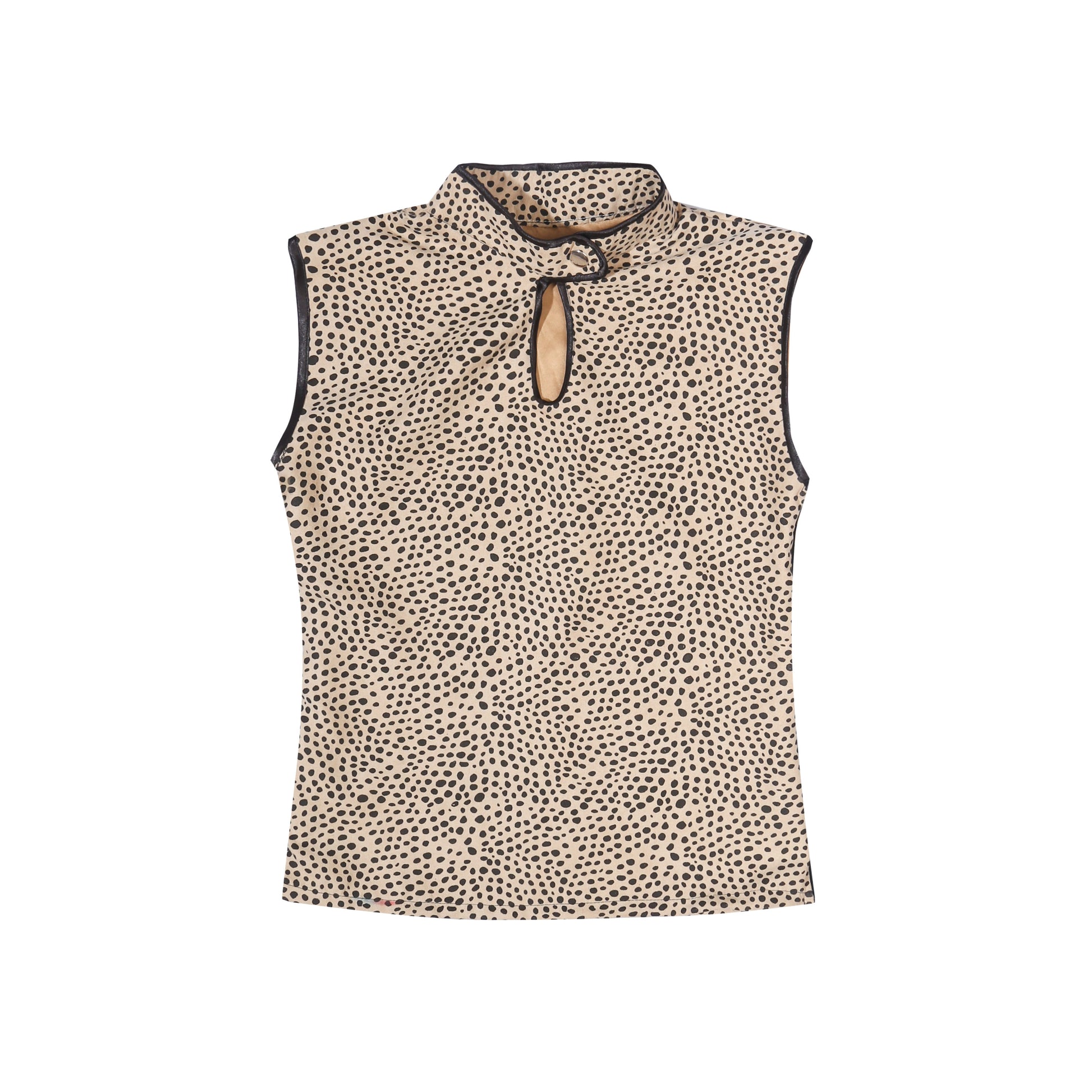 Leopard pattern on suede fabric. Cheogsam style top with side open-end zipper opening and snap button on collar edge.
