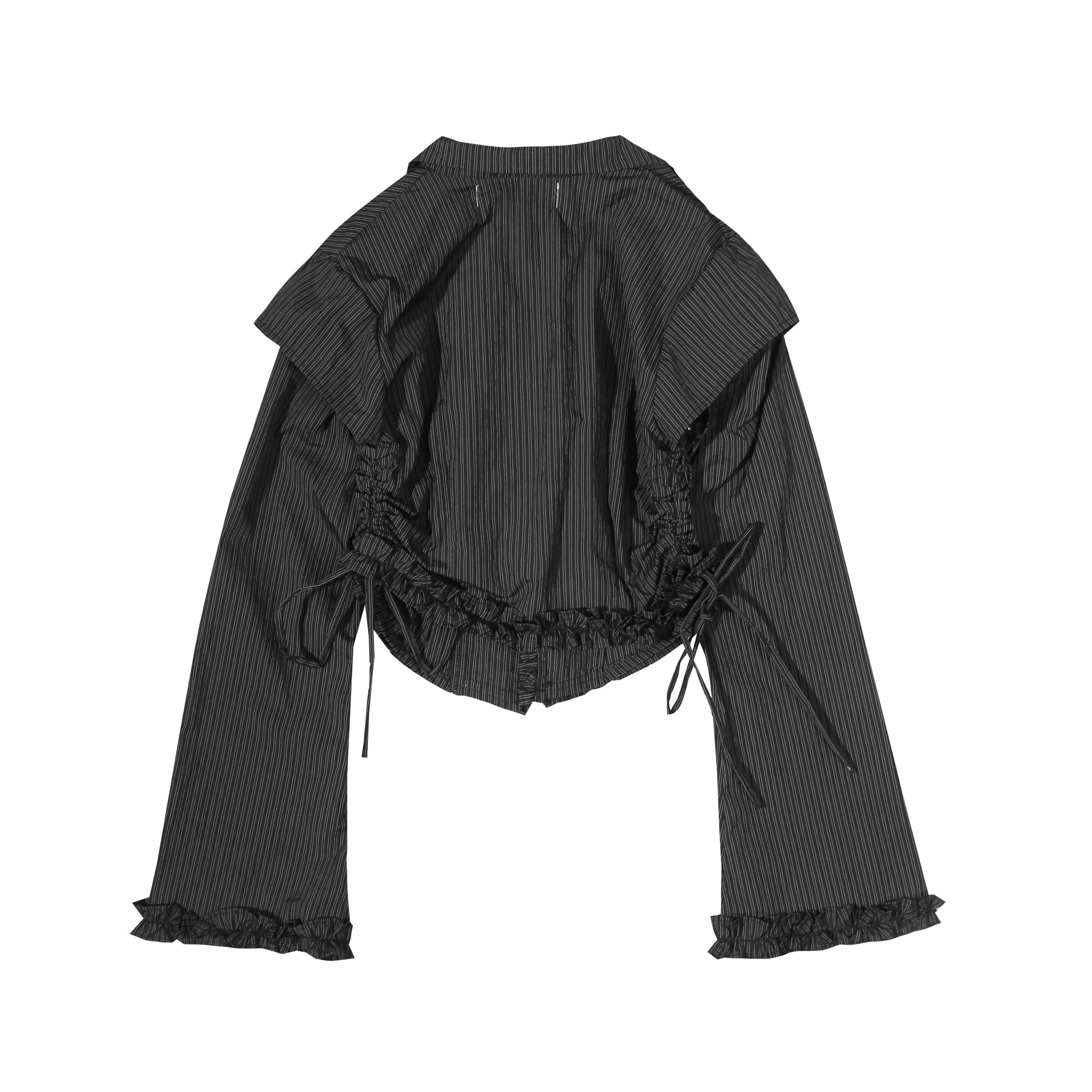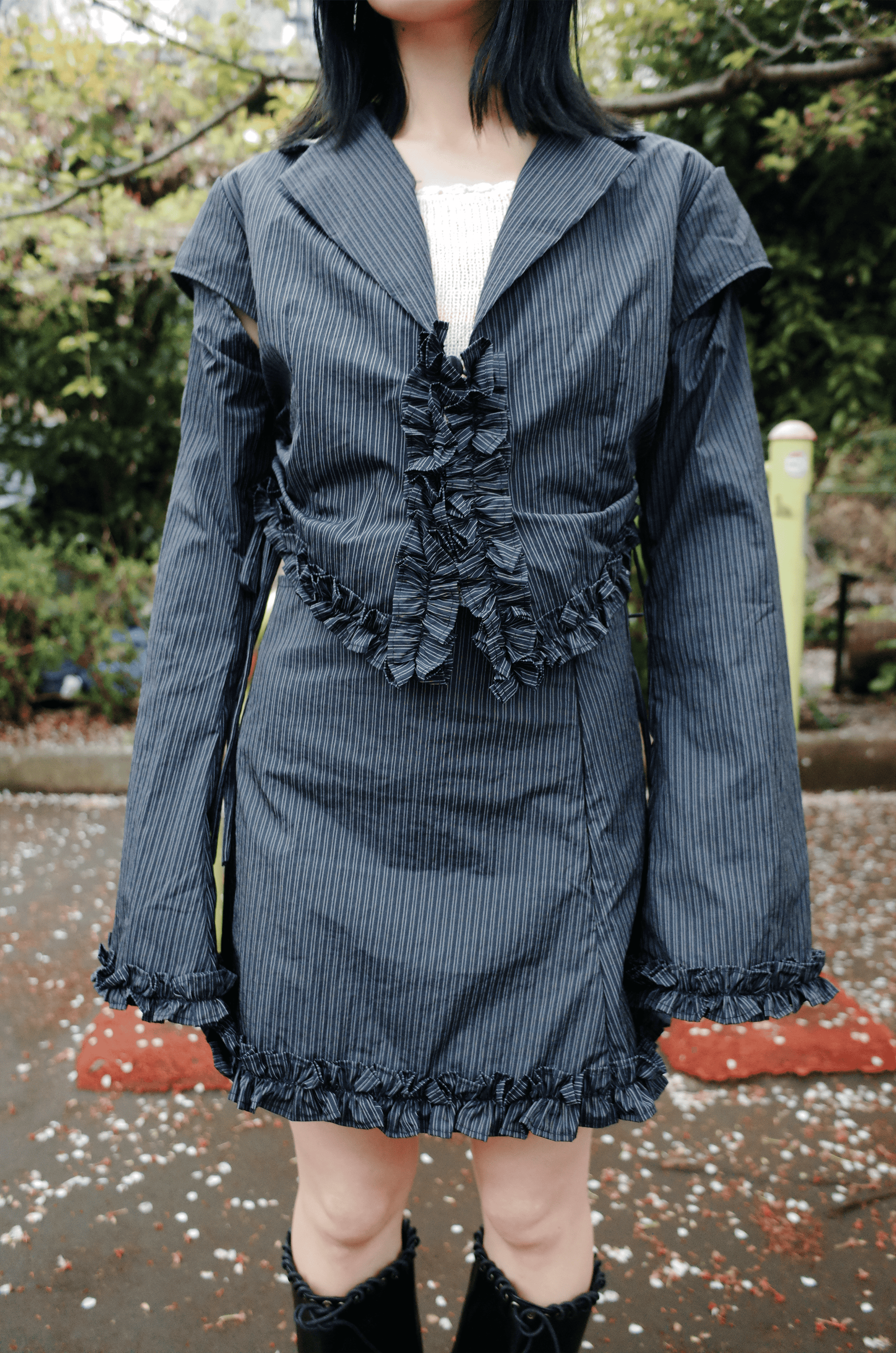 Stripes pattern outer with detatchable arms completed with ruffles on each hemline end and adjustable ruched on the sides.