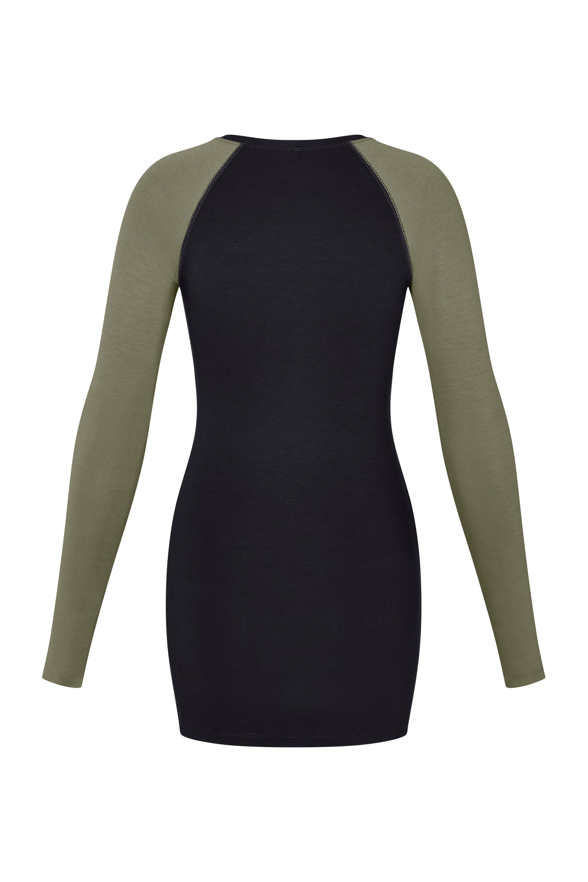 "Designed in a playful two-toned palette, it creates a flattering contrast that highlights your natural shape while keeping the look fresh and versatile. The relaxed raglan cut keeps it comfy, while the mini length brings the playful energy.