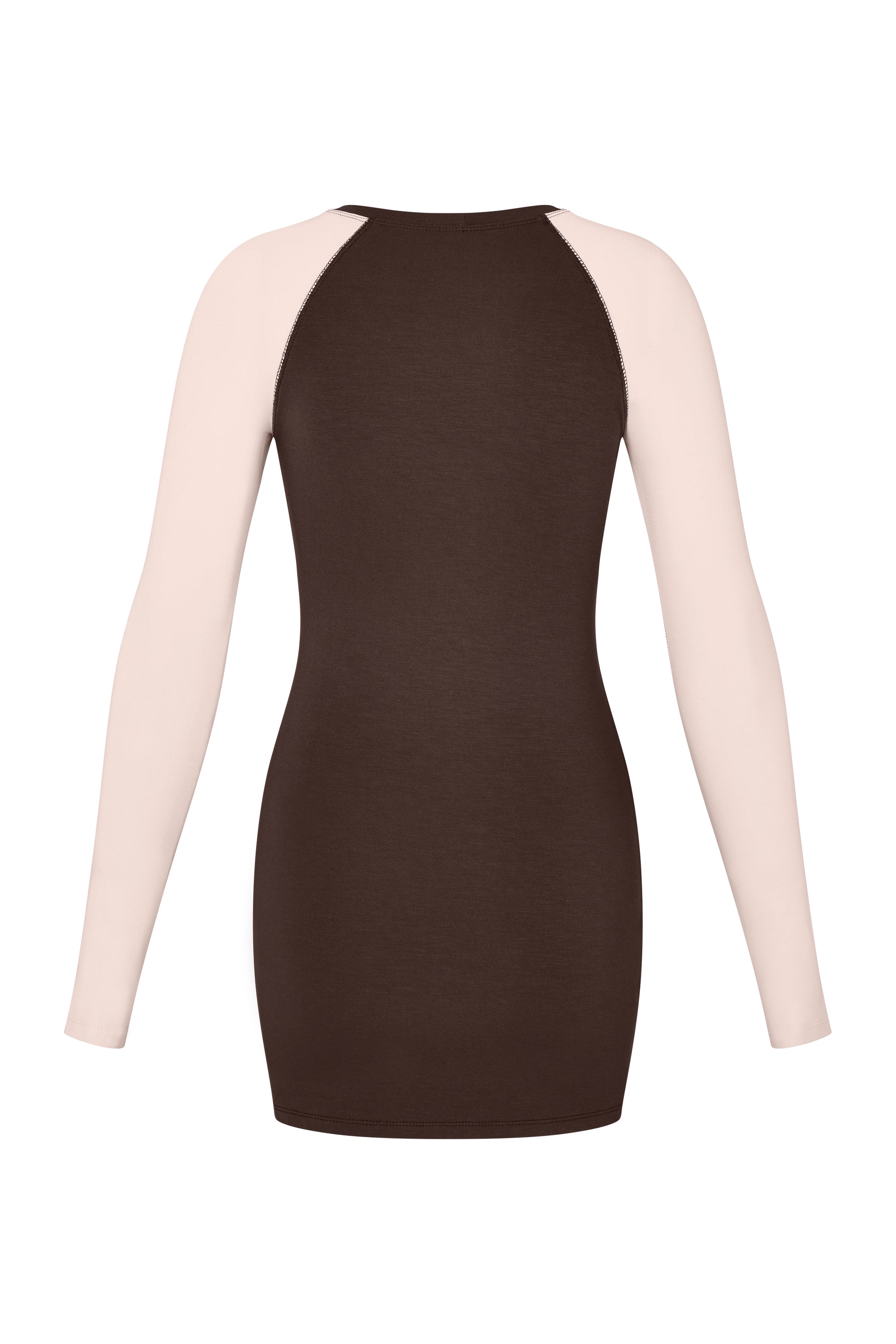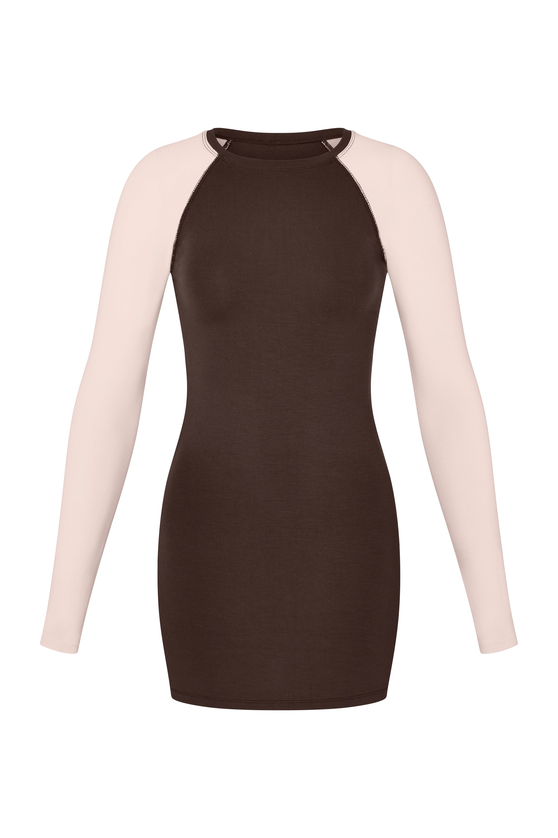 "Designed in a playful two-toned palette, it creates a flattering contrast that highlights your natural shape while keeping the look fresh and versatile. The relaxed raglan cut keeps it comfy, while the mini length brings the playful energy.