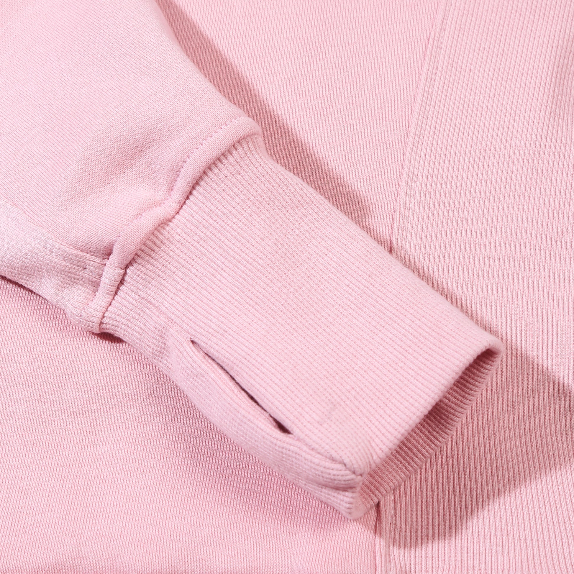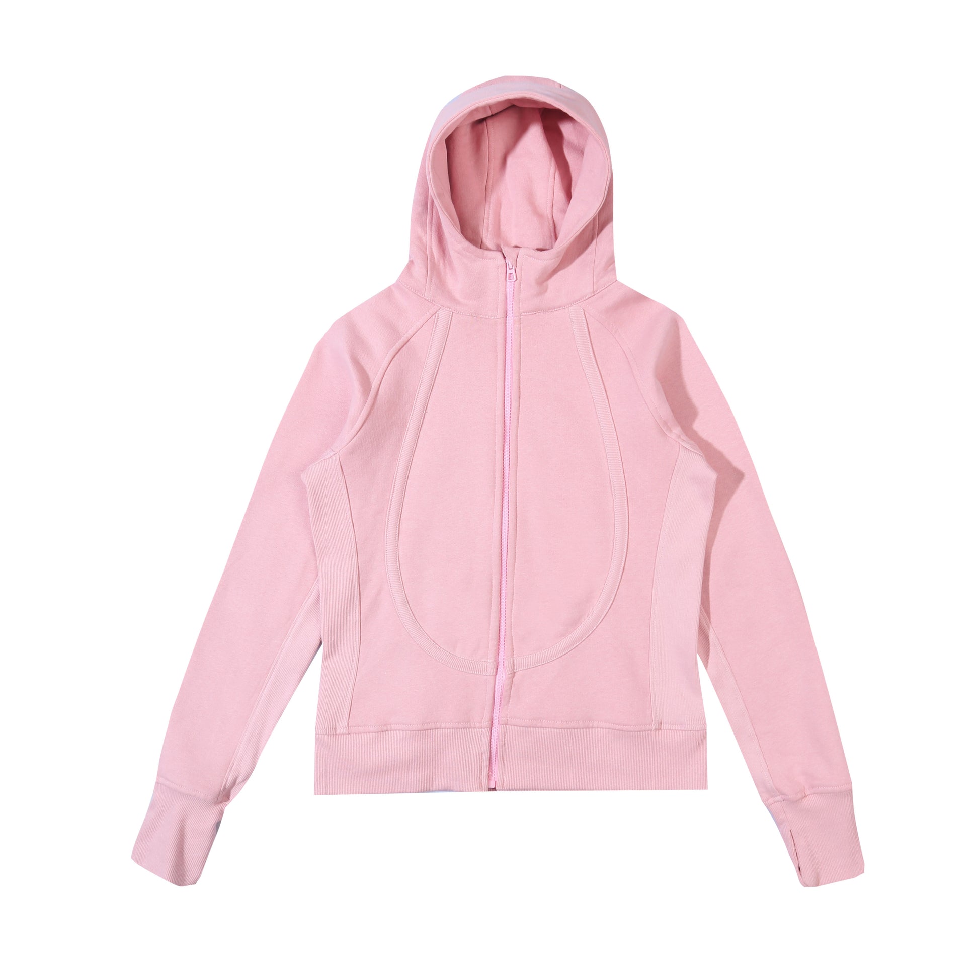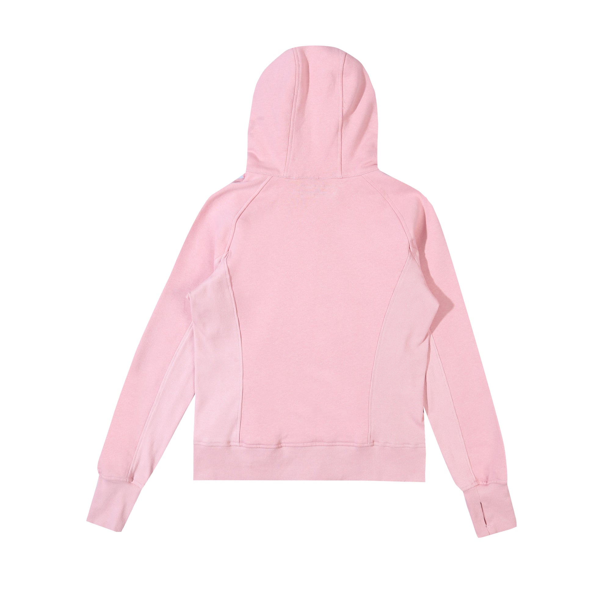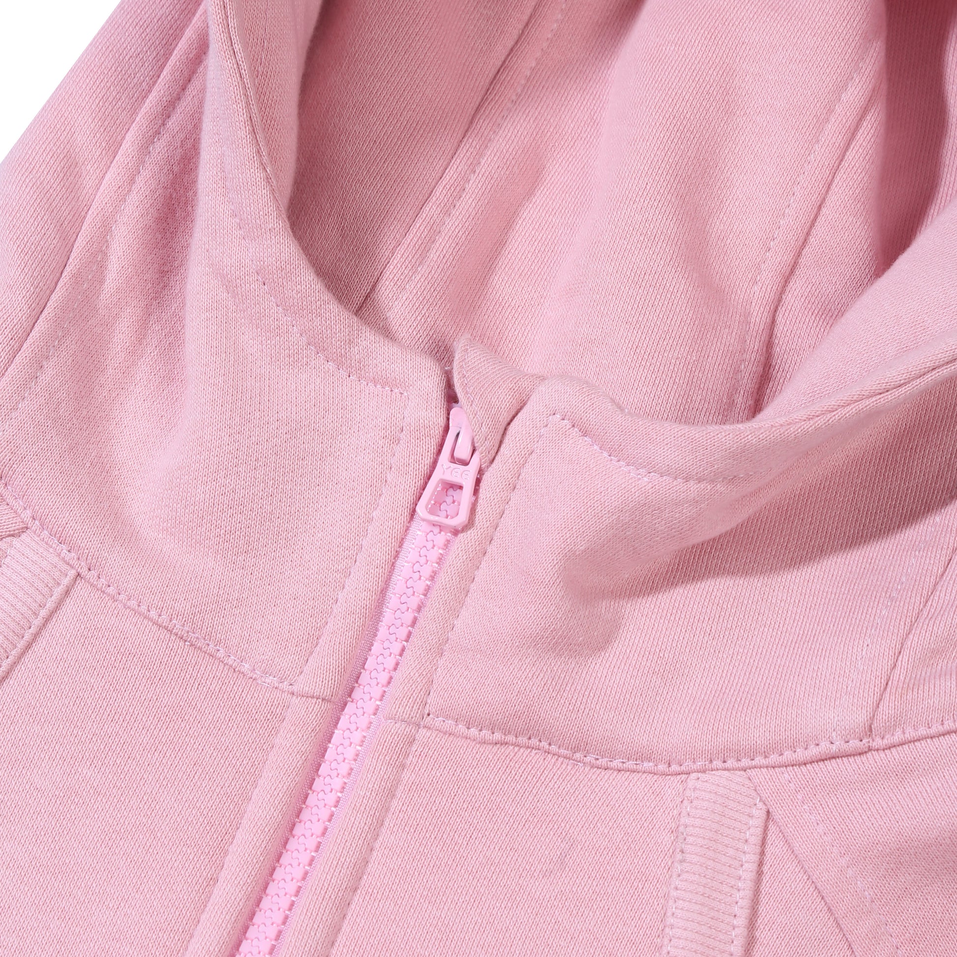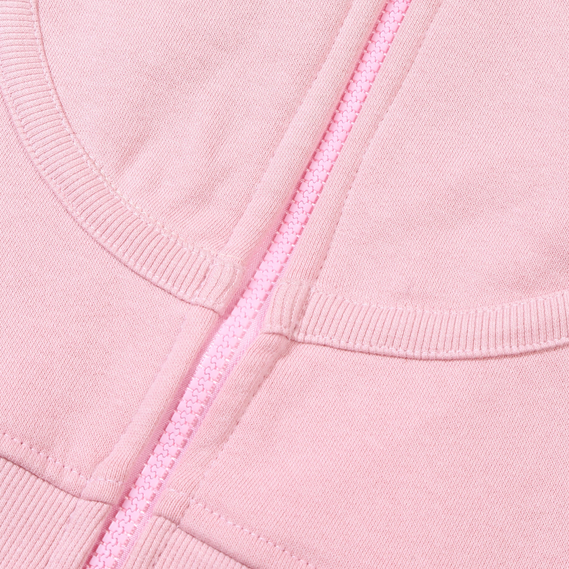 Pink fleece hoodie with high neck collar and YKK open-end central zipper. Features a cut out ribb on sides and