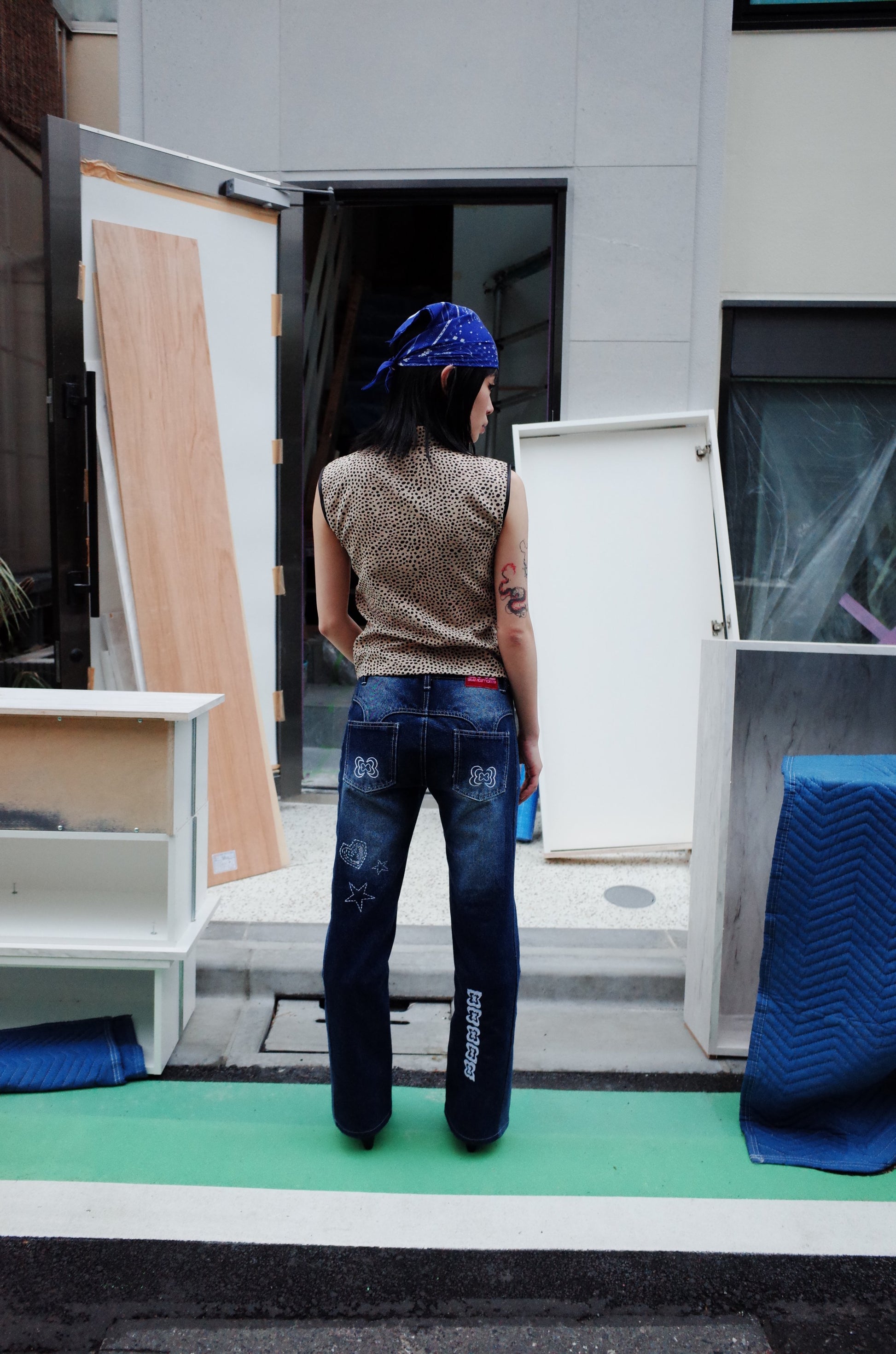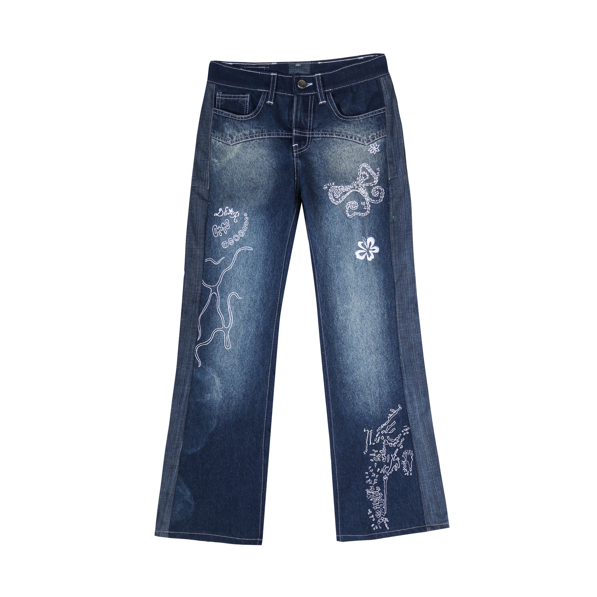 Low waist washed flared jeans with embroidery detail all over the pants. Curved cut out in front and yoke details. Giving Sisterhood of Traveling Pants vibe.