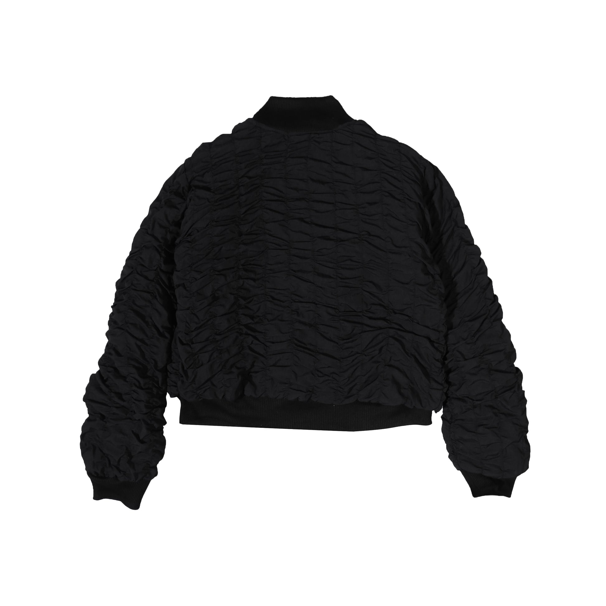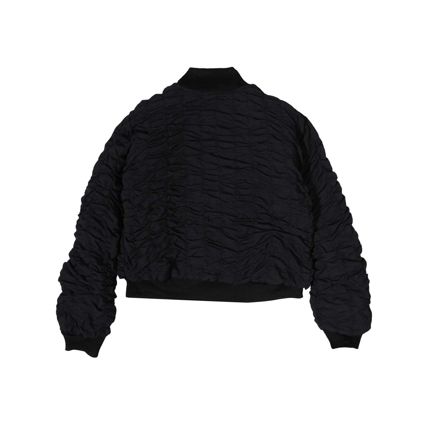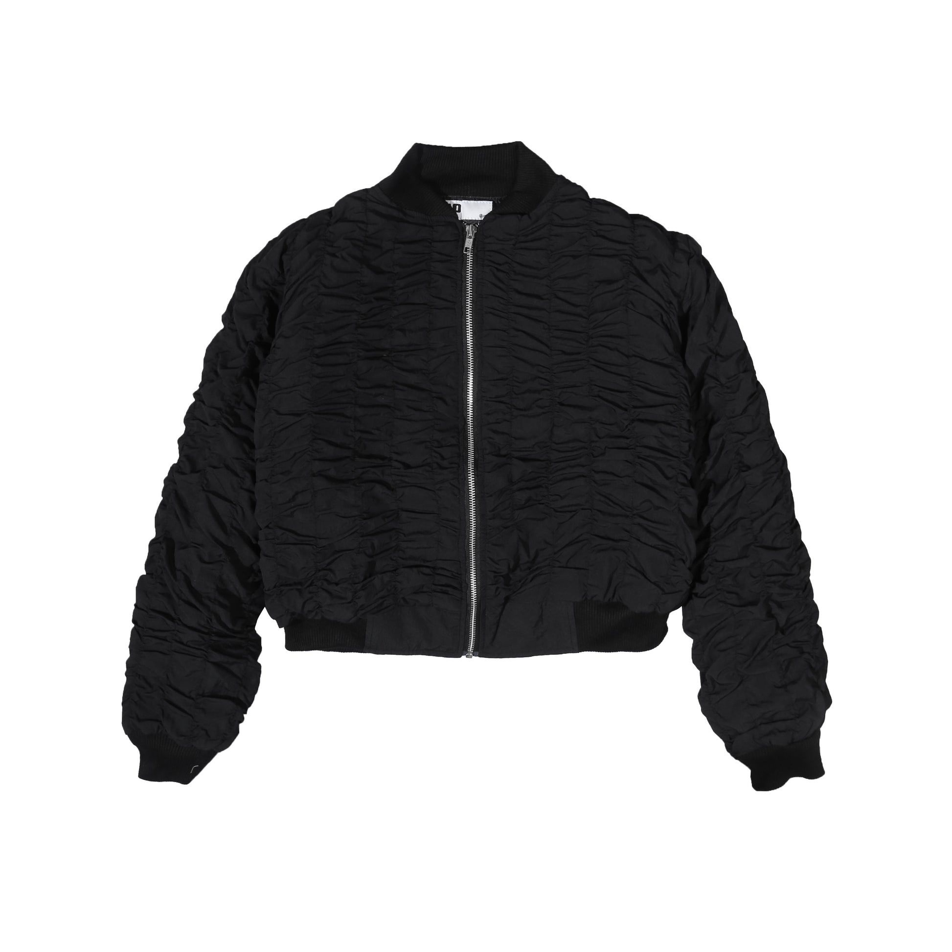 Ruched bomber fit jacket with ribbed cuff and waist band. Front zipper opening. Water repelent fabric.