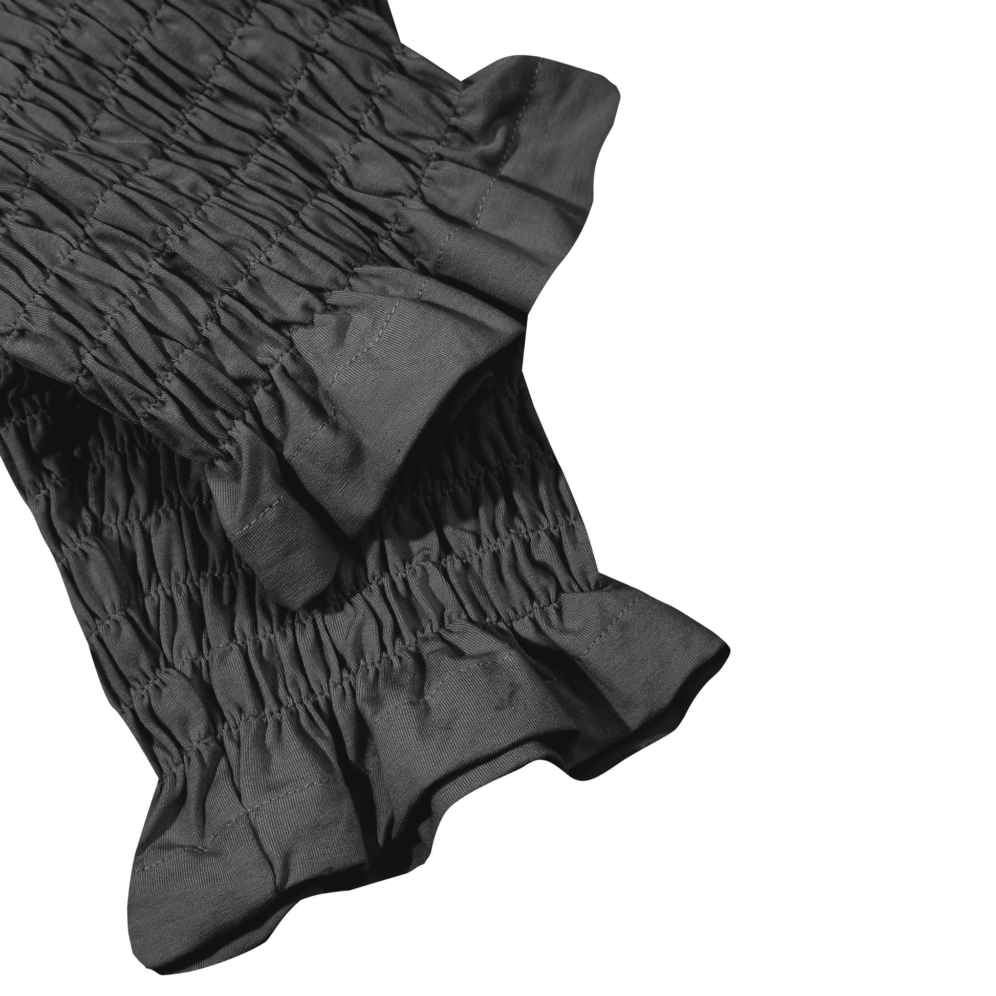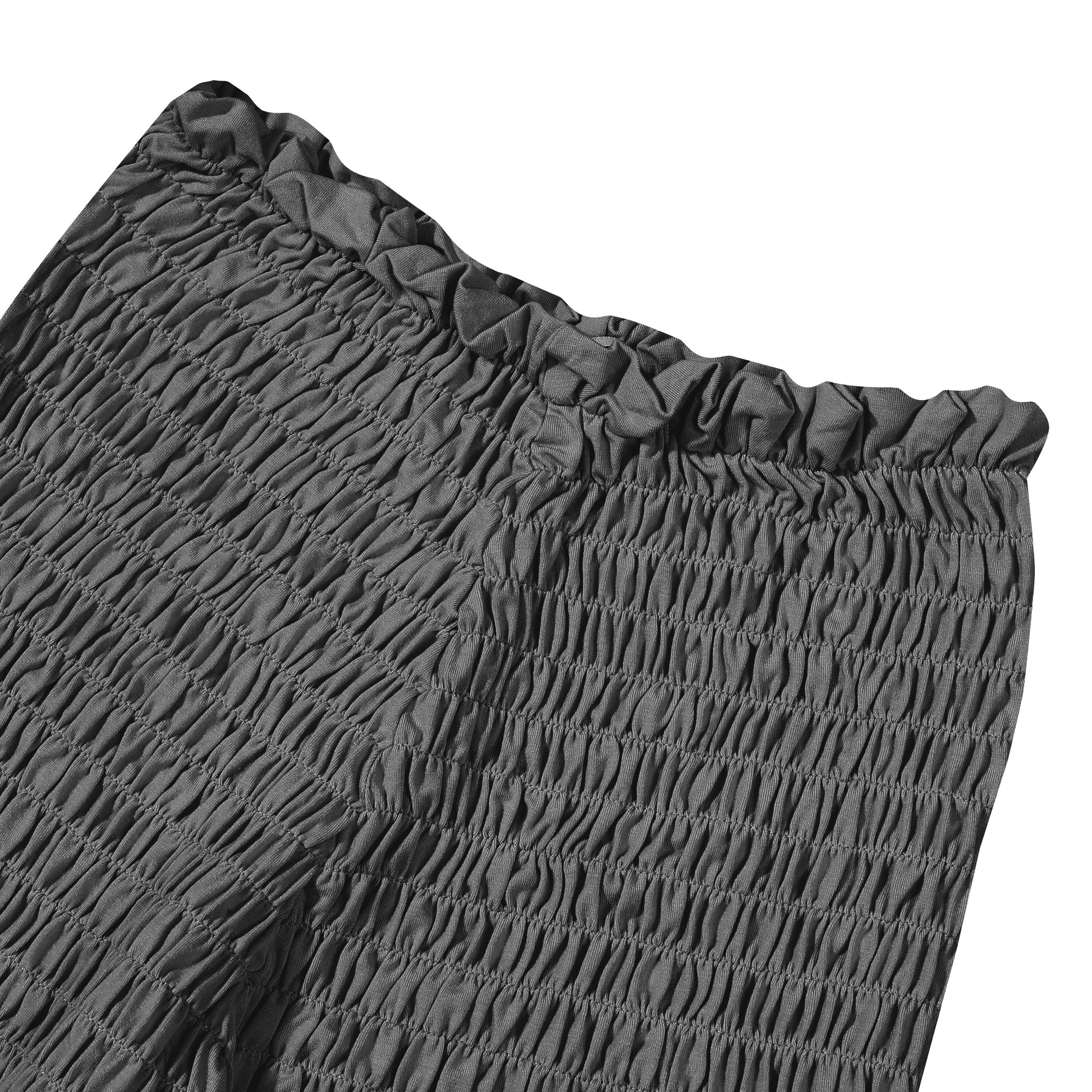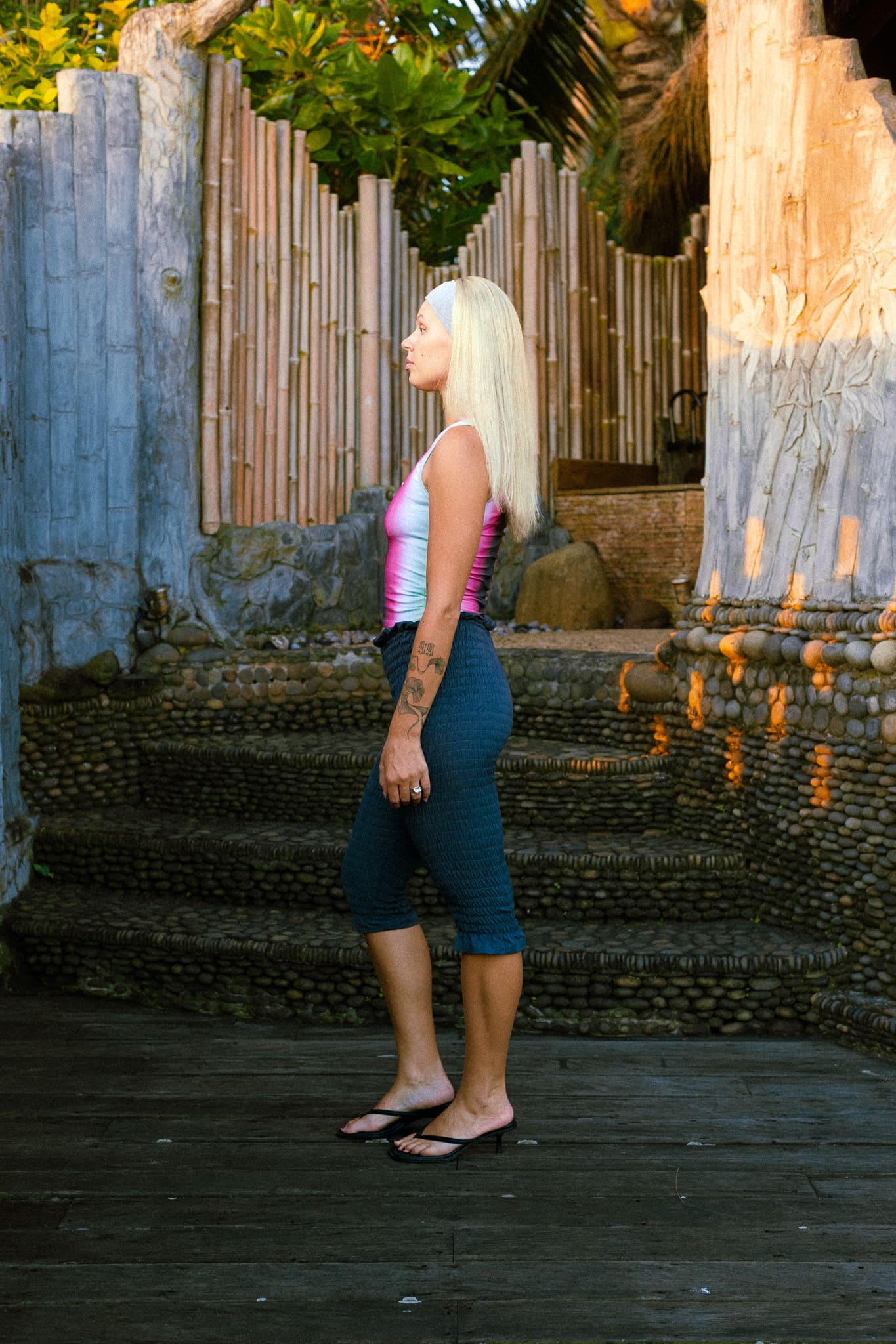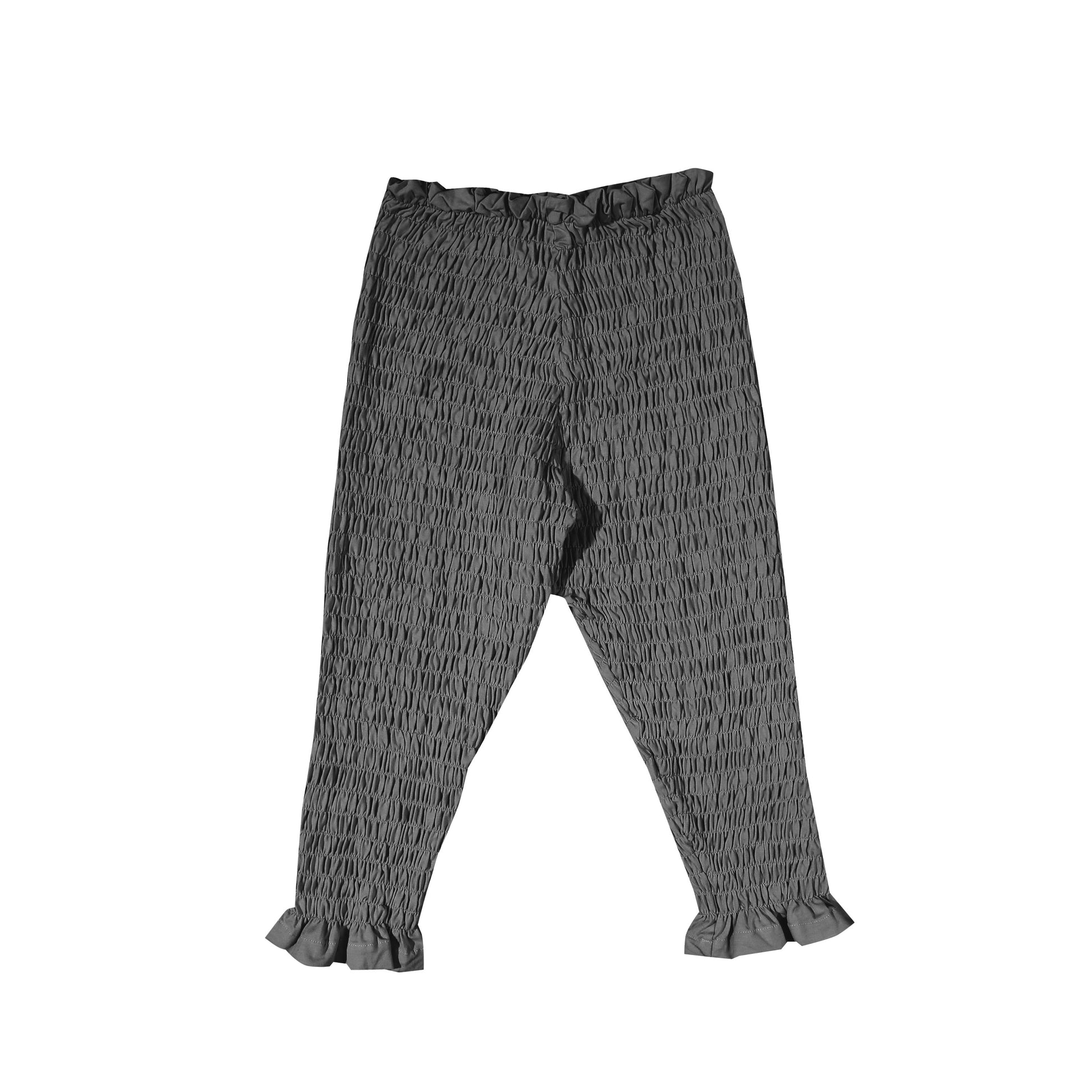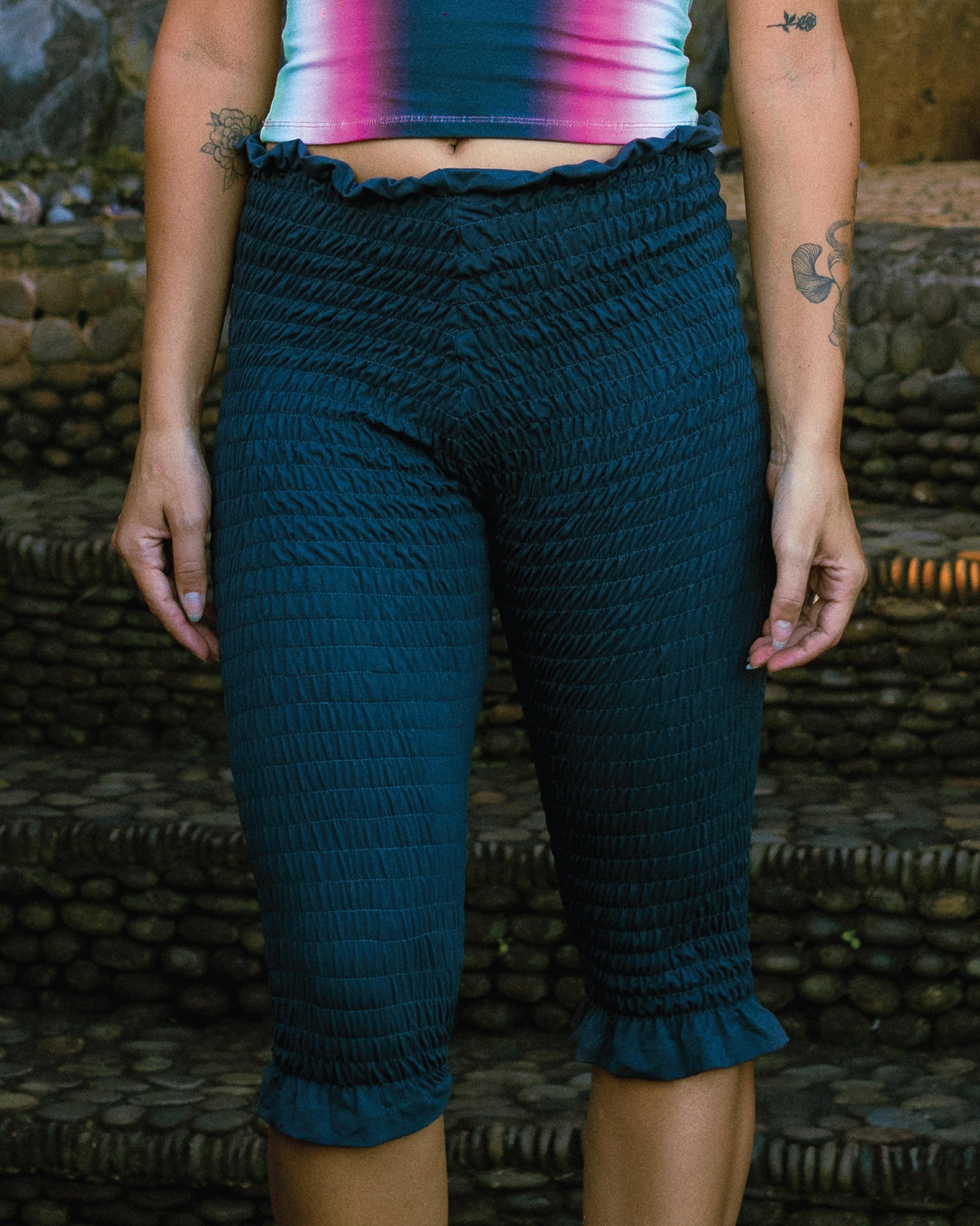 Capri-length leggings with shirring and ruffled details at the waist and hem.