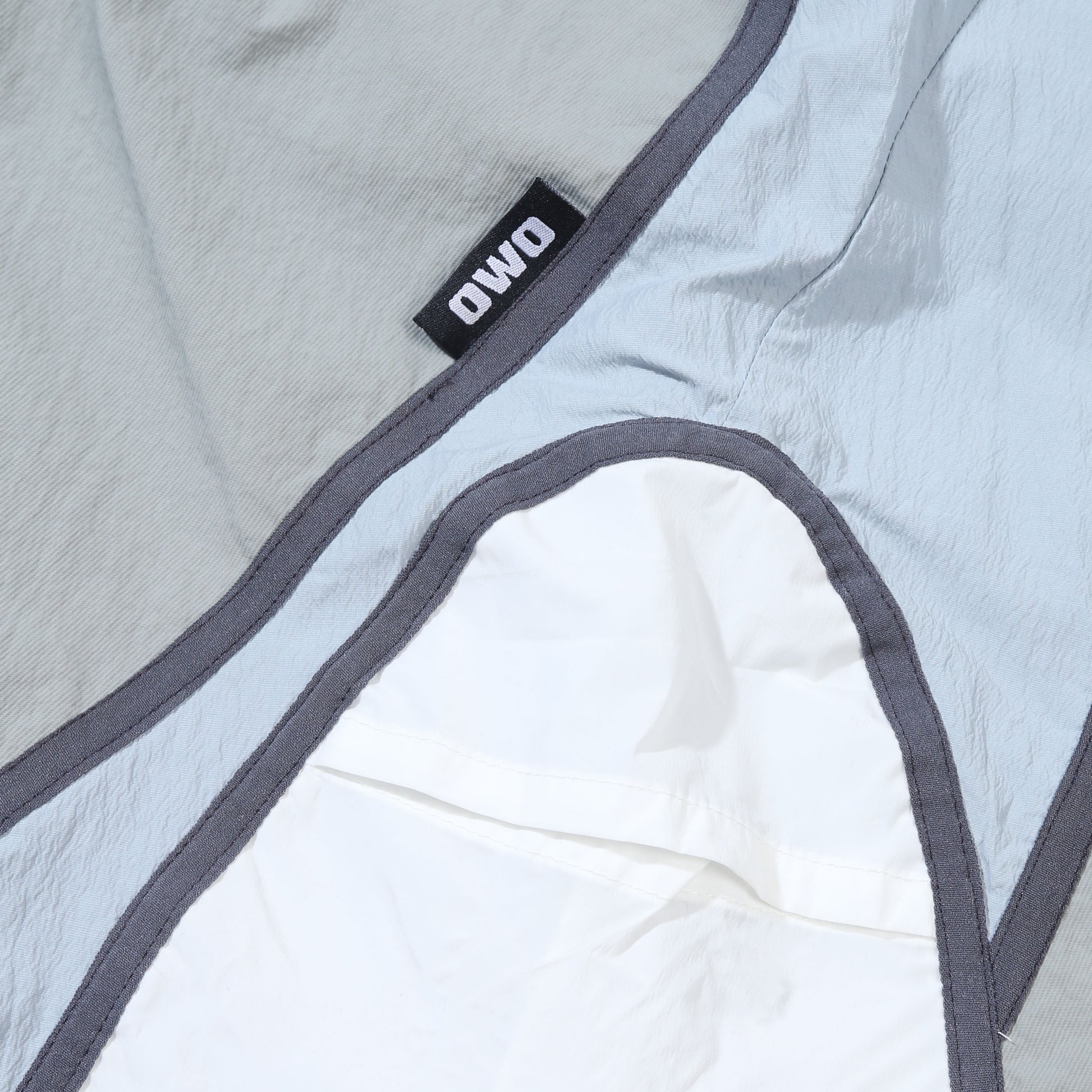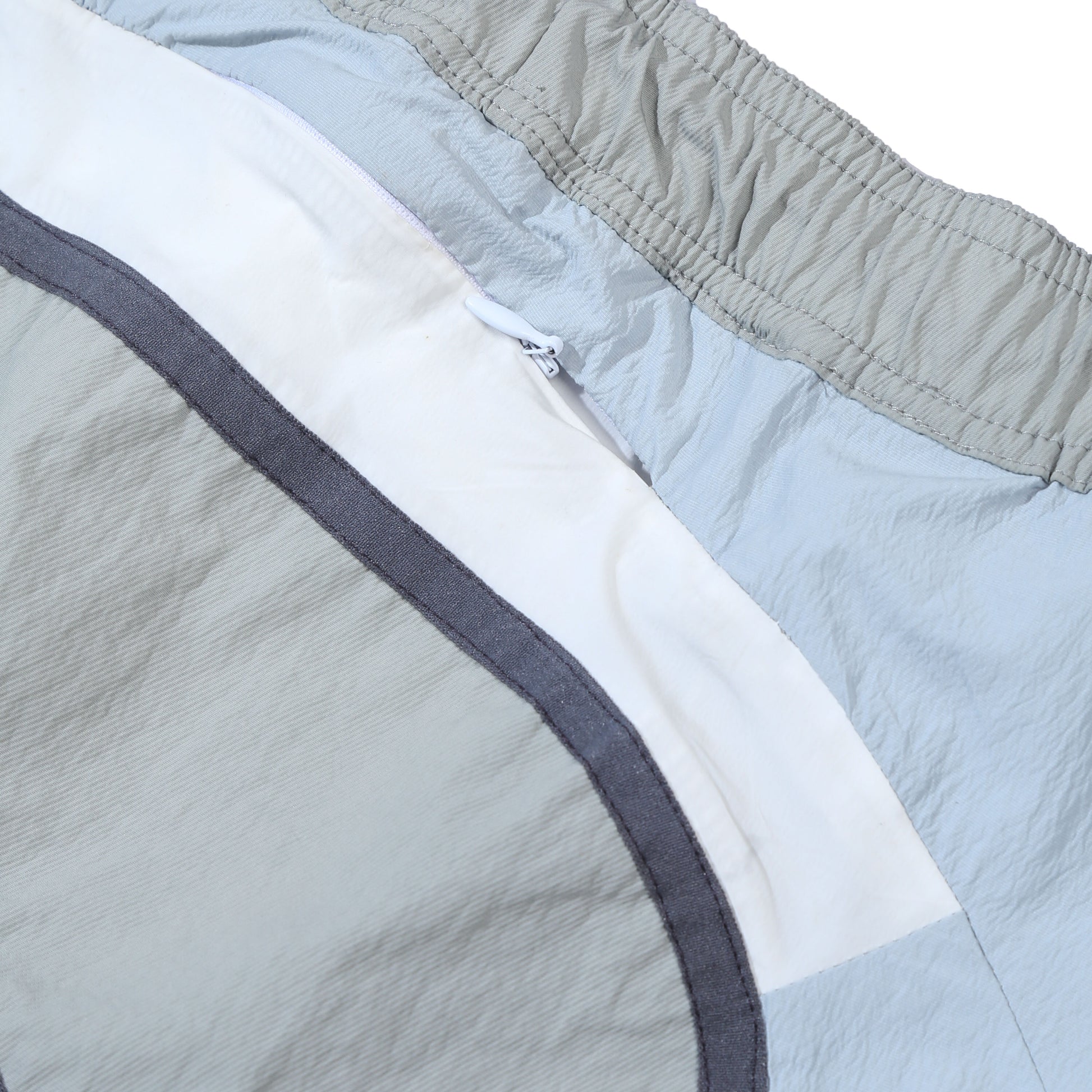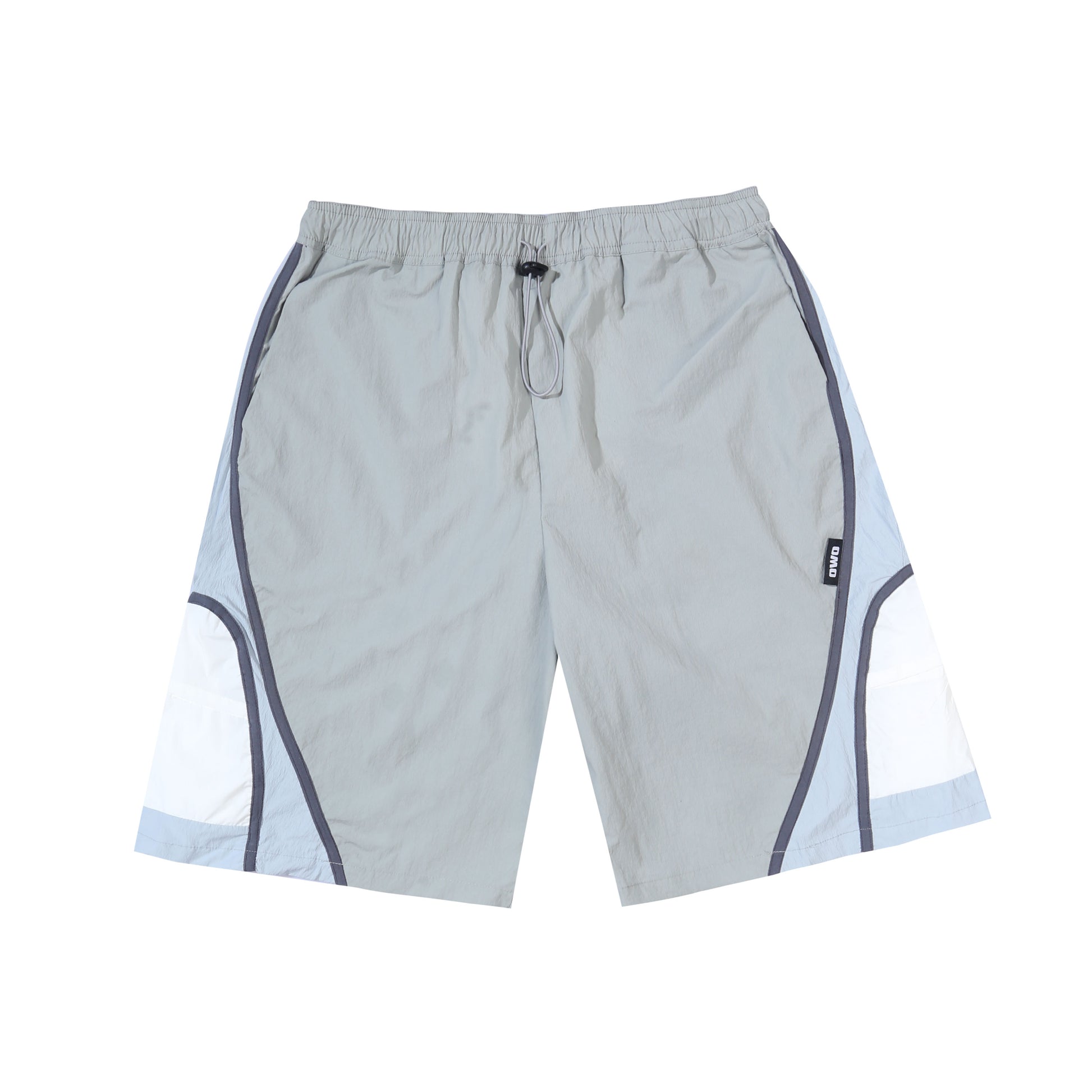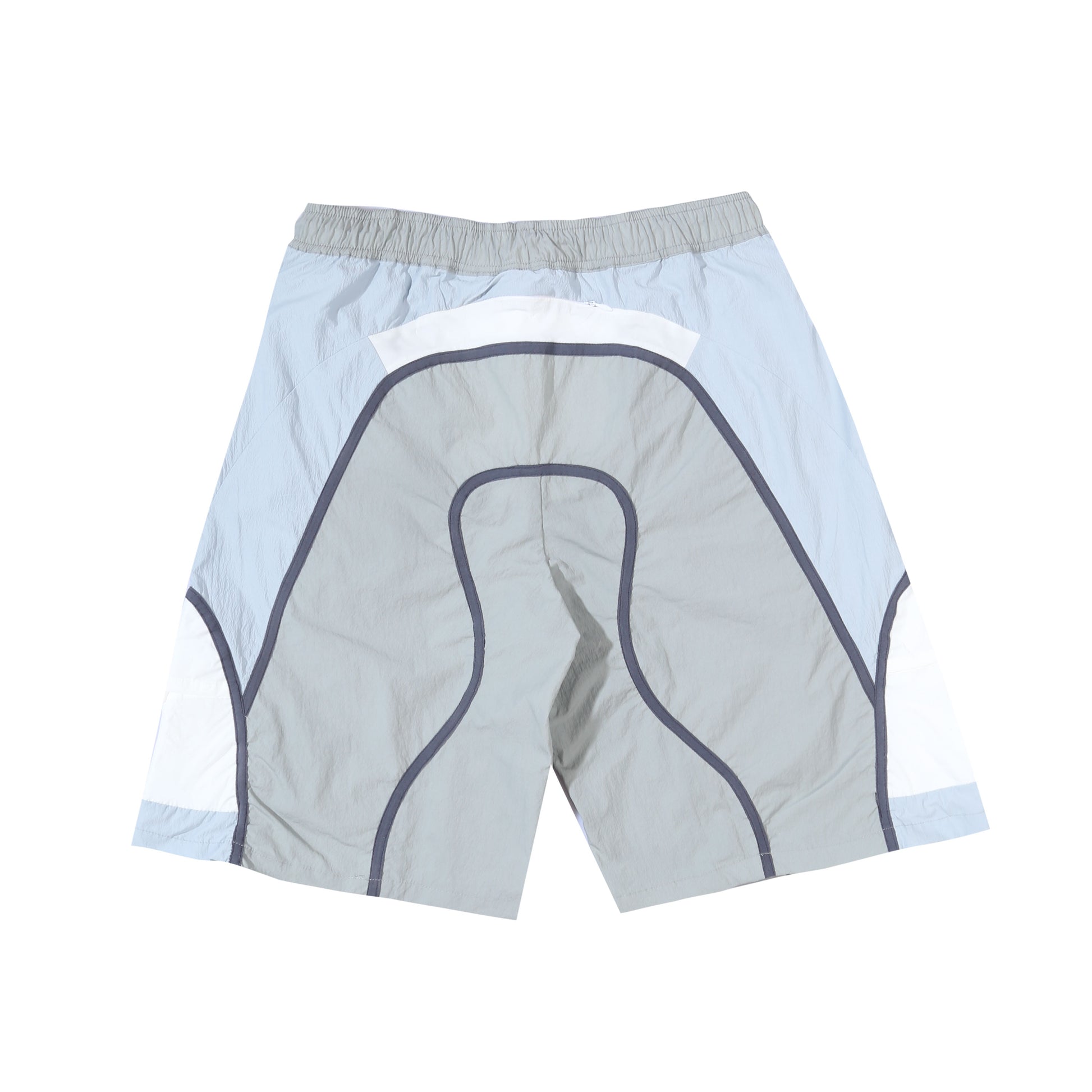 Multi-fabric panel shorts with colorblock construction and curved seam details. Features functional front and back pockets..