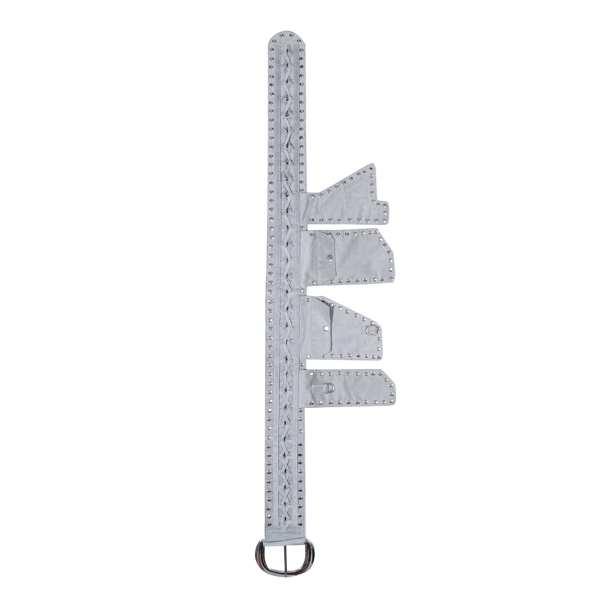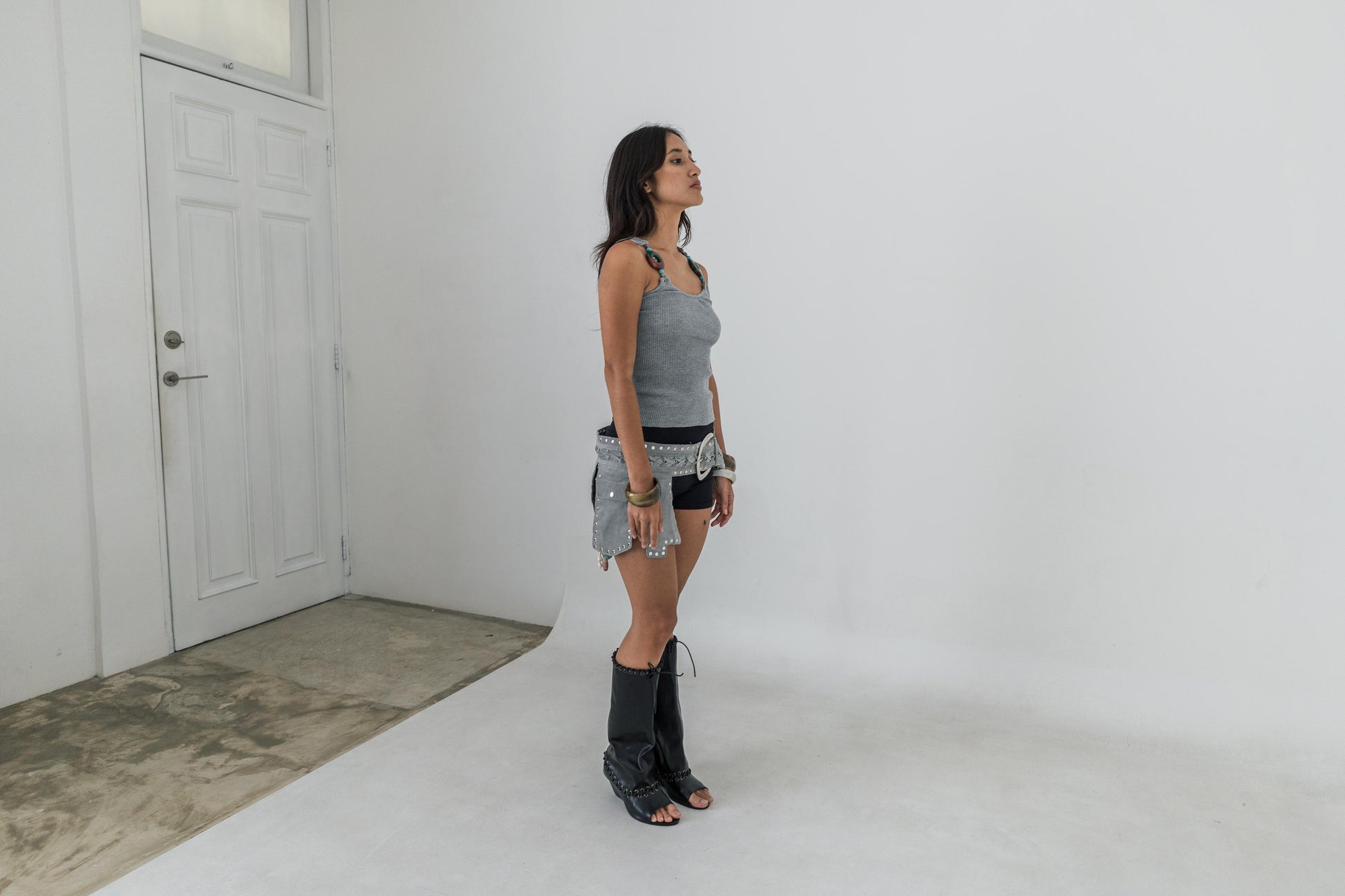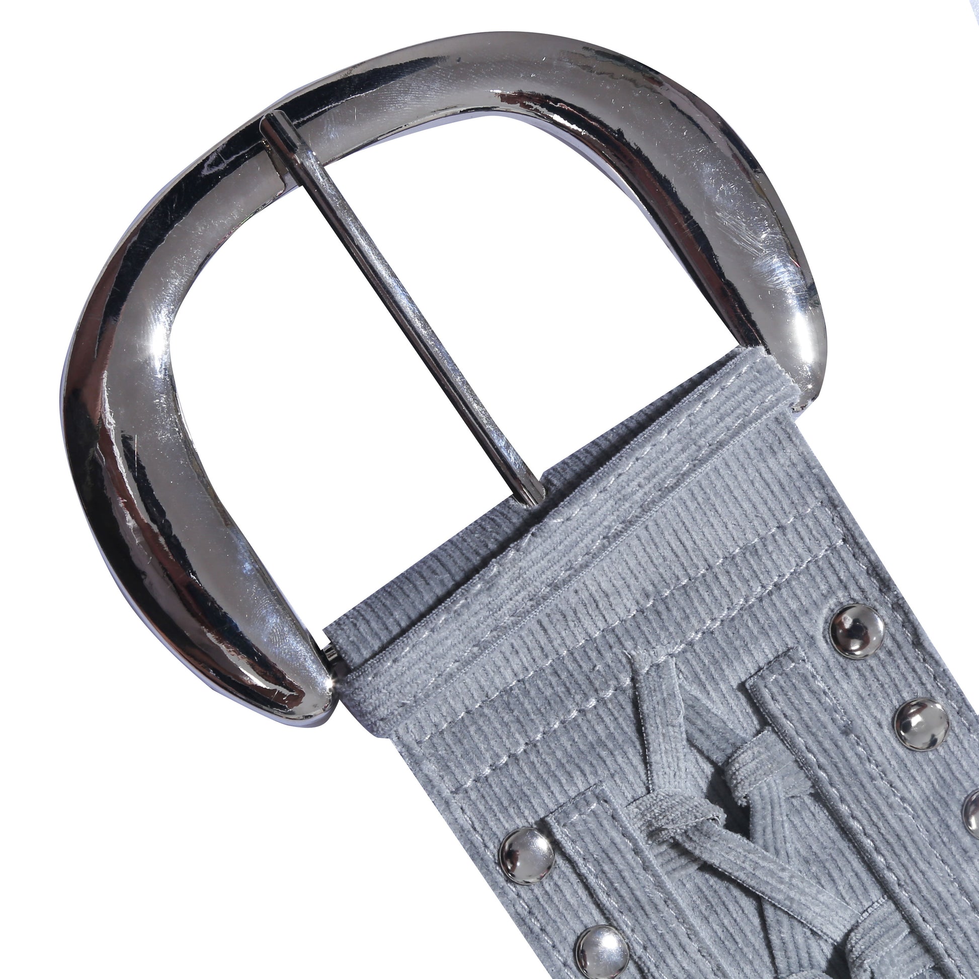 A corduroy utility belt with studs and multipurpose ring as compartments. Inspired by TELLAVISION's signature Utility Star Bag, revamped with an OMO Twist.
