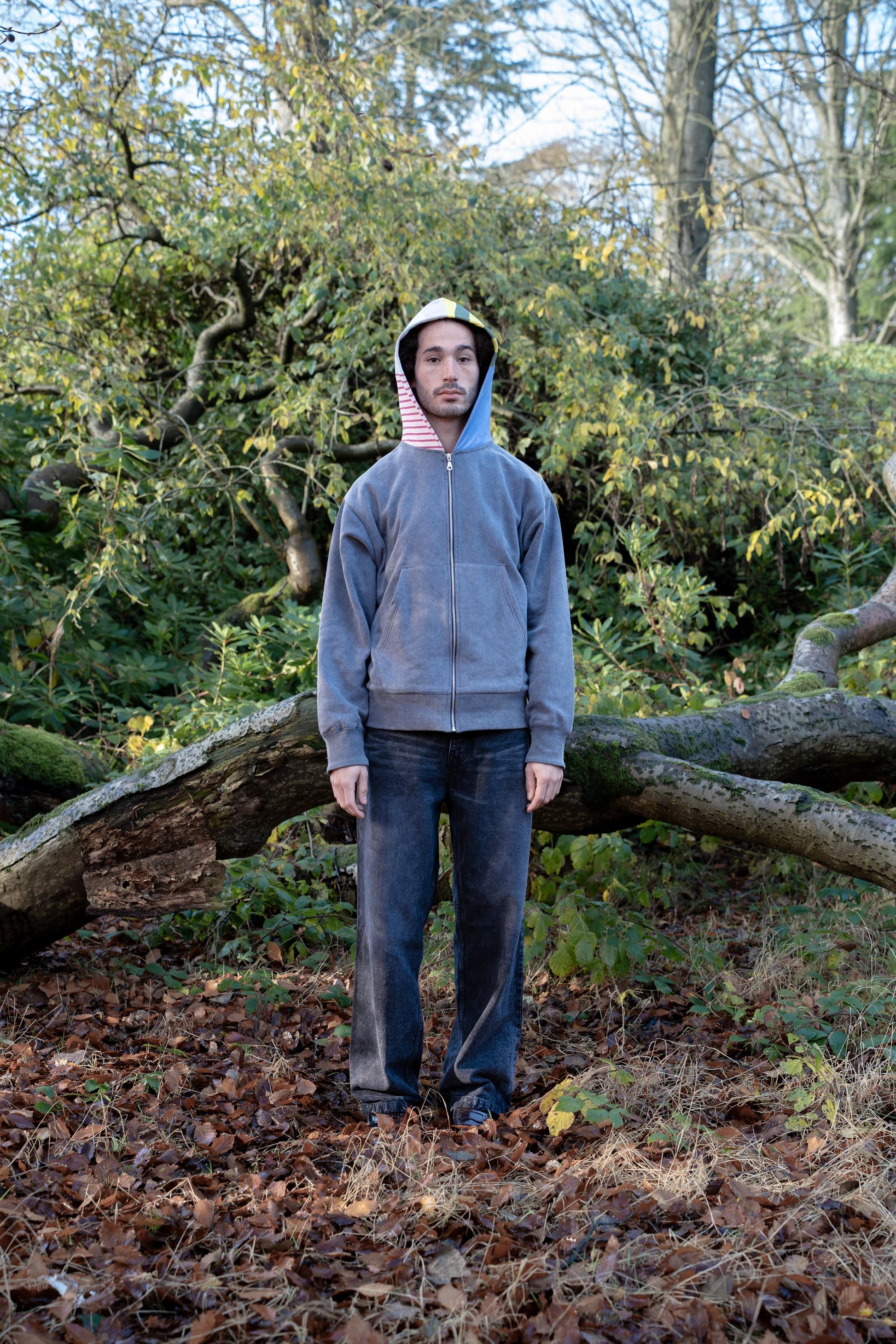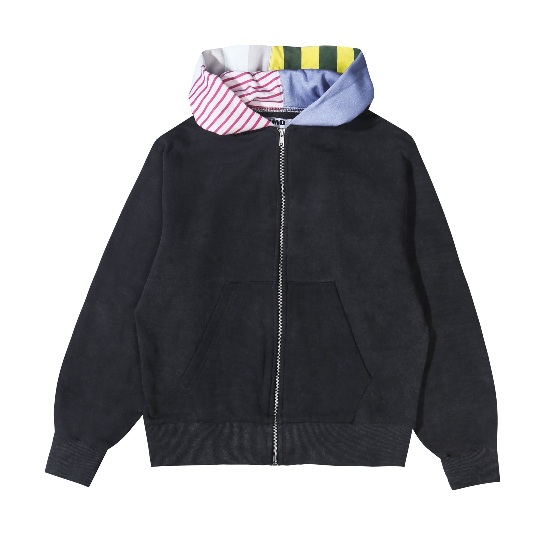 Washed relaxed fit hoodie, midweight 280gsm fleece with ribbed cuffs and zipper opening. Printed on fabric hood detail.