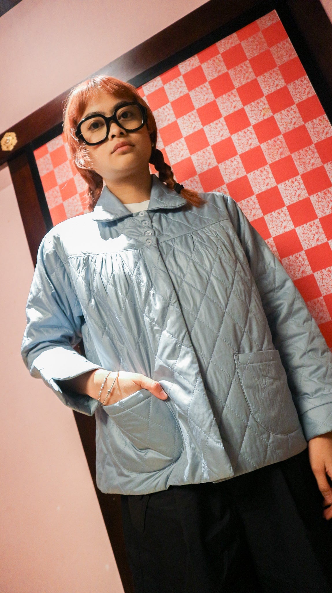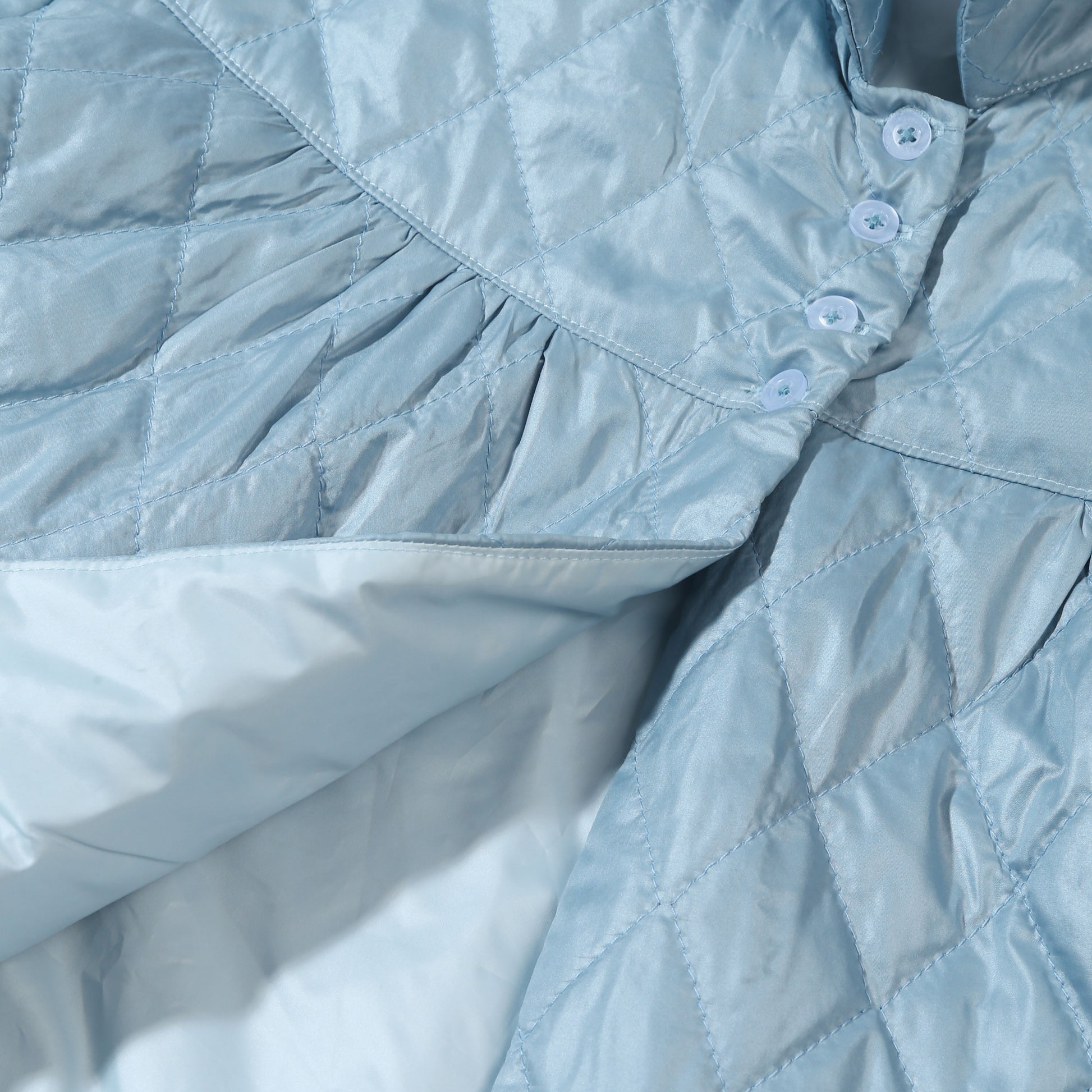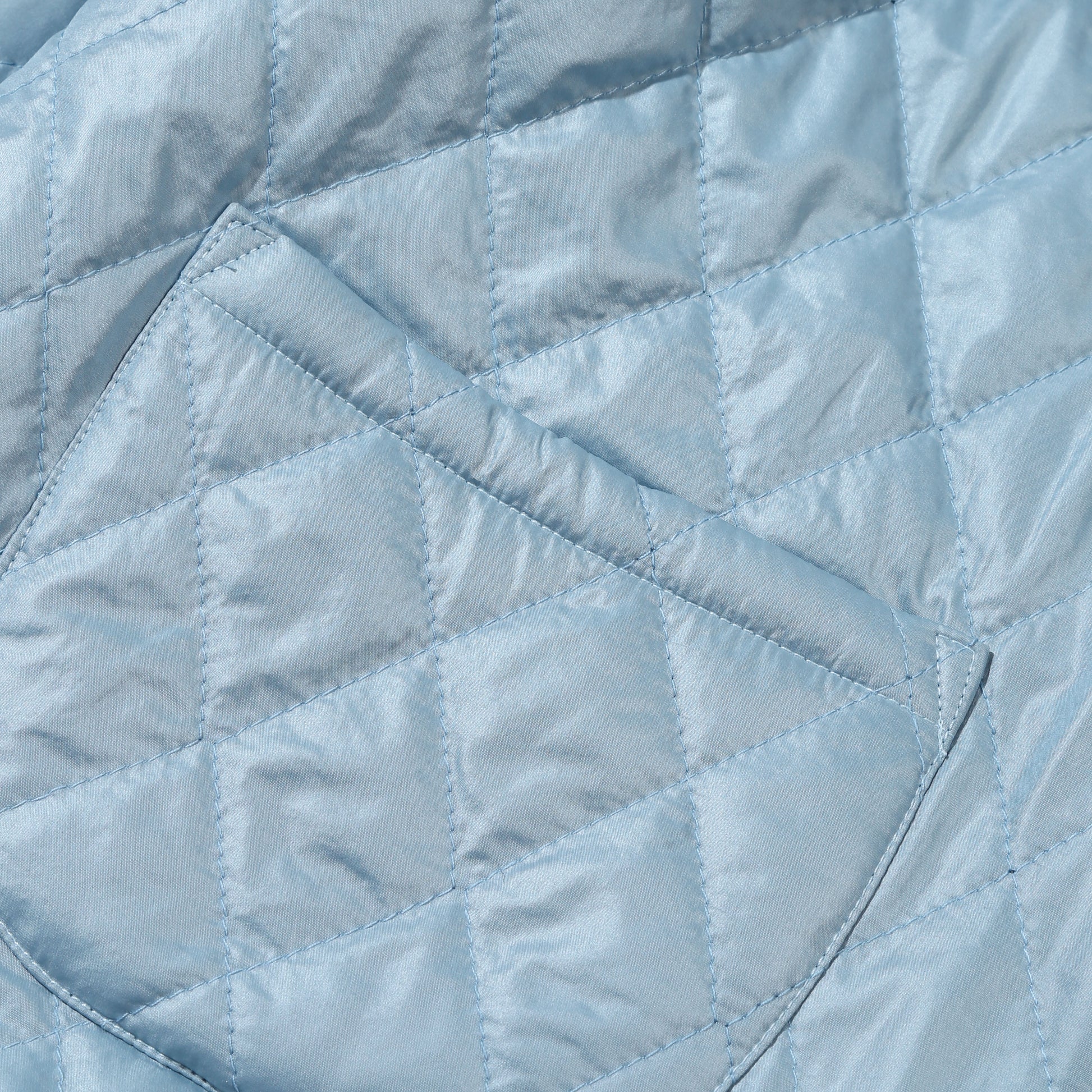 Diamond-quilted jacket from lightweight nylon fabric. Feature four shirt buttons and two patch pockets. Rounded flat collar.
