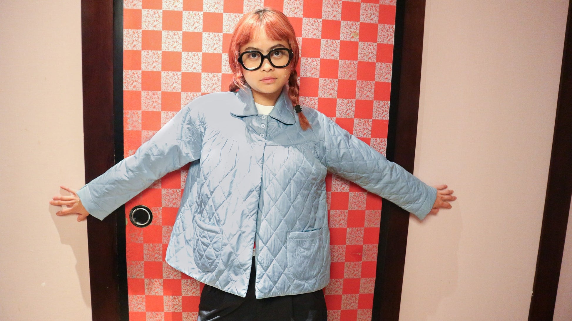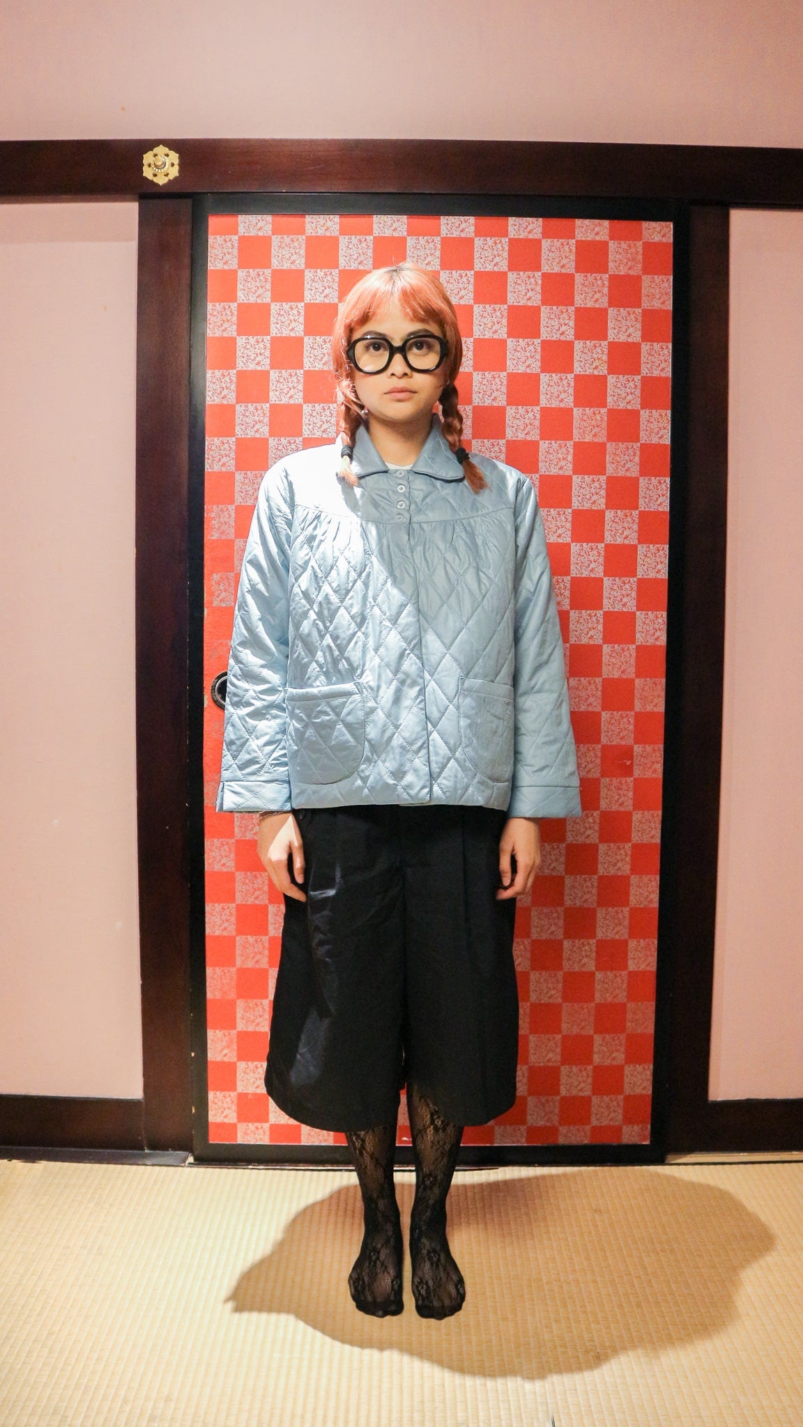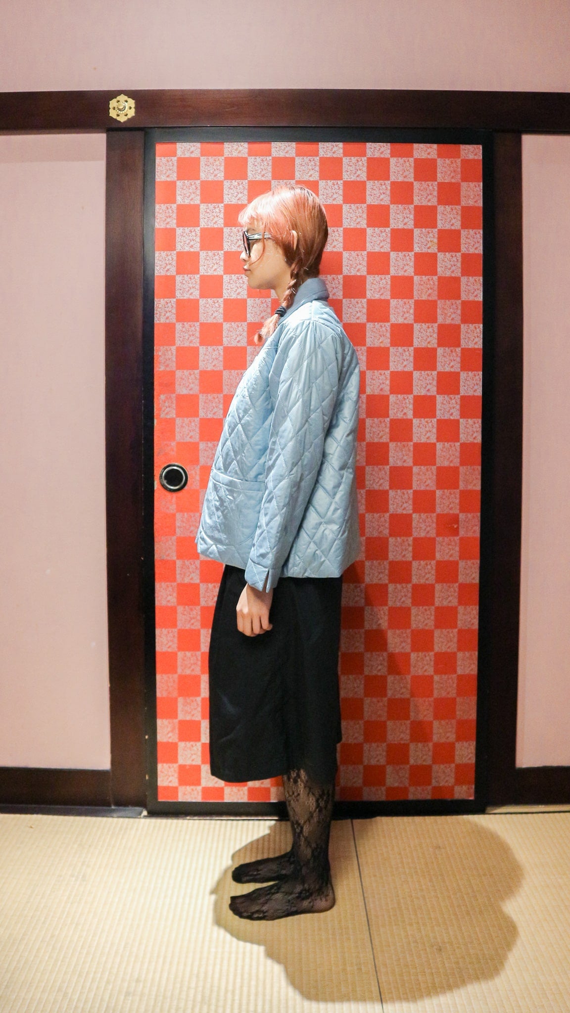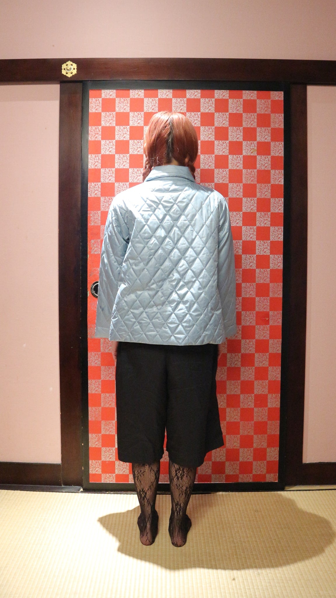 Diamond-quilted jacket from lightweight nylon fabric. Feature four shirt buttons and two patch pockets. Rounded flat collar.