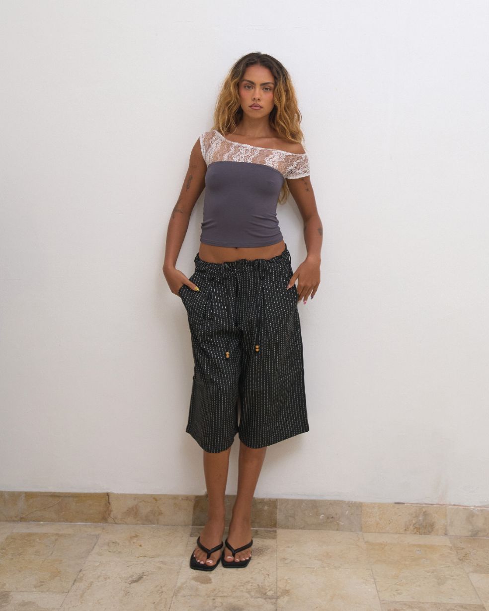 Fitted bandeau top with asymmetrical neckline and dropped shoulder on one side.